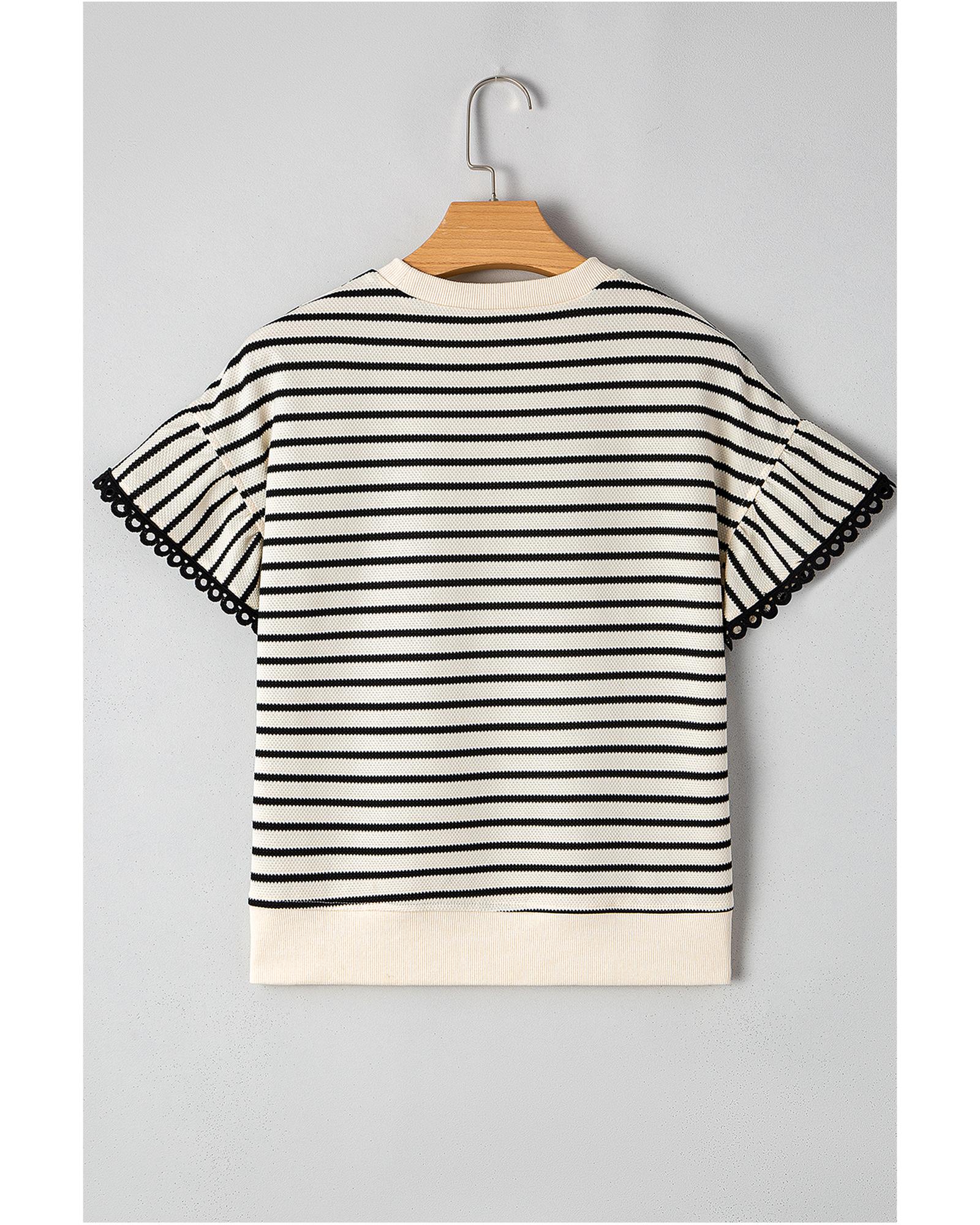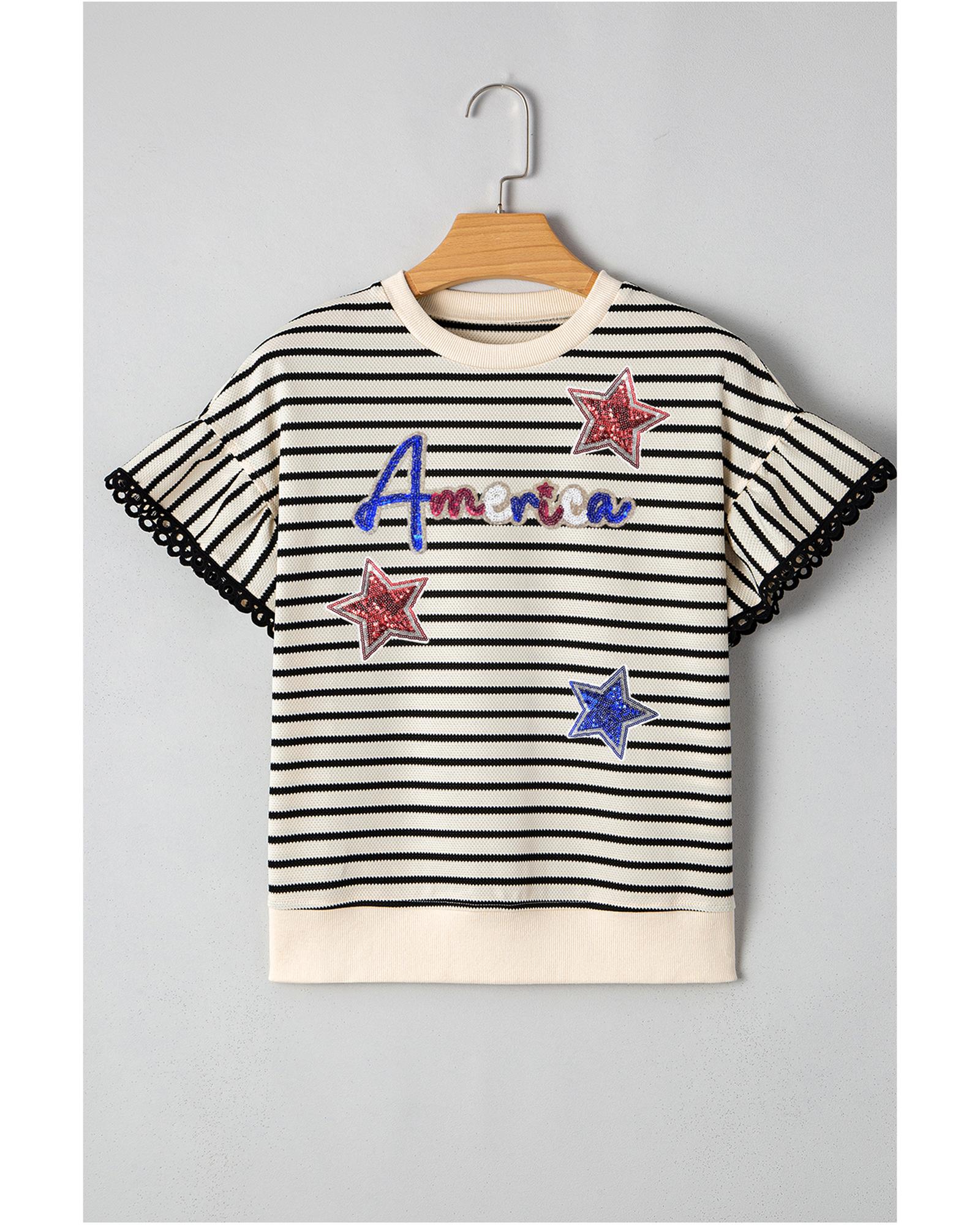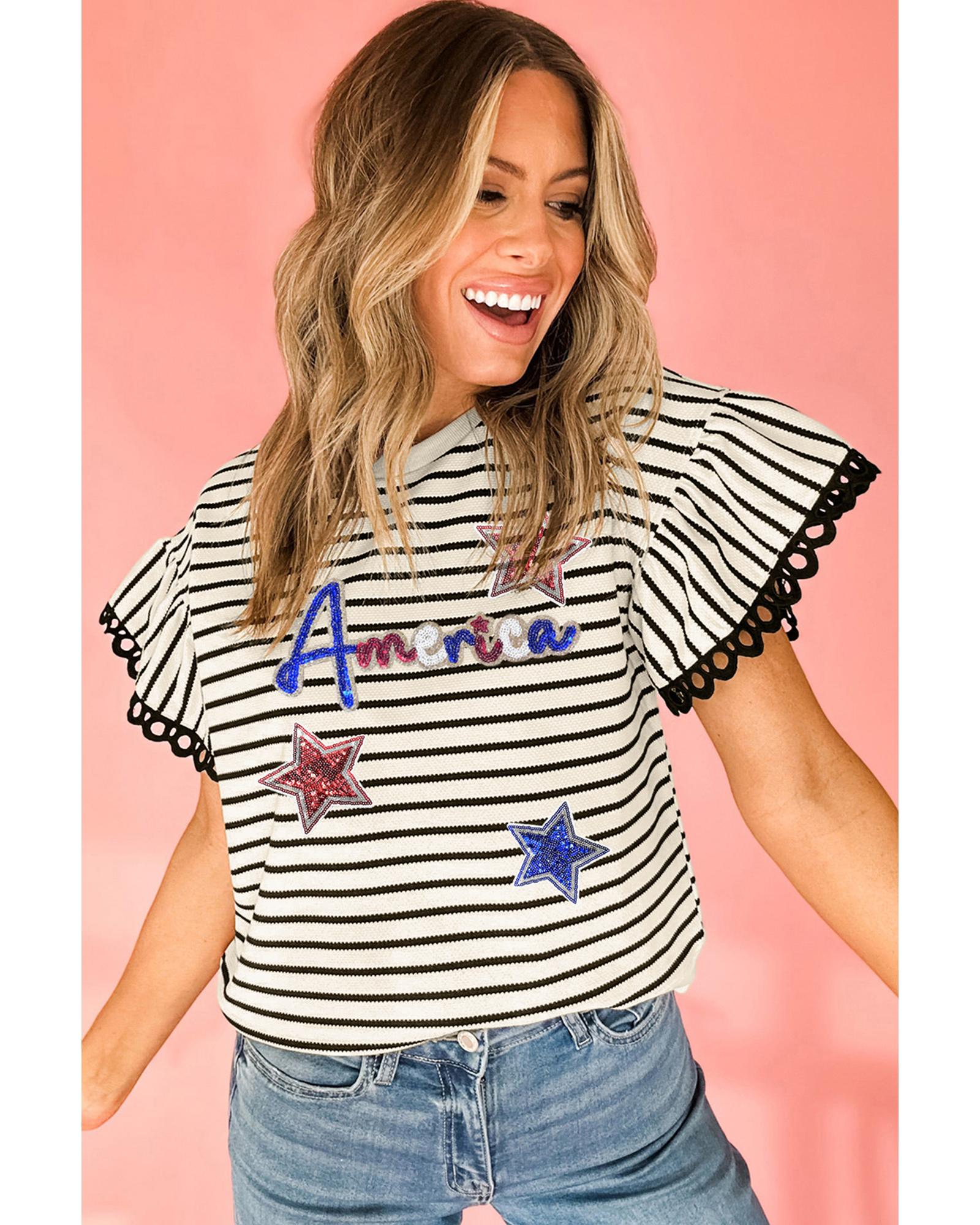 Black Stripe Sequin America Star Graphic Ric Rac Flutter Sleeve Blouse – S