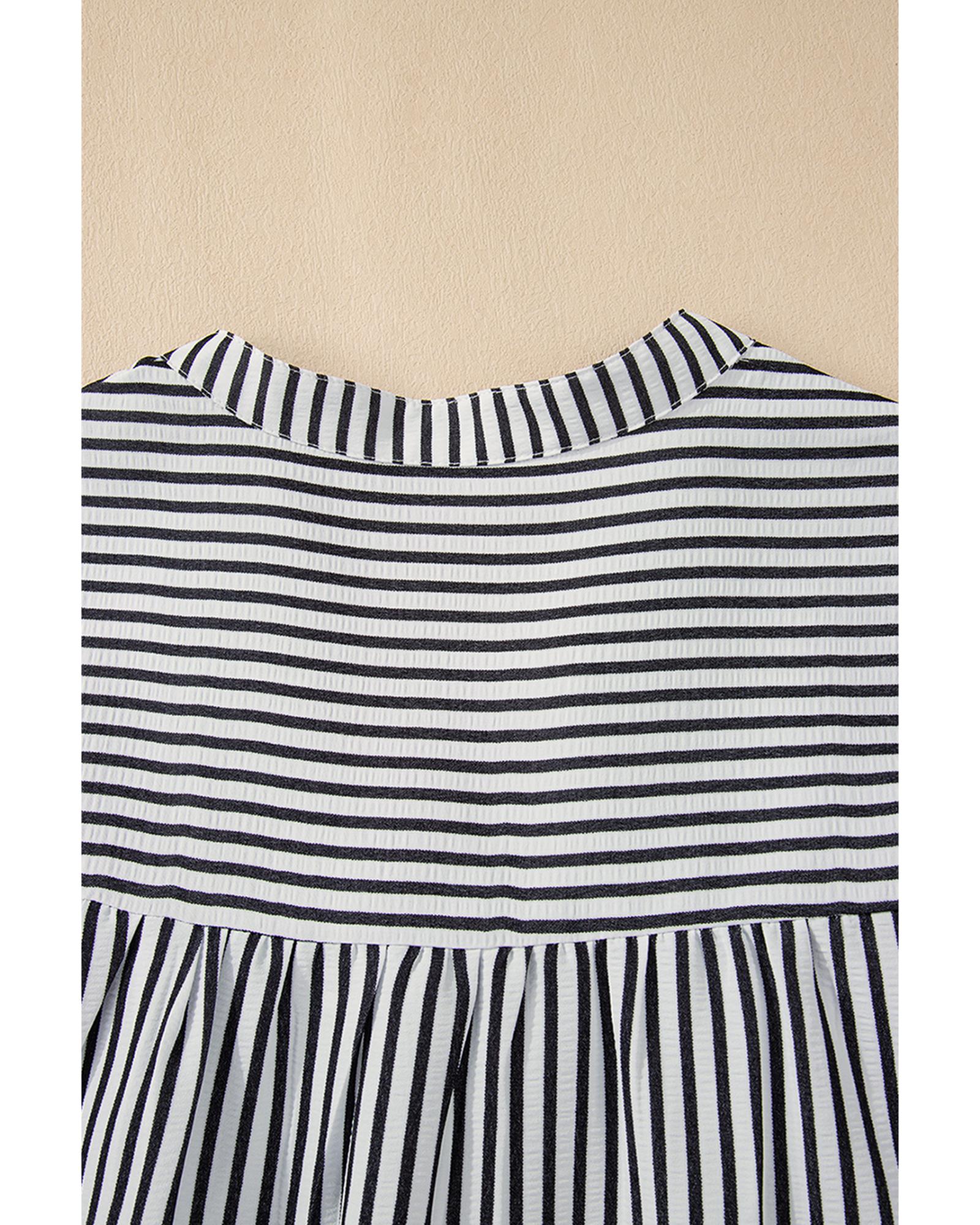 Black Stripe Short Sleeve Buttoned V Neck Pocketed Plus Size Mini Dress – 3X