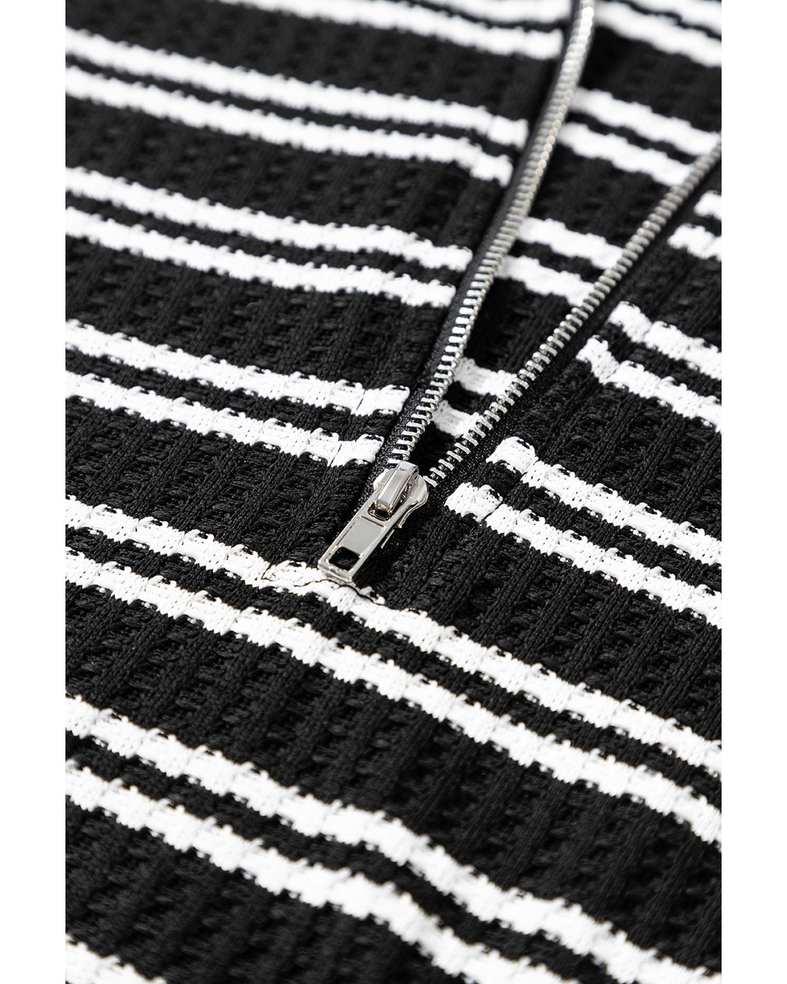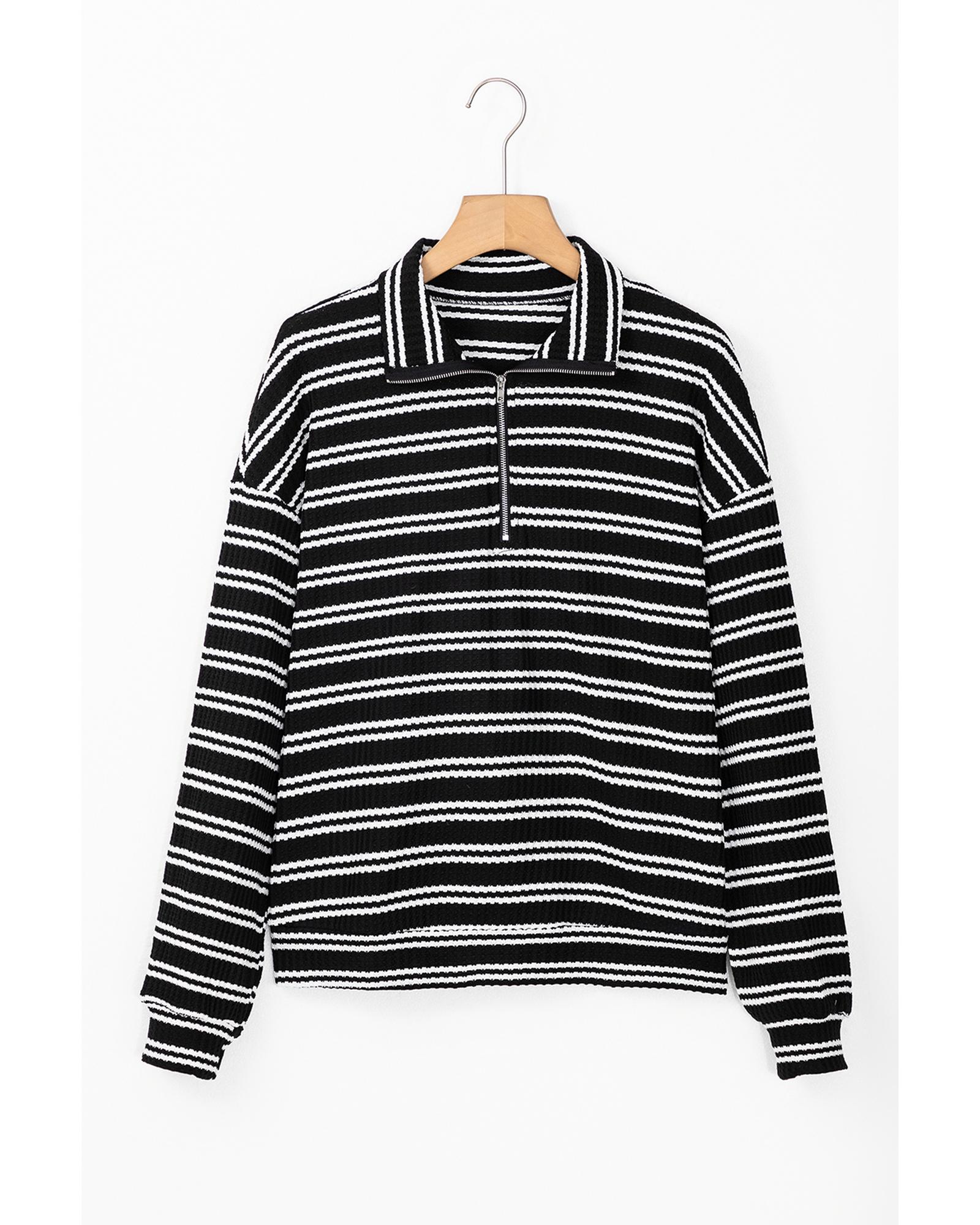 Black Stripe Textured Quarter Zip Collar Long Sleeve Top – L