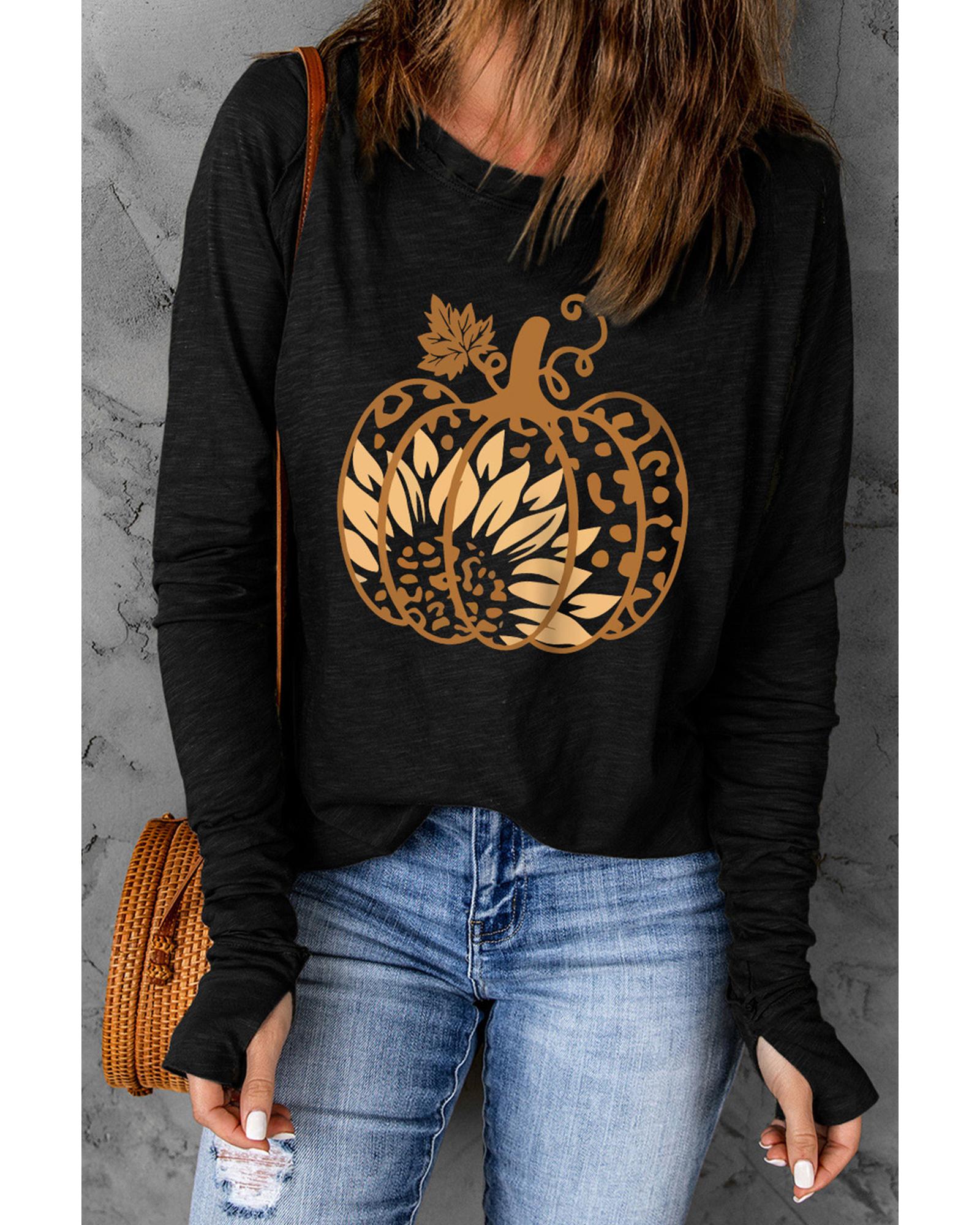Black Sunflower Pumpkin Graphic Thumbhole Sleeve Top – S