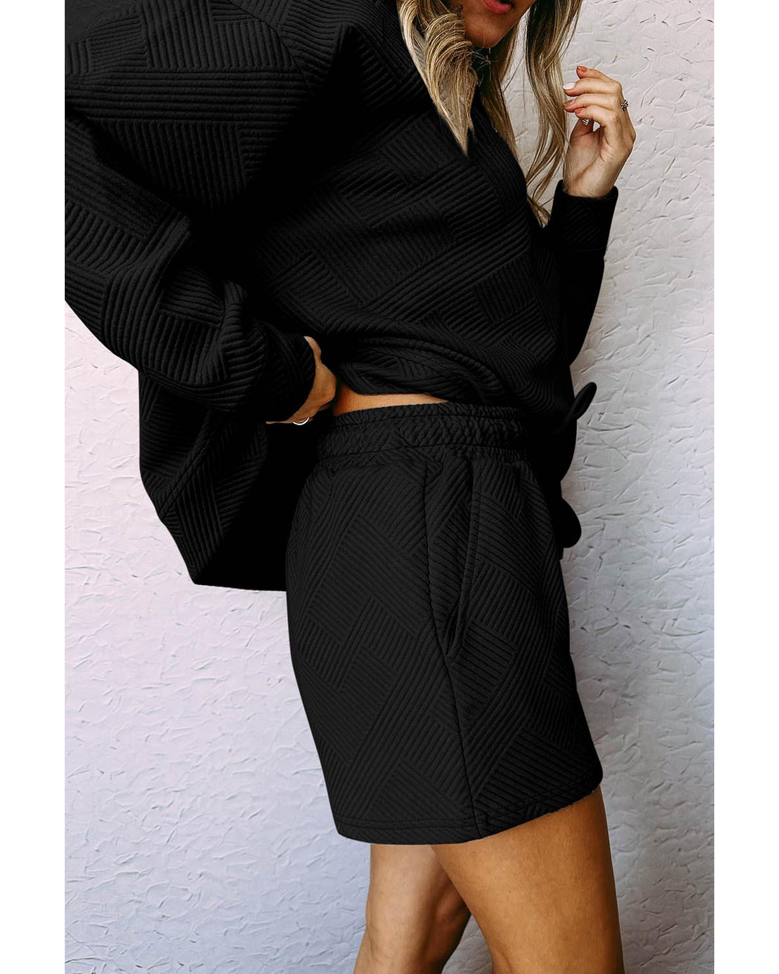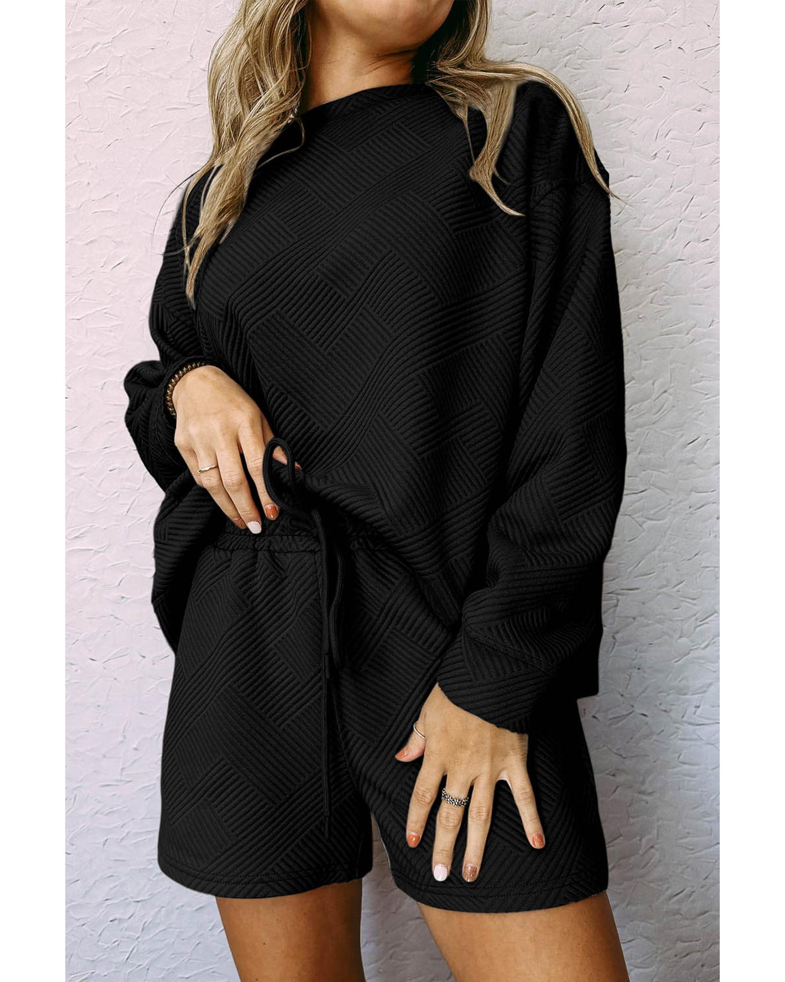 Black Textured Long Sleeve Top and Drawstring Shorts Set - L