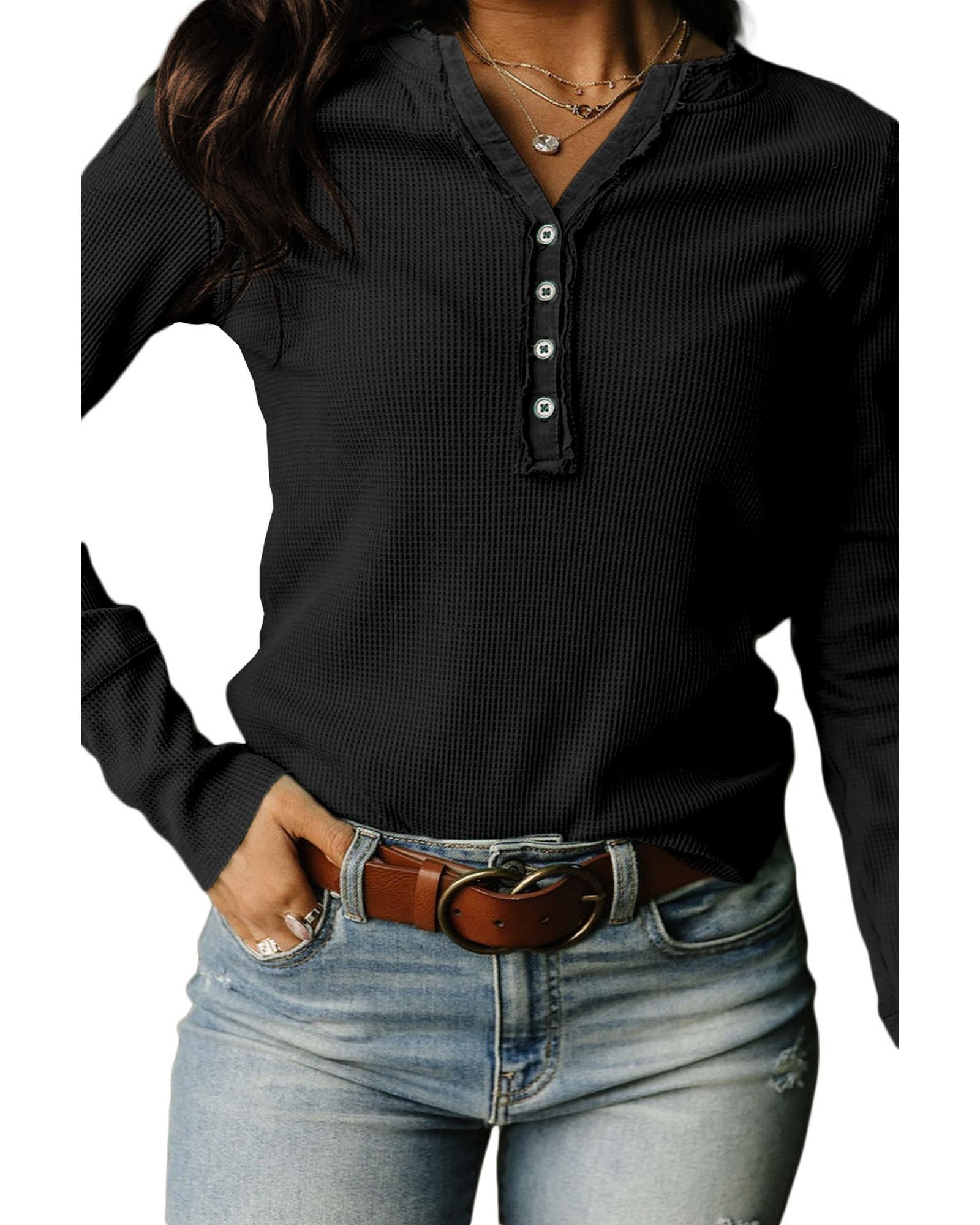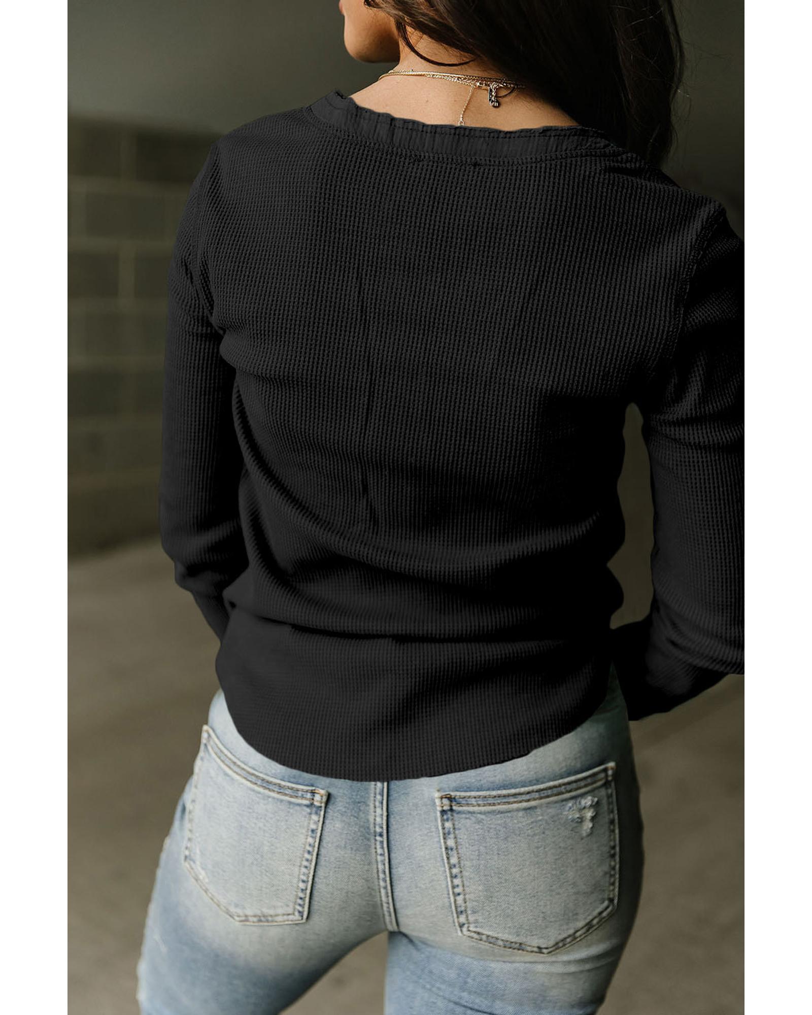 Black Trimmed Neckline Waffle Knit Henley Top – XL
