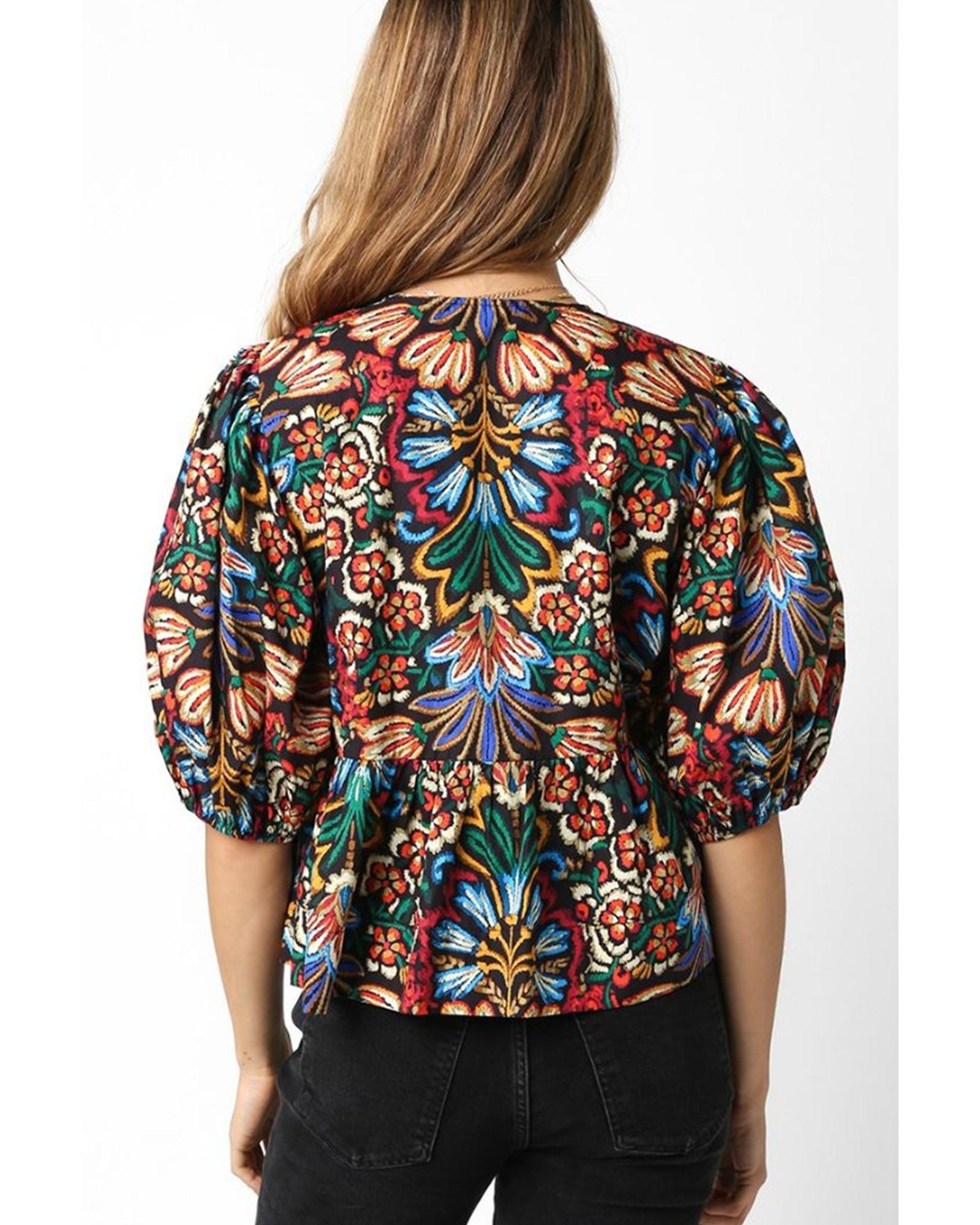 - Tropical print adds a touch of exotic flair to the blouse