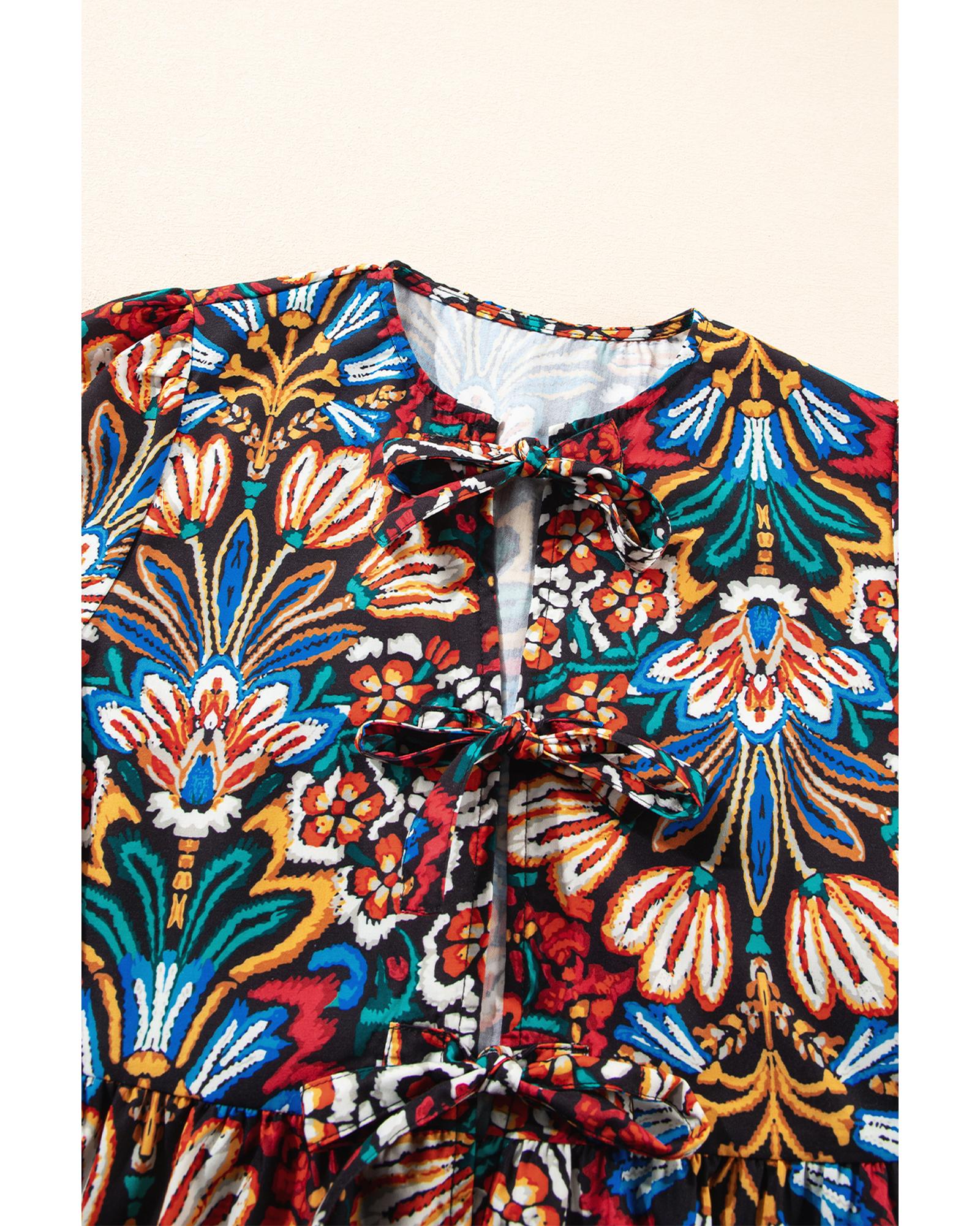 Black Tropical Print Bubble Sleeve Knot Front Blouse – S