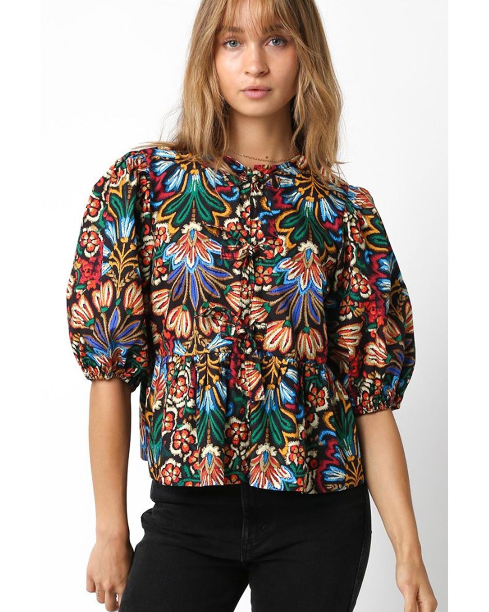 • Tropical print adds a touch of exotic flair to the blouse