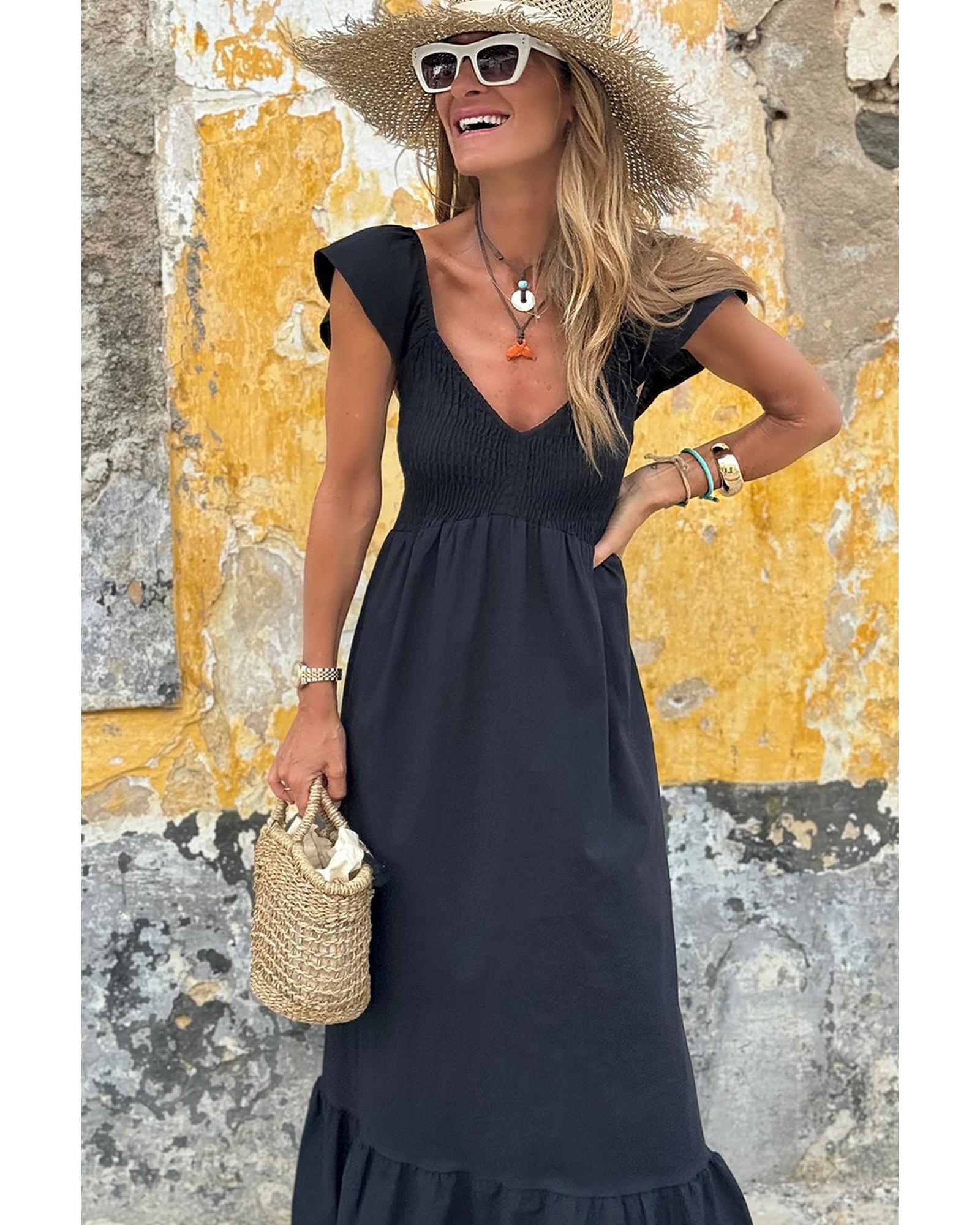 Black V Neck Flutter Sleeve Smocked Bodice High Waist Ruffle Maxi Dress – XL
