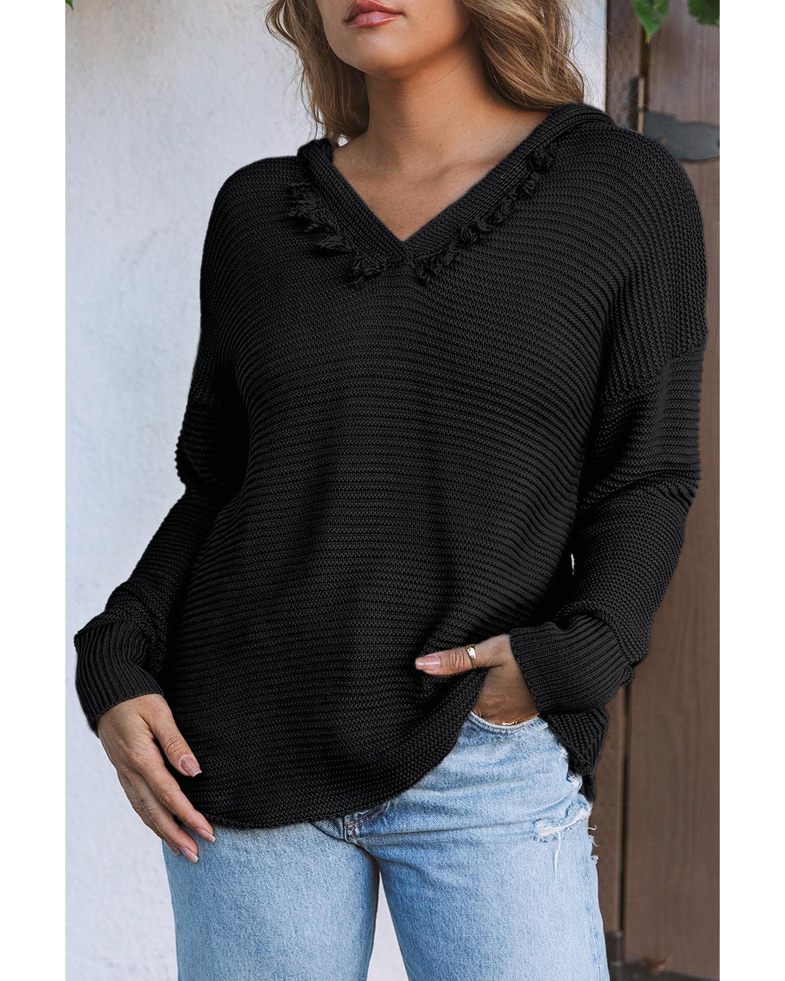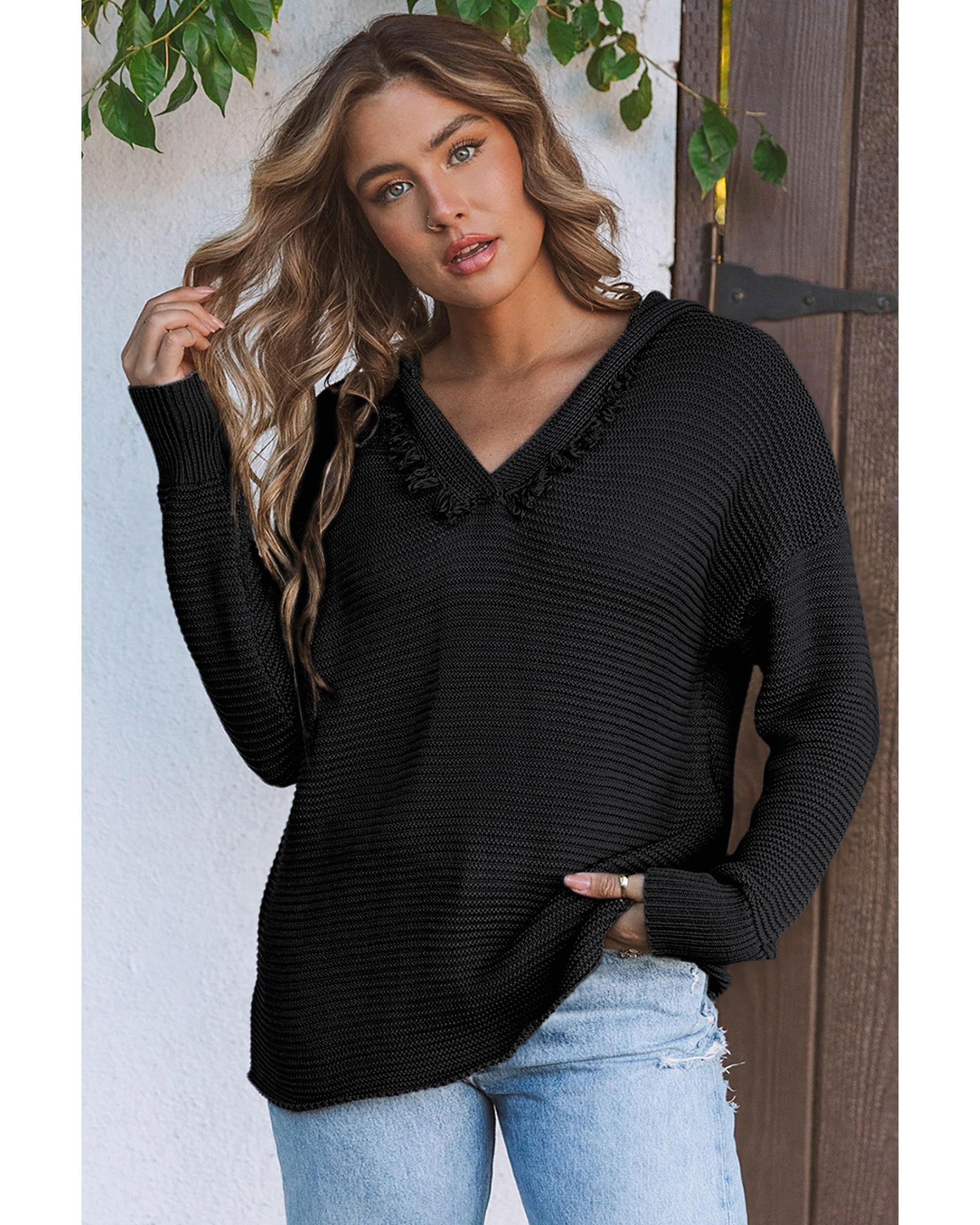 Black V Neck Ribbed Drop Shoulder Hooded Sweater – 2XL