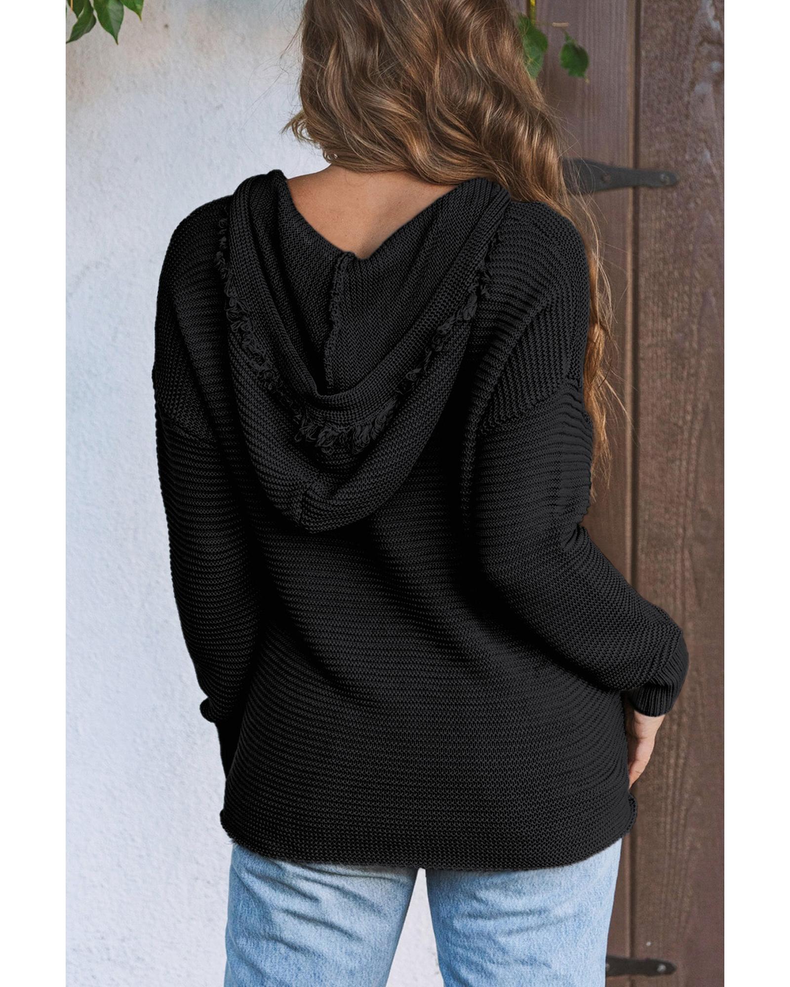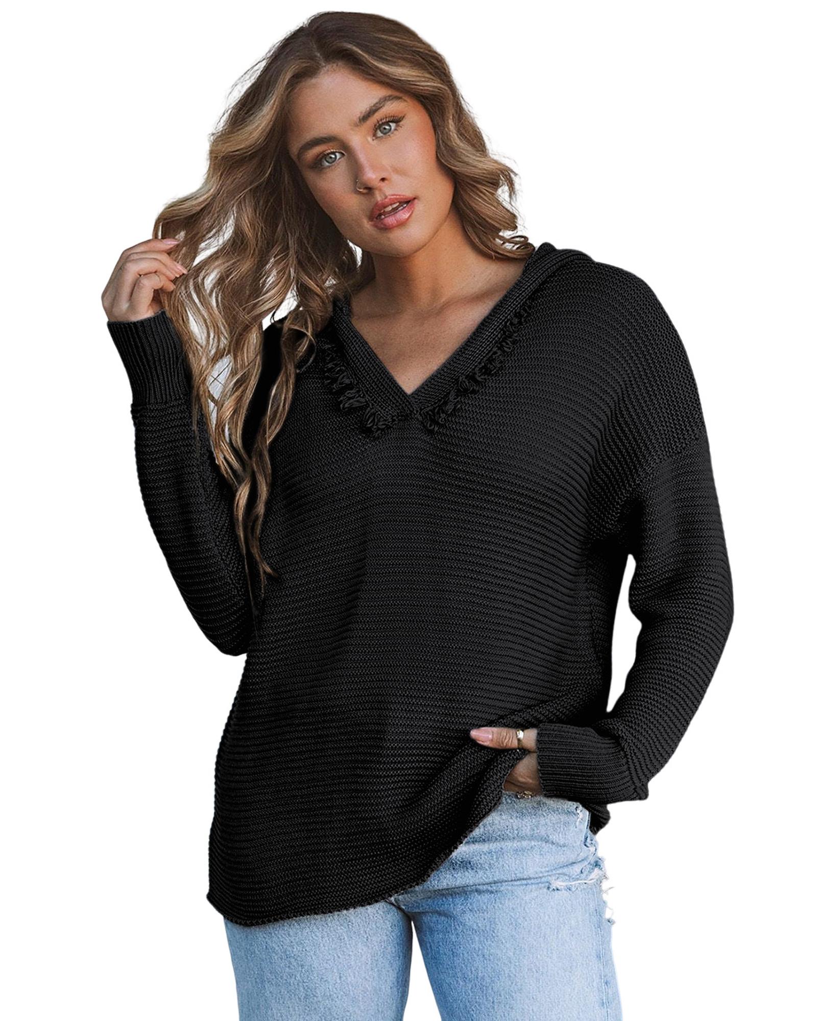 Black V Neck Ribbed Drop Shoulder Hooded Sweater – XL