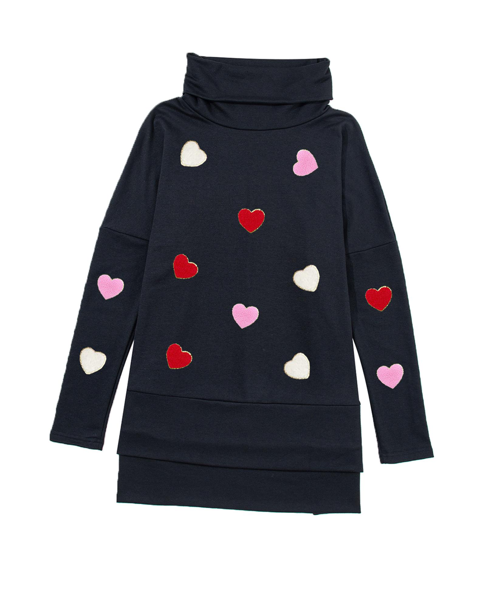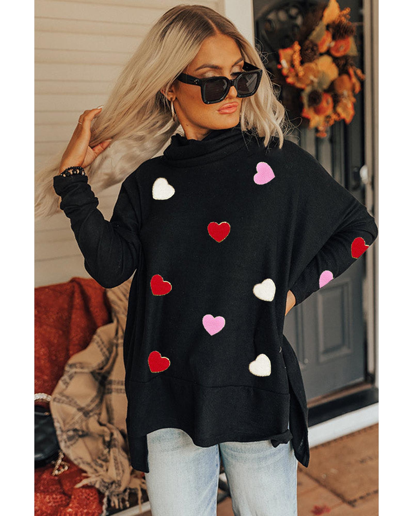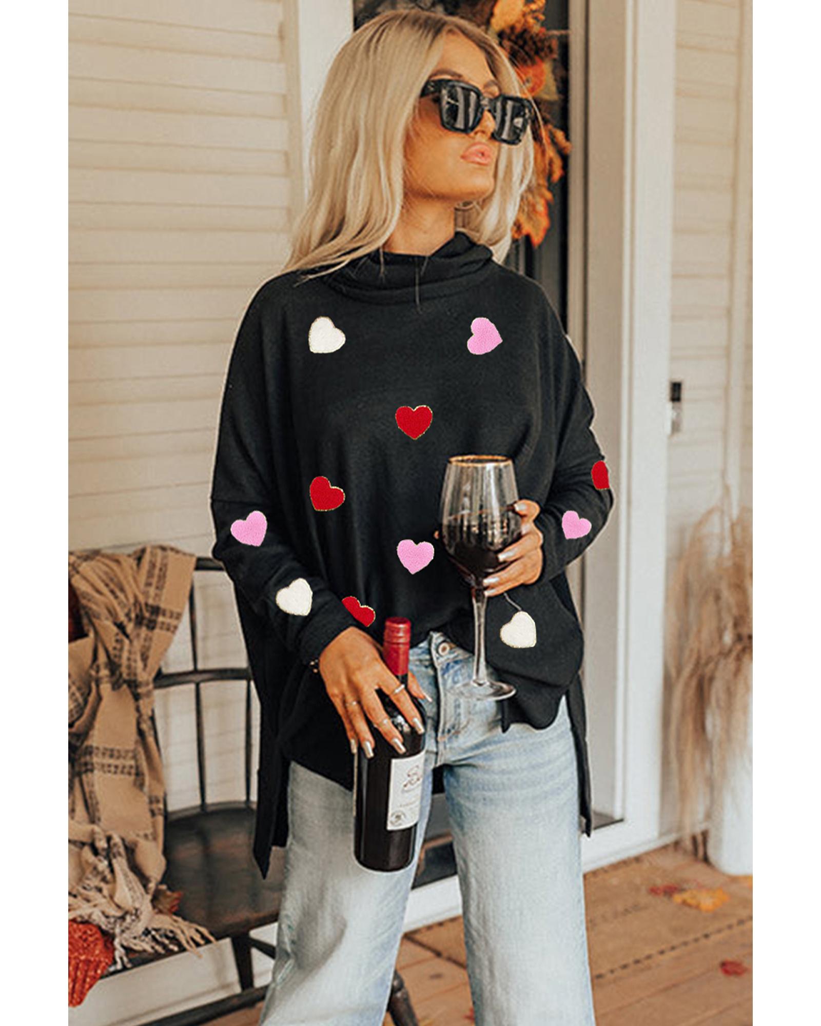 - Black Valentines Chenille Heart Patched Dolman Sleeve High Neck Split Top