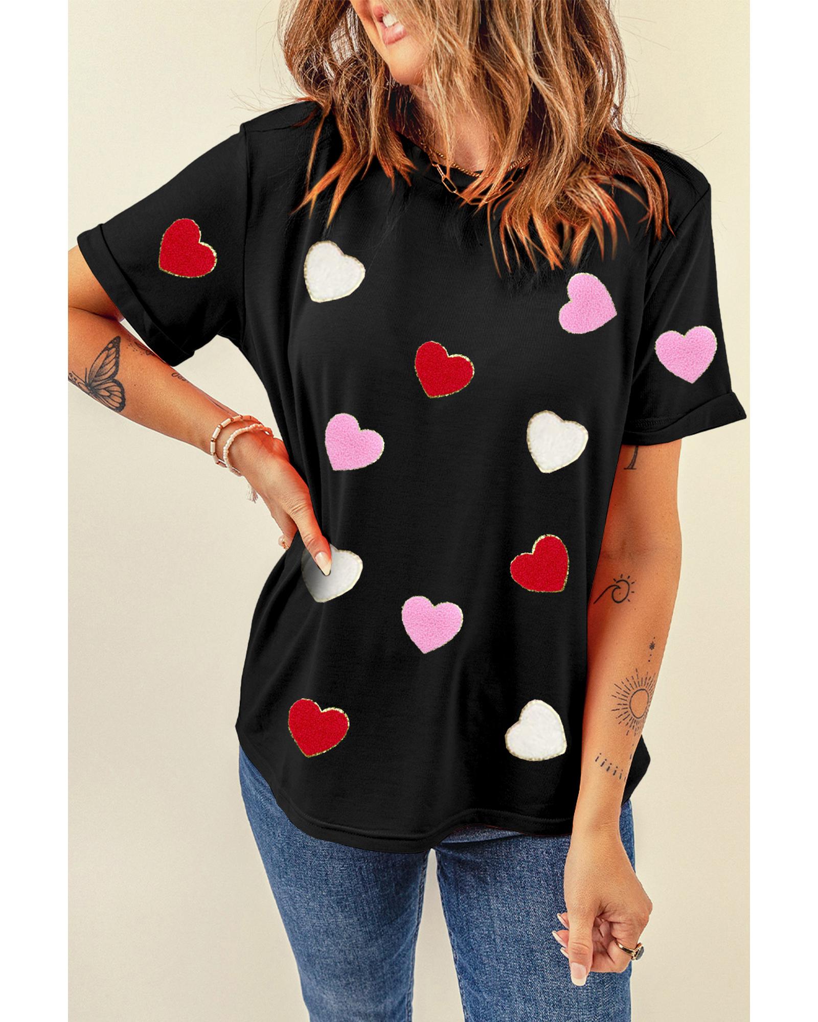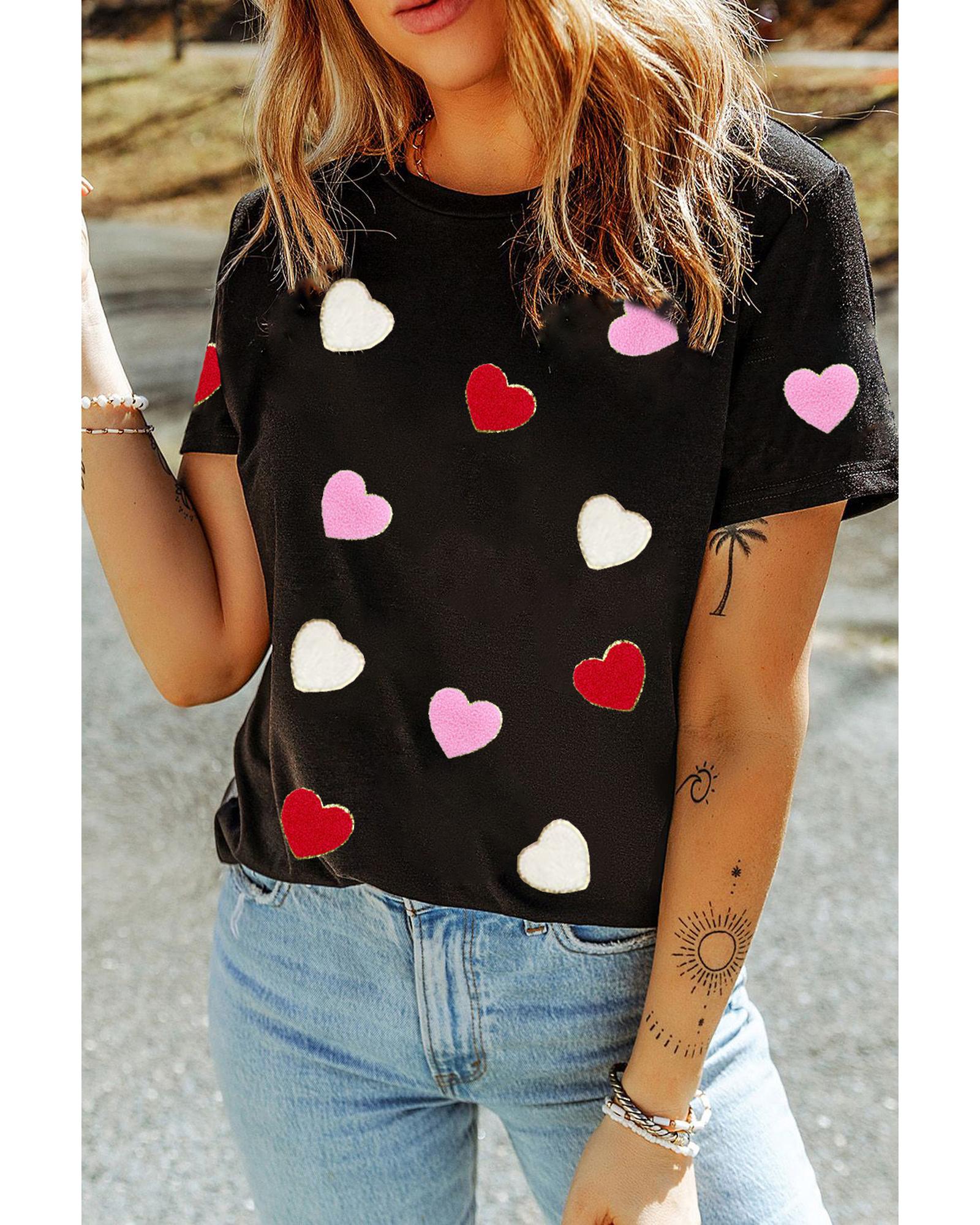 Black Valentines Chenille Heart Patched Pattern Crewneck Tee – S