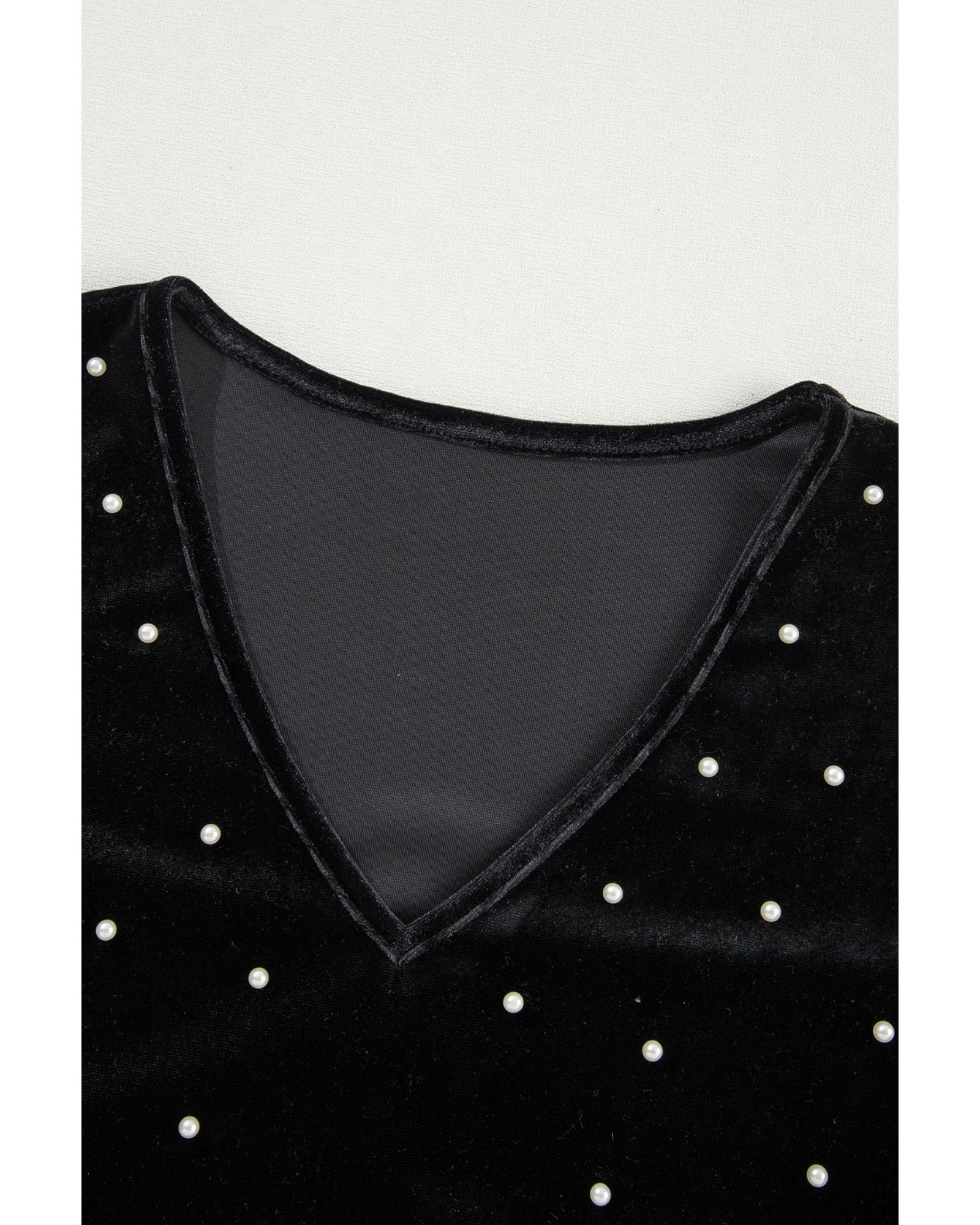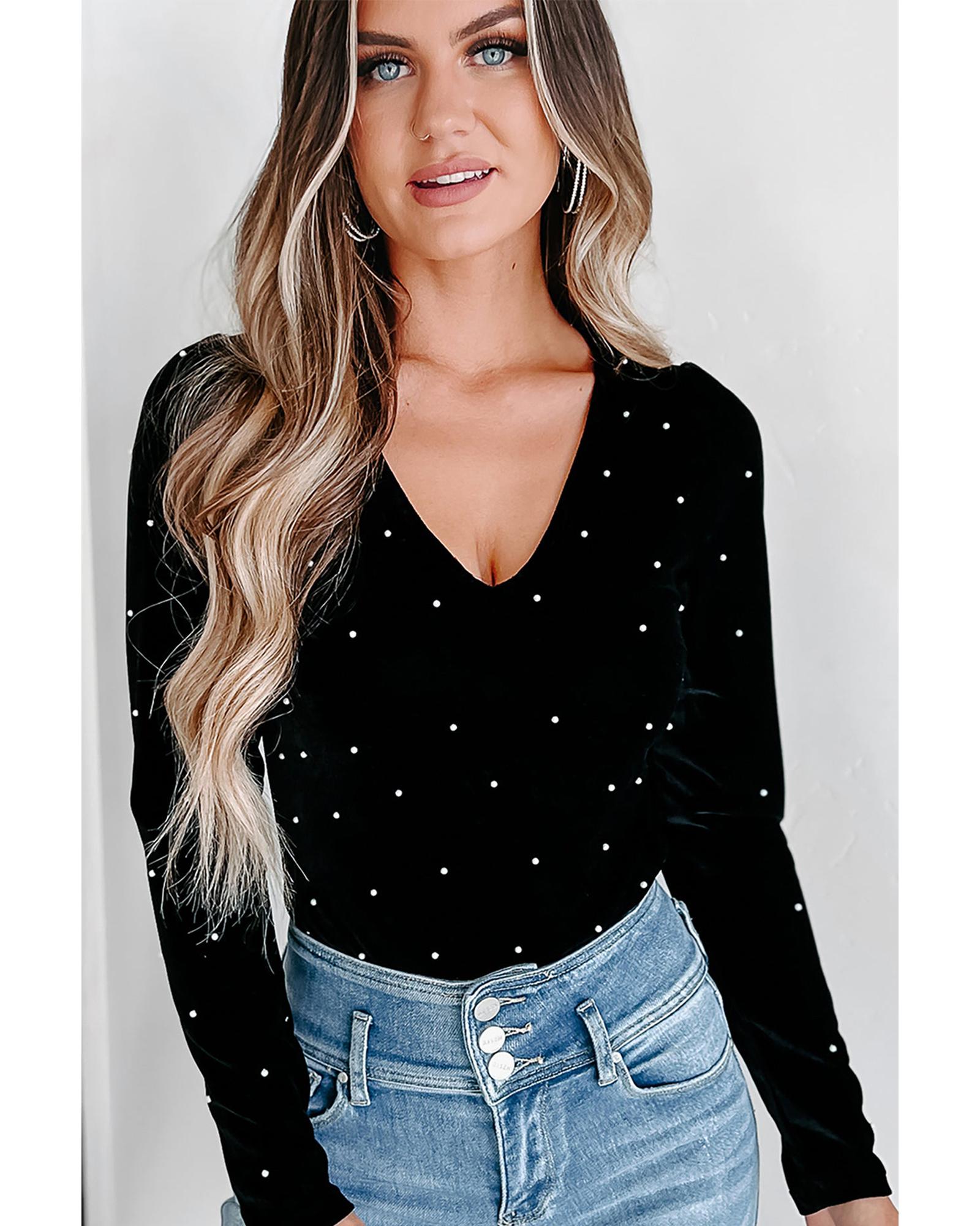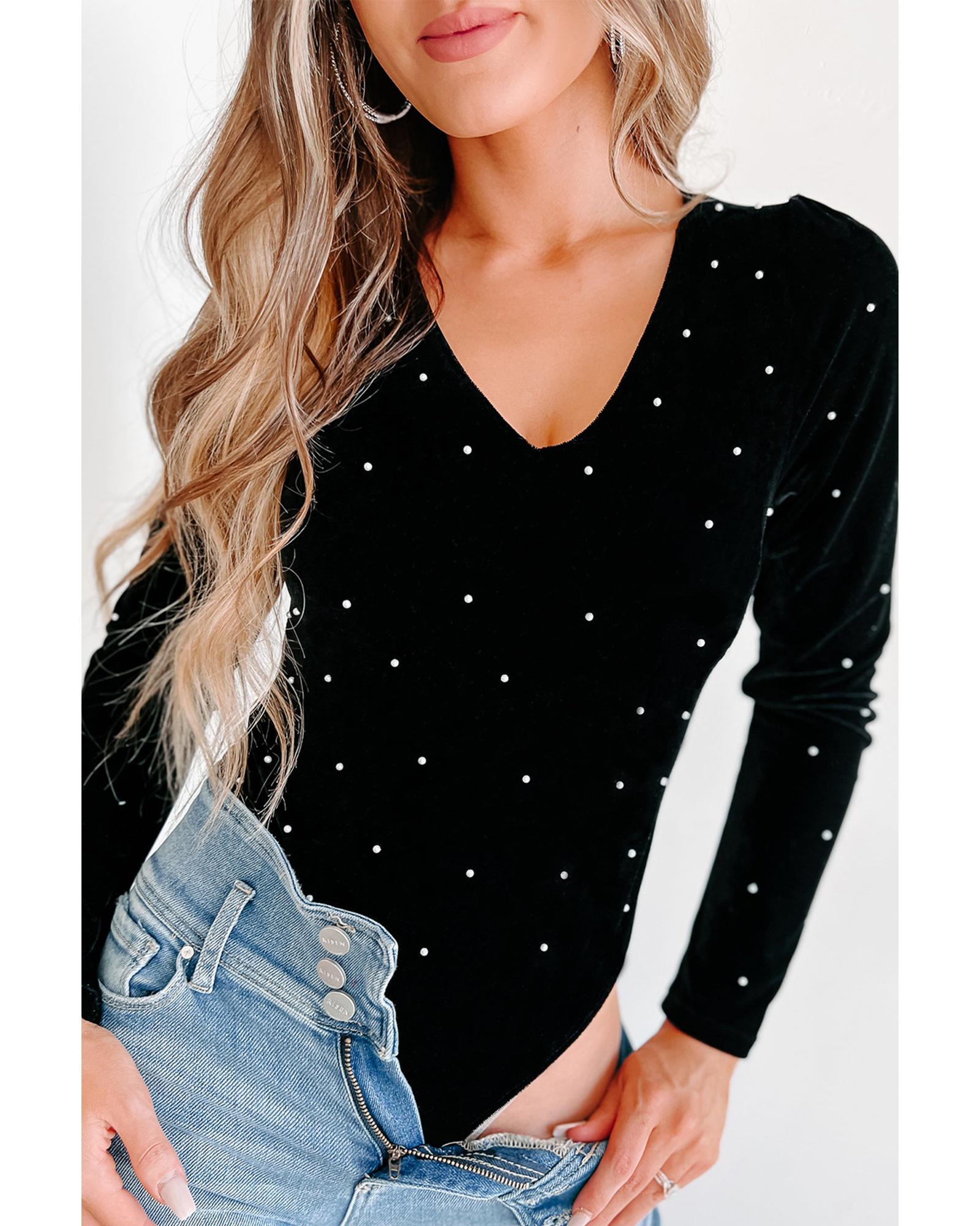 Black Velvet Beaded Long Sleeve V Neck Bodysuit – S