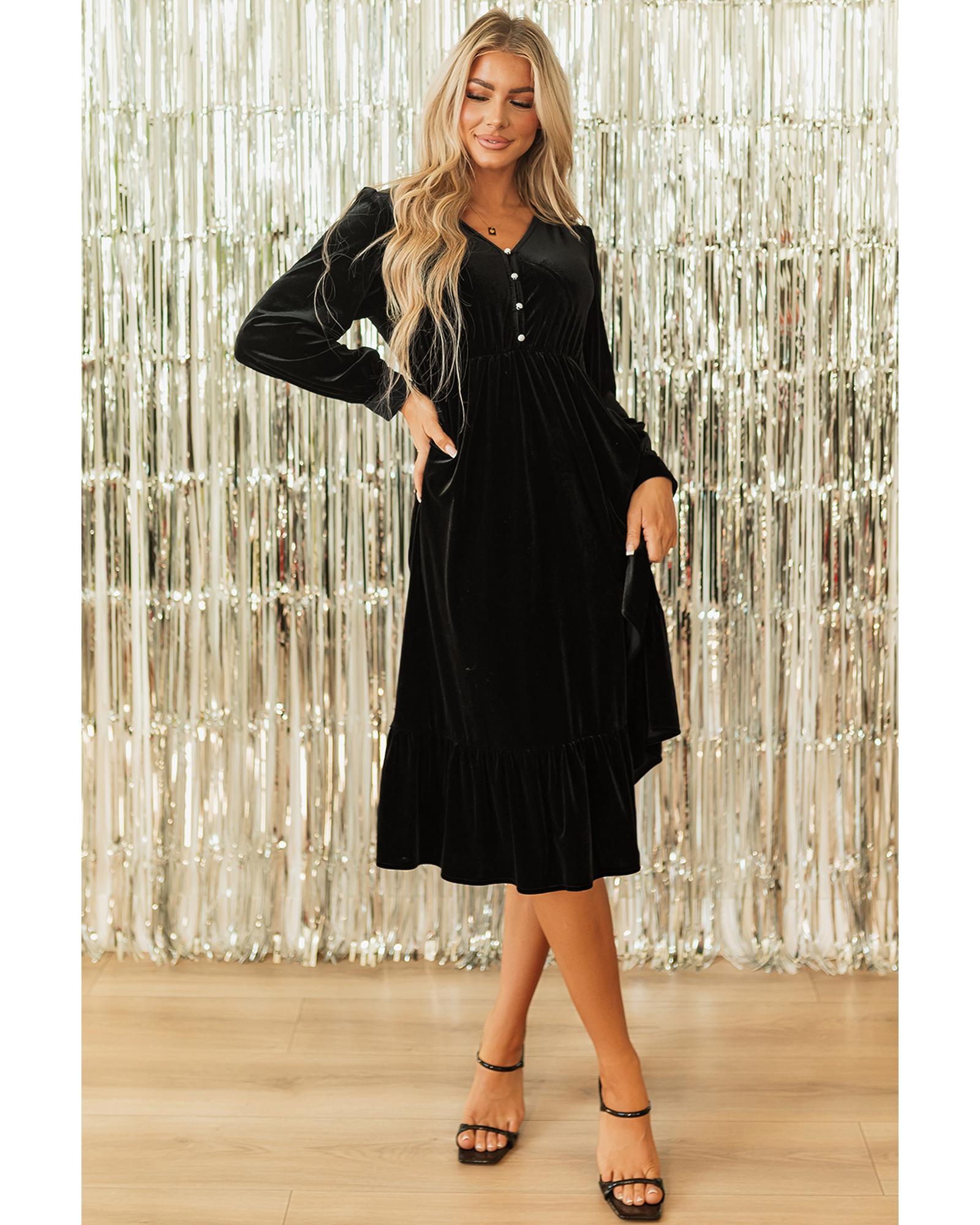 Black Velvet Buttoned Puff Sleeve V Neck Split Midi Dress – S