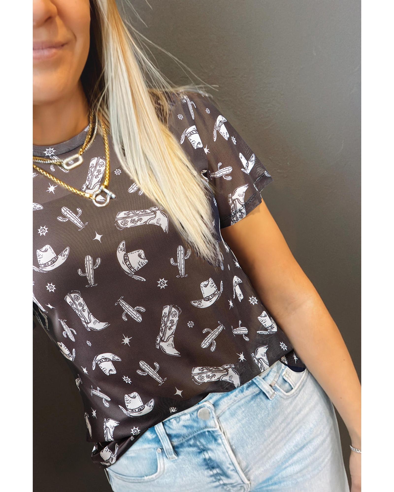 Black Western Pattern Mesh Sheer Crew Neck T Shirt – L