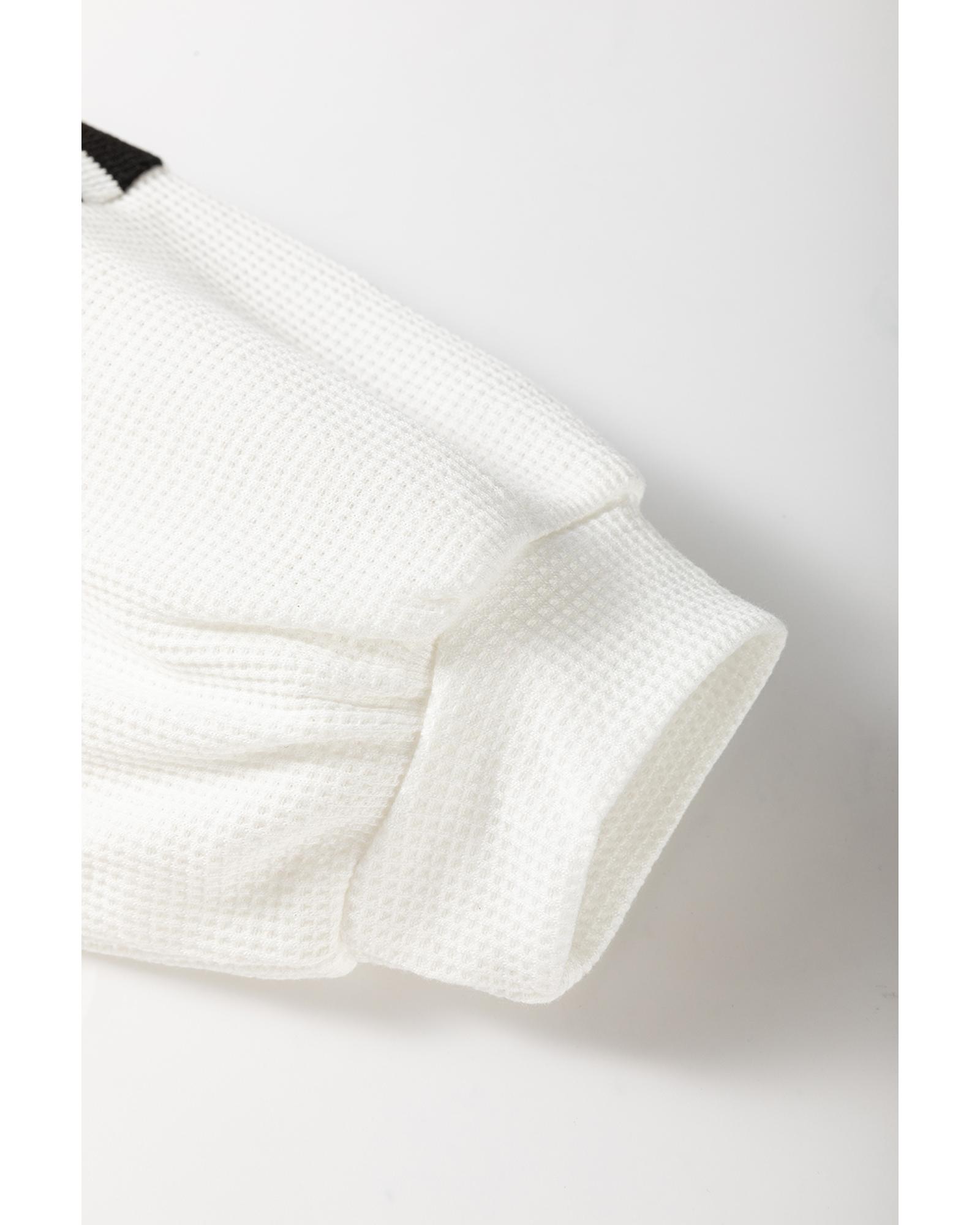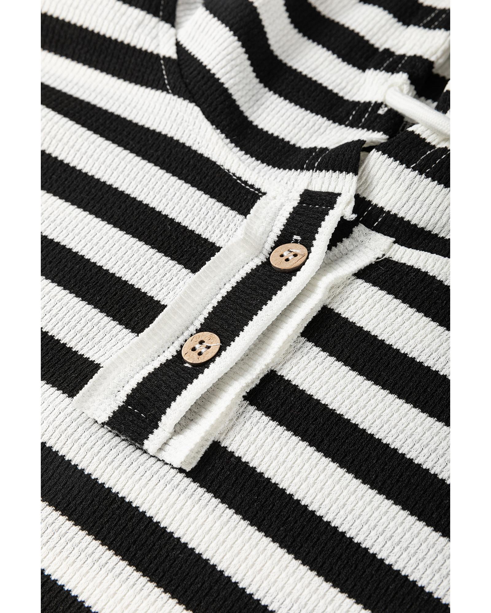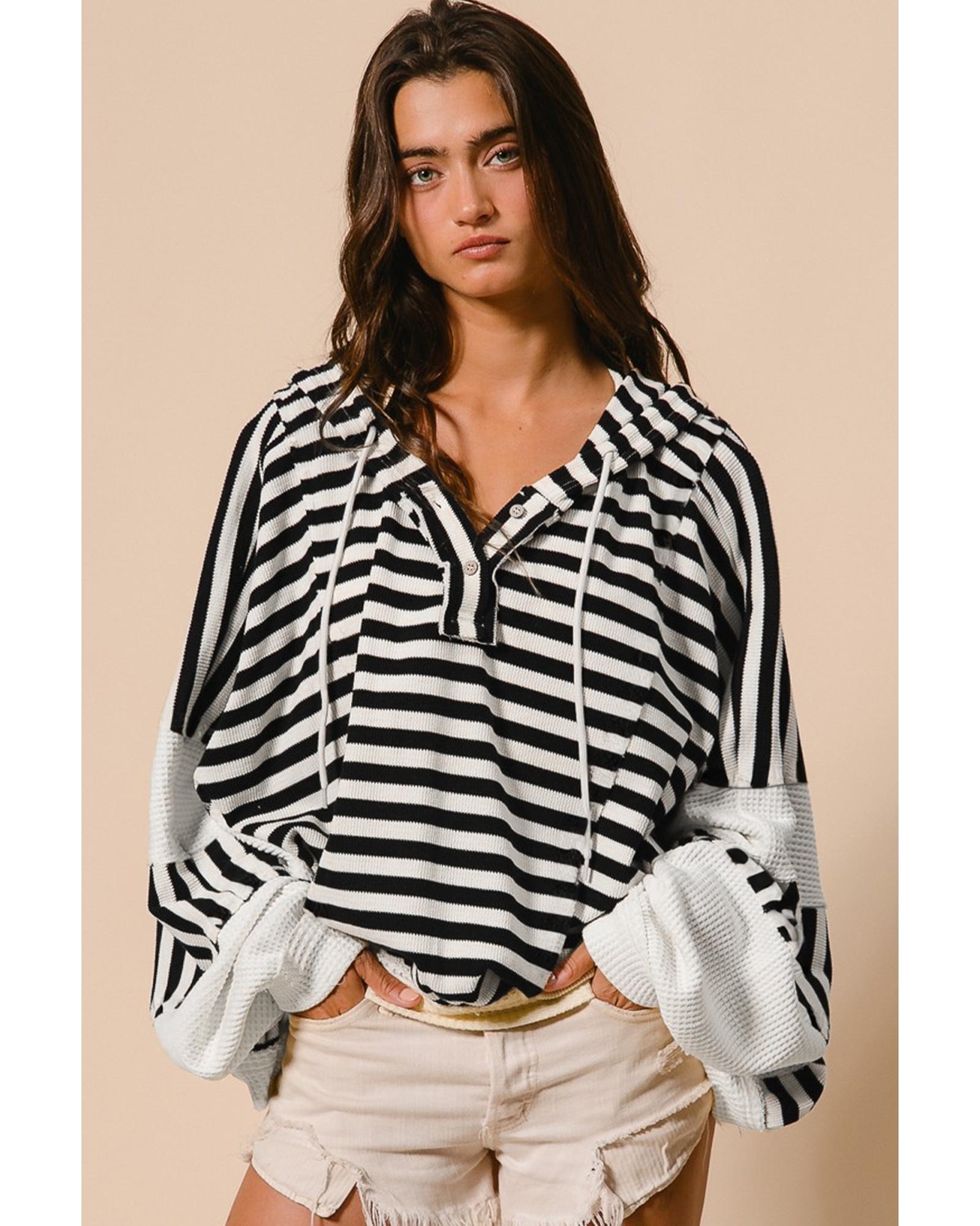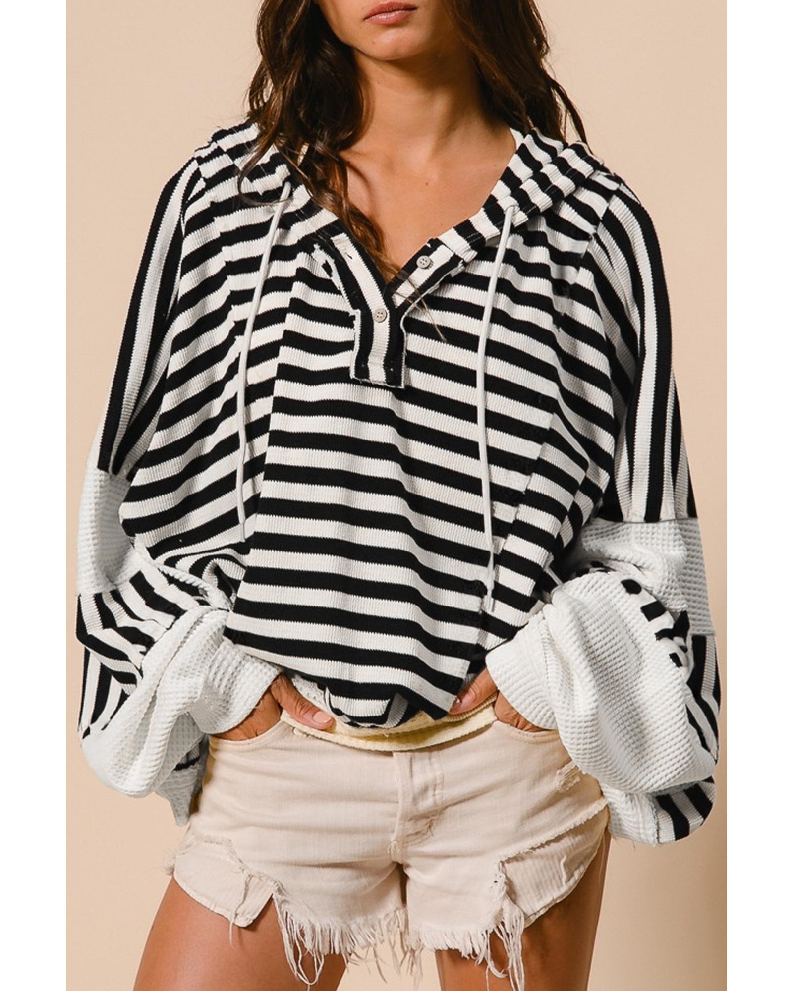 Black white Oversized Striped Henley Buttons Dolman Sleeve Hooded Top – XL