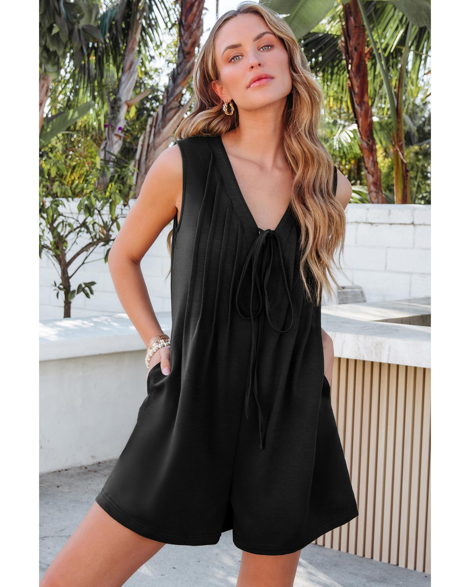 Black white Tie V Neck Pintuck Sleeveless Loose Romper – M