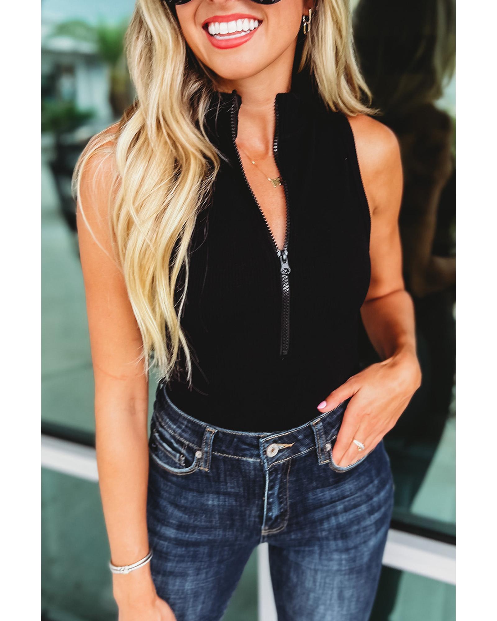 Black Zip up Mock Neck Ribbed Sleeveless Bodysuit – S