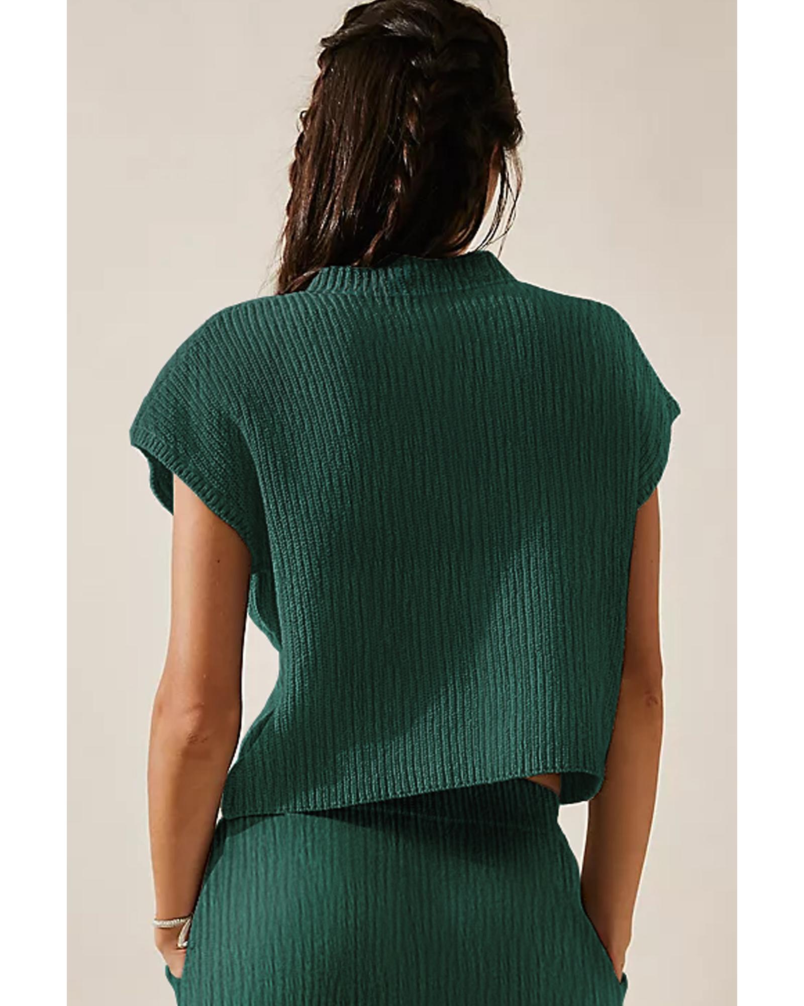 Blackish Green Chest Pocket V Neck Ribbed Cap Sleeve Sweater – M