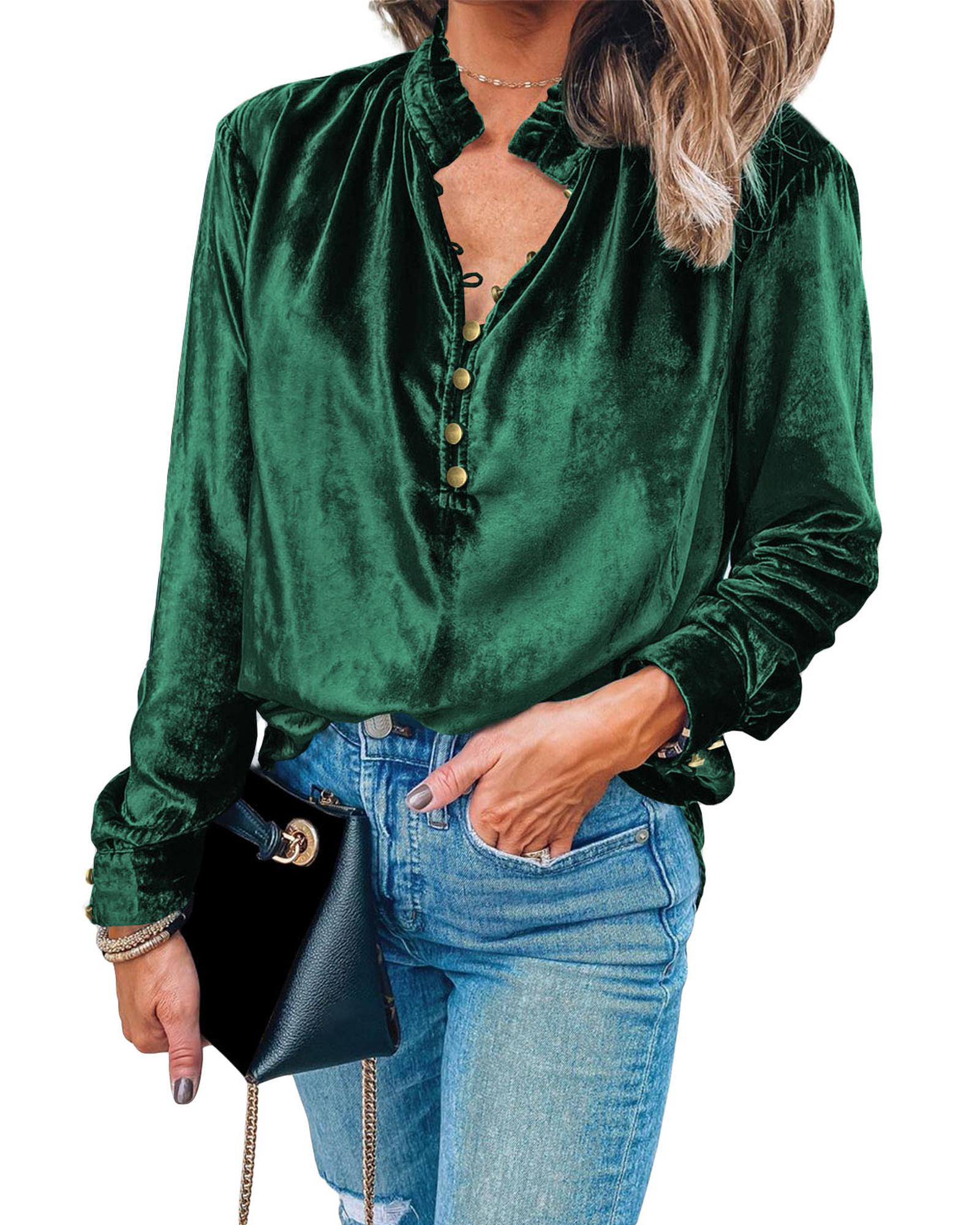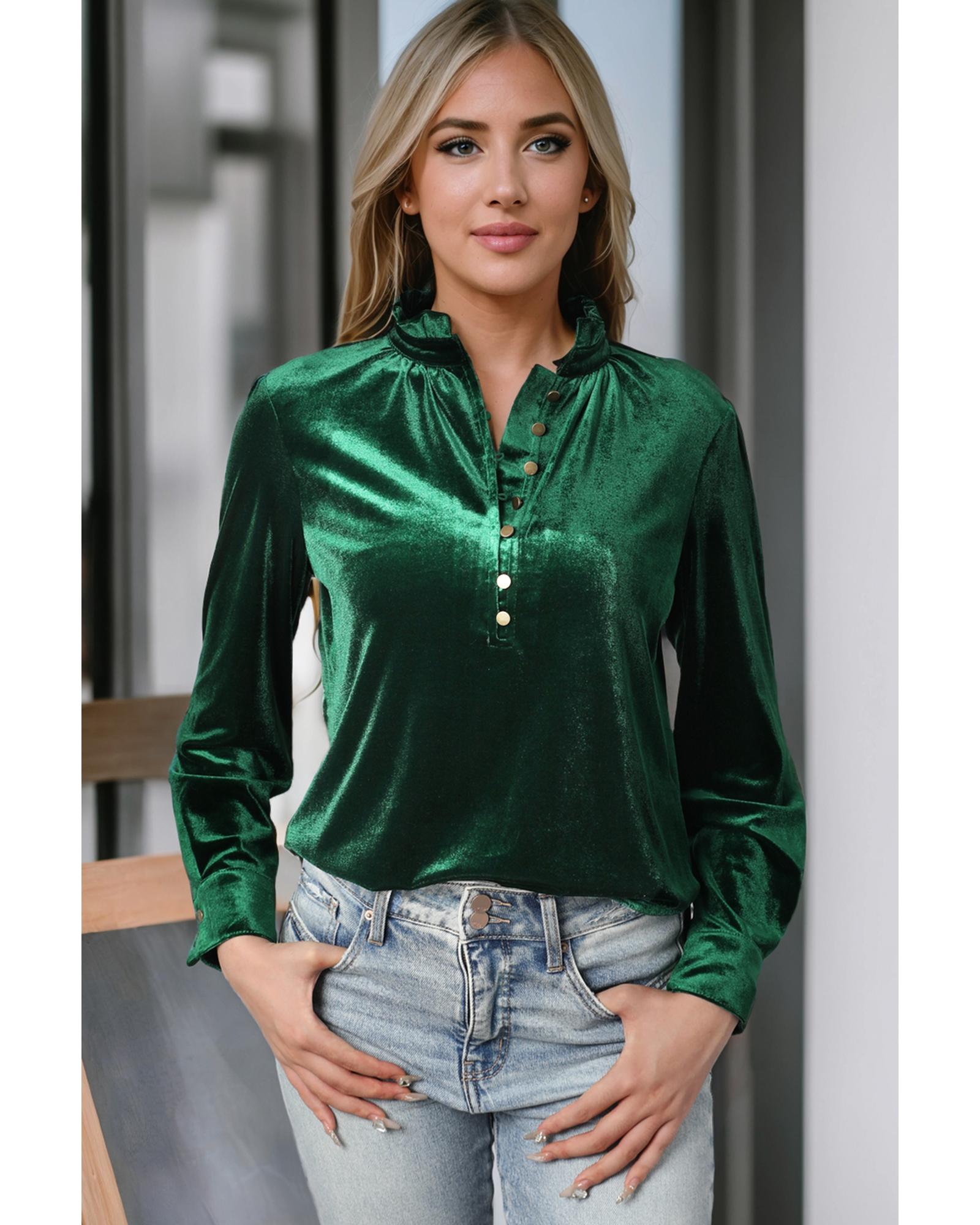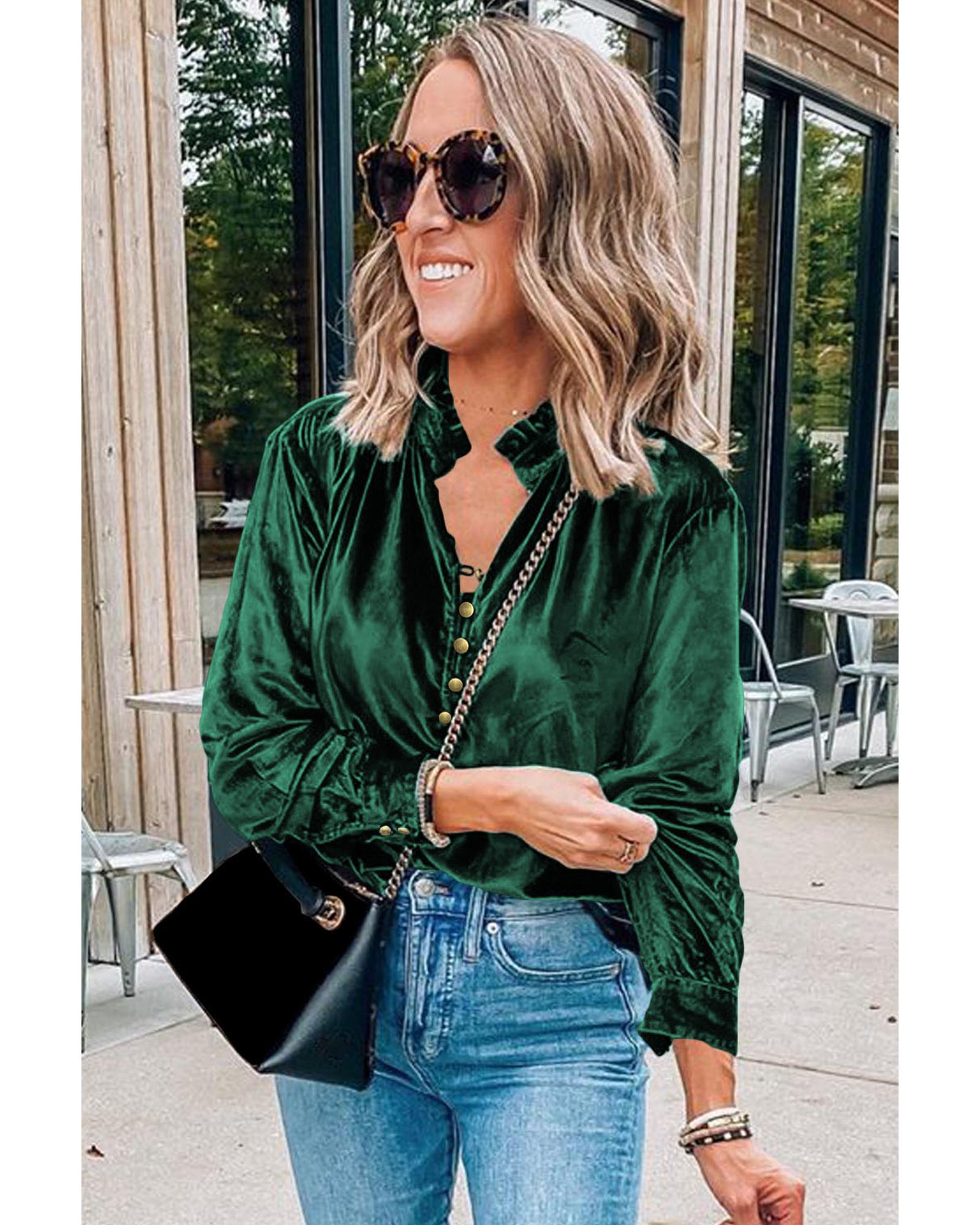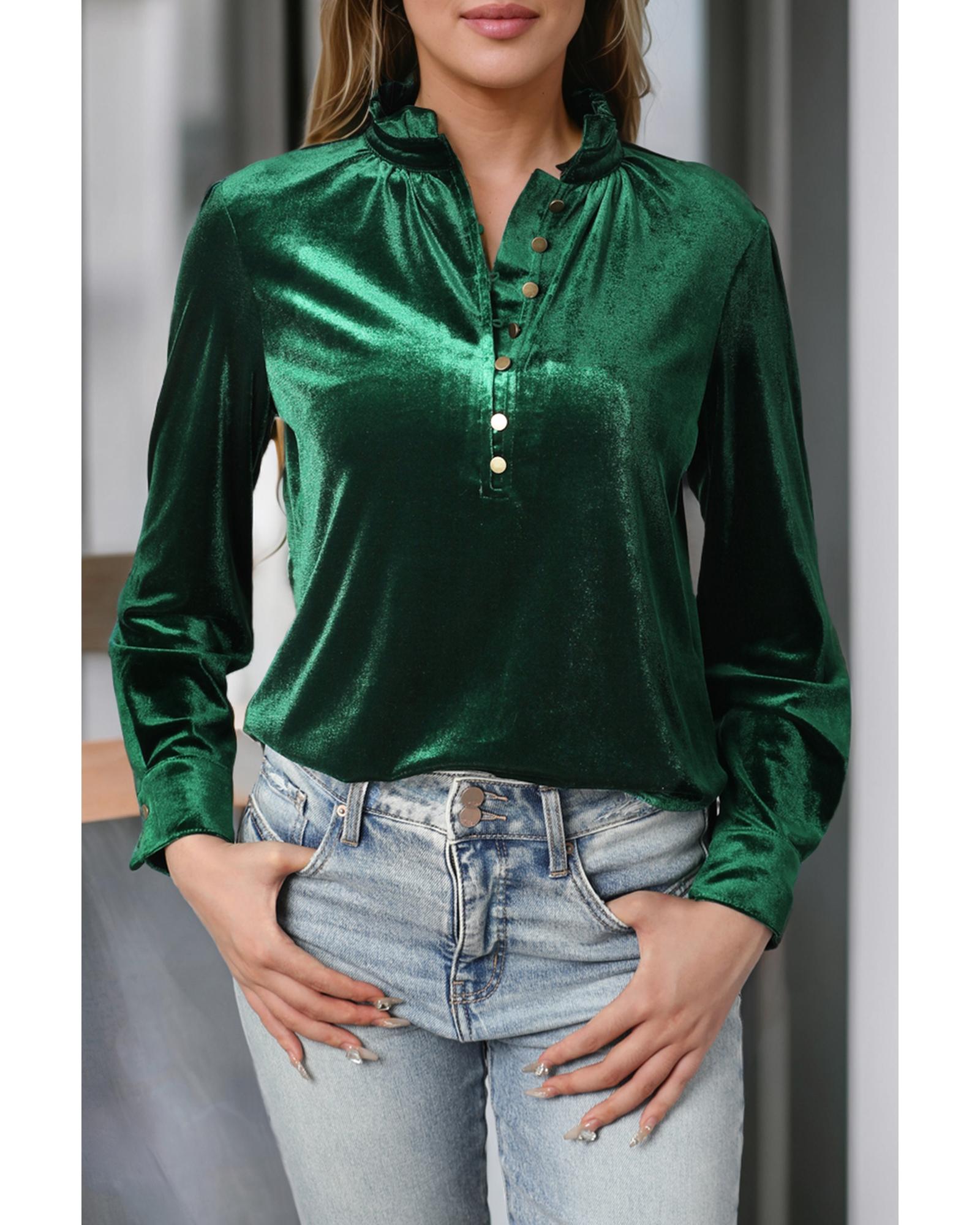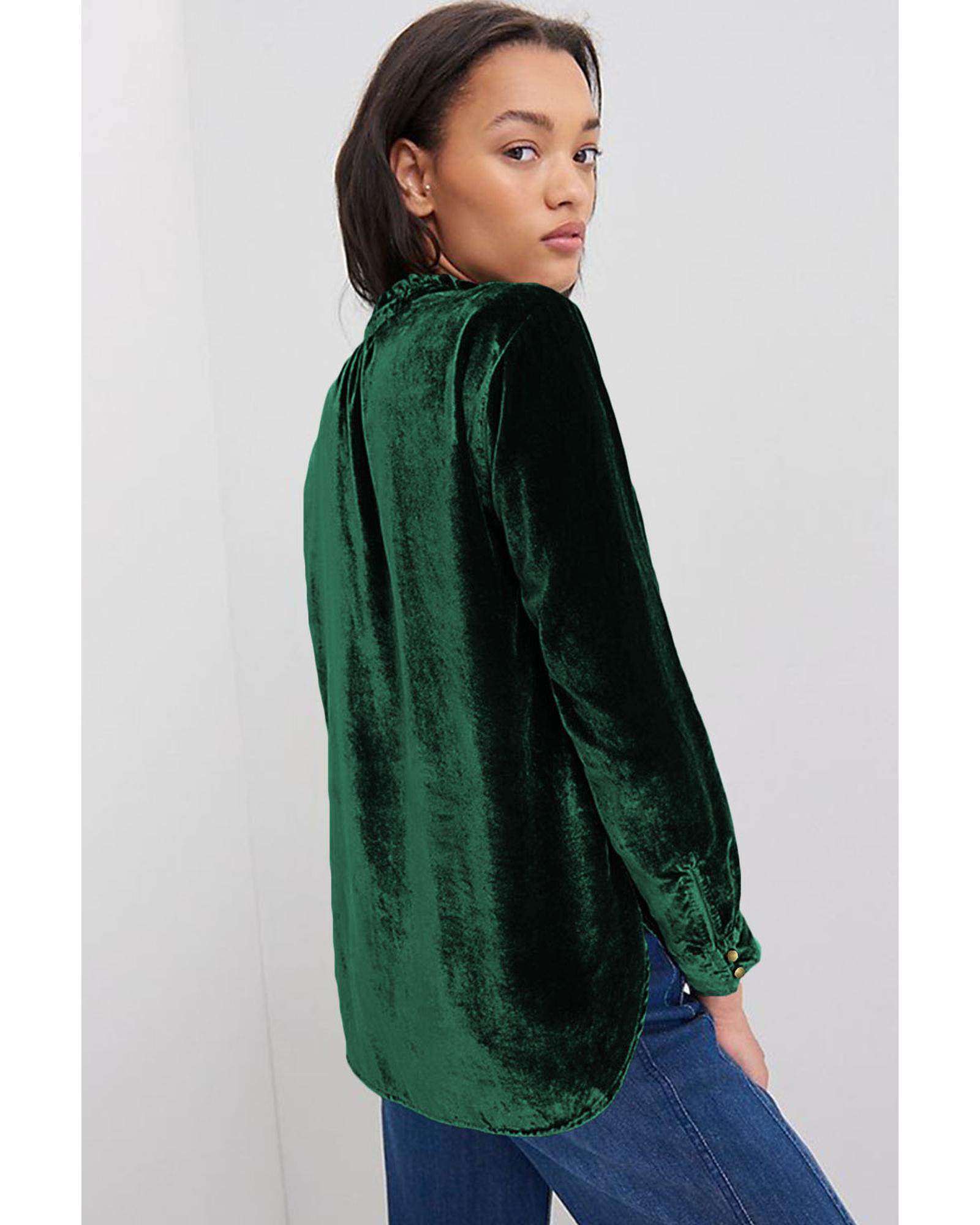 Blackish Green Frilled Neck Buttoned Front Velvet Top – L