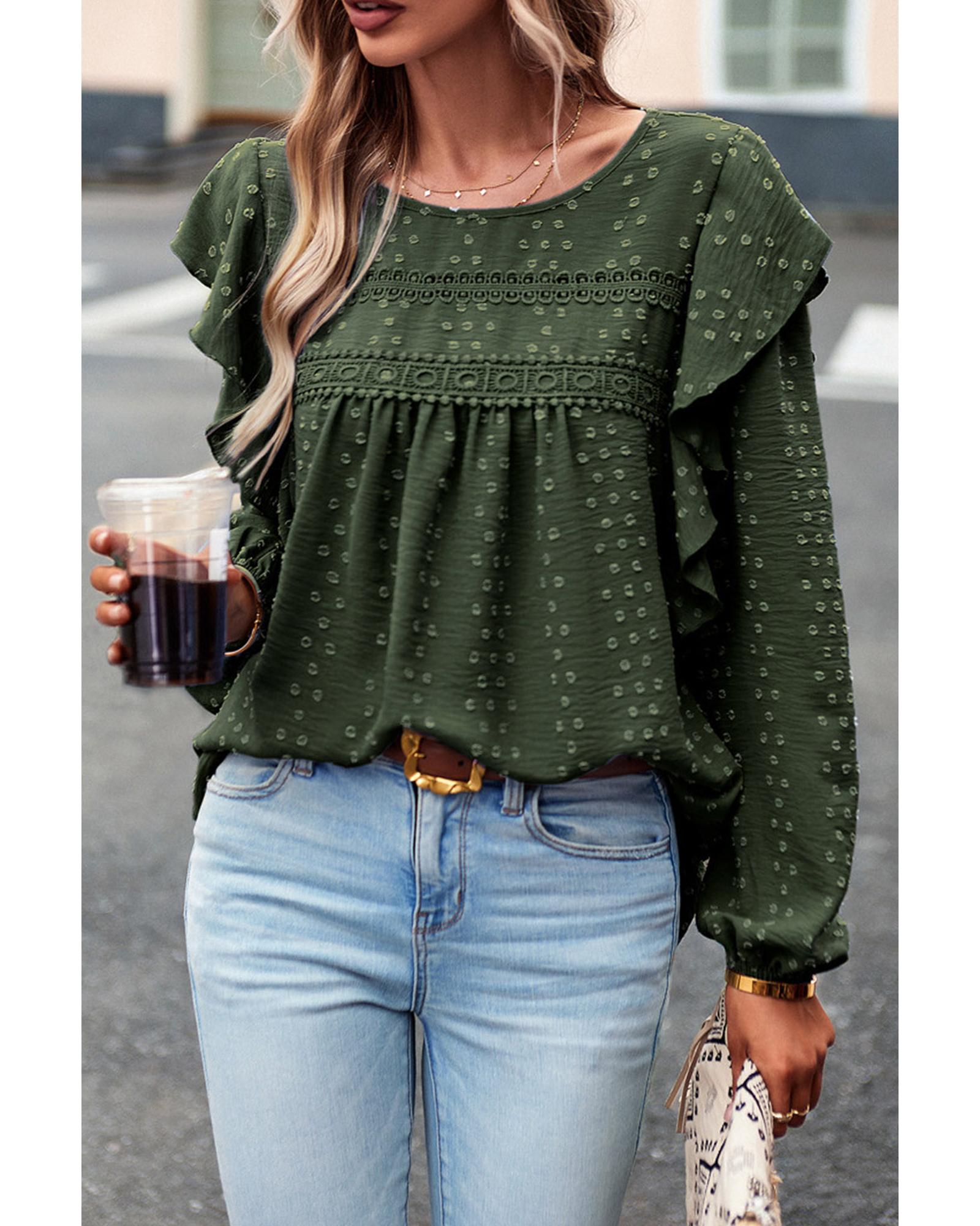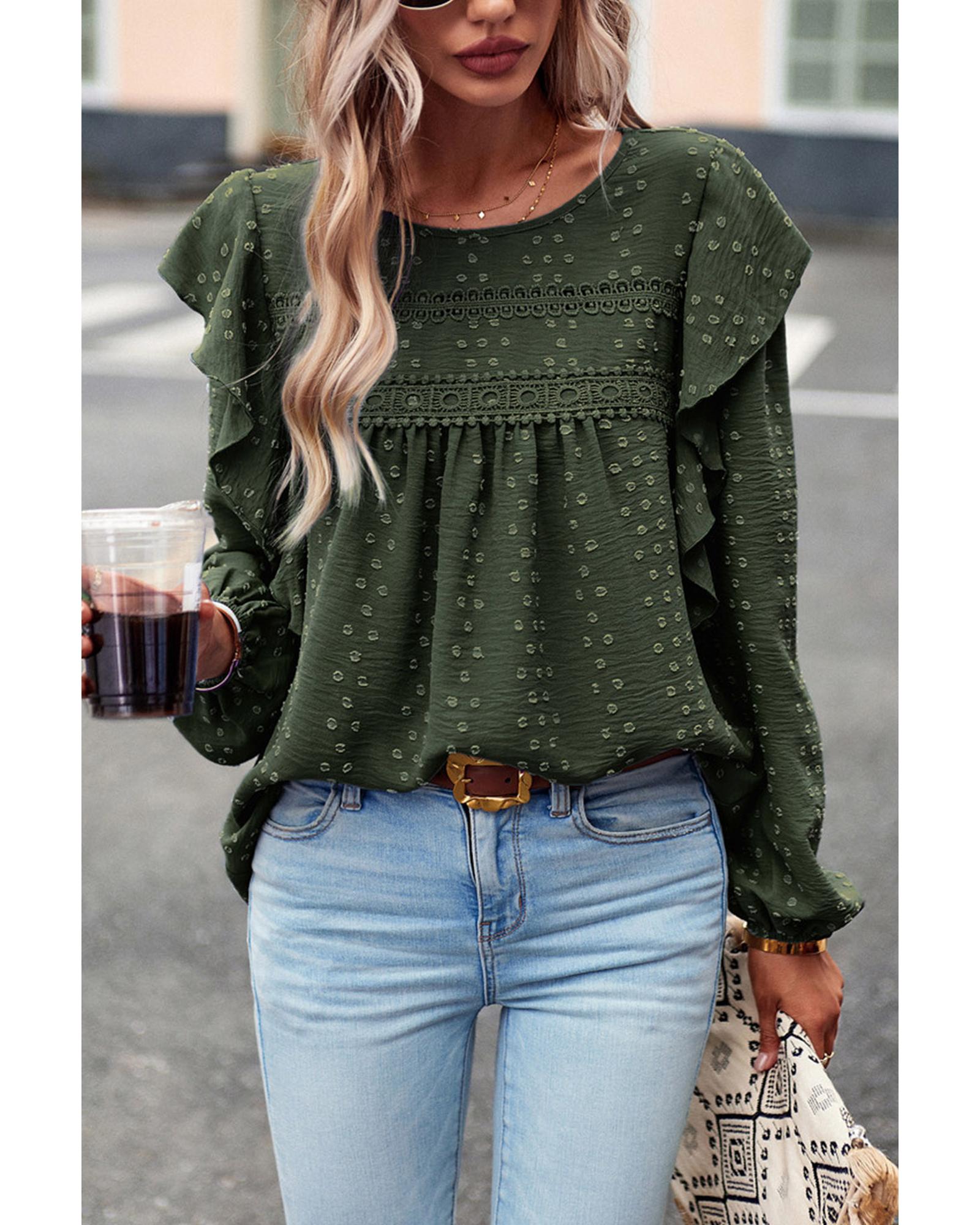 Blackish Green Lace Eyelet Ruffle Shoulder Long Sleeve Blouse – L