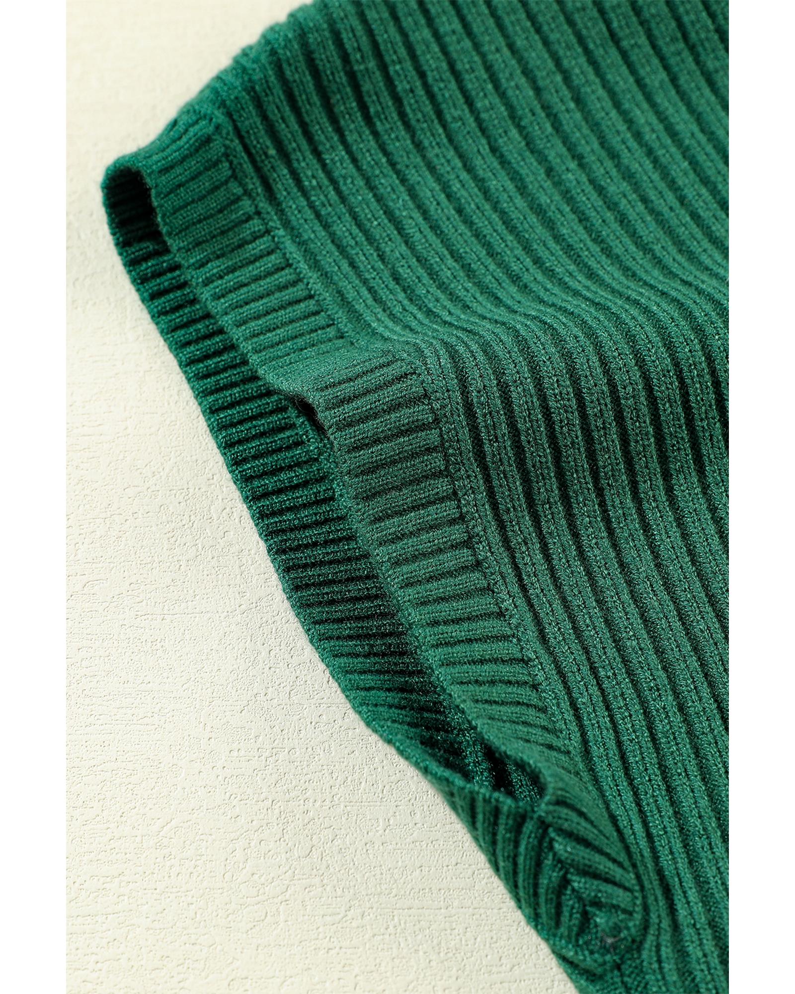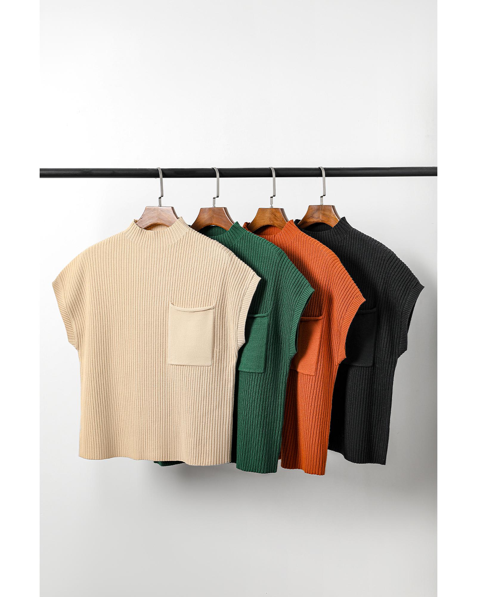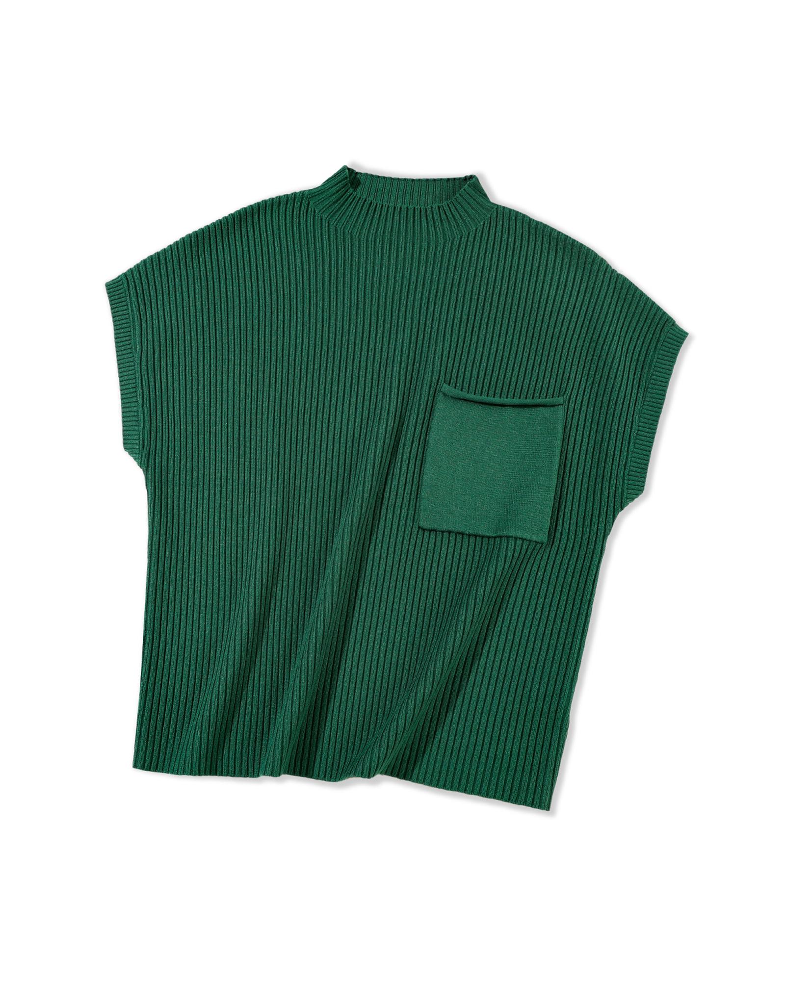 Blackish Green Patch Pocket Ribbed Knit Short Sleeve Sweater – S