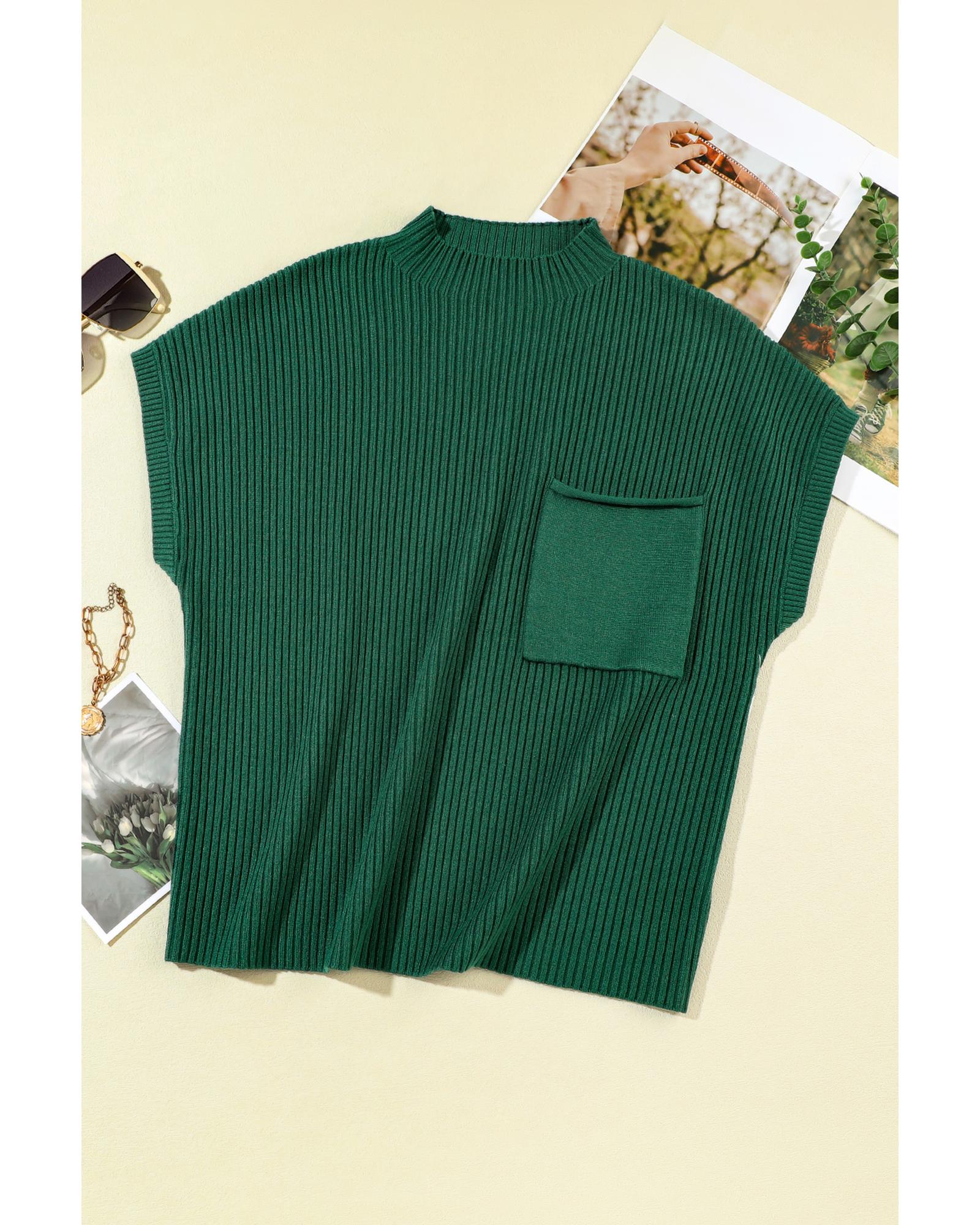 Blackish Green Patch Pocket Ribbed Knit Short Sleeve Sweater – XL
