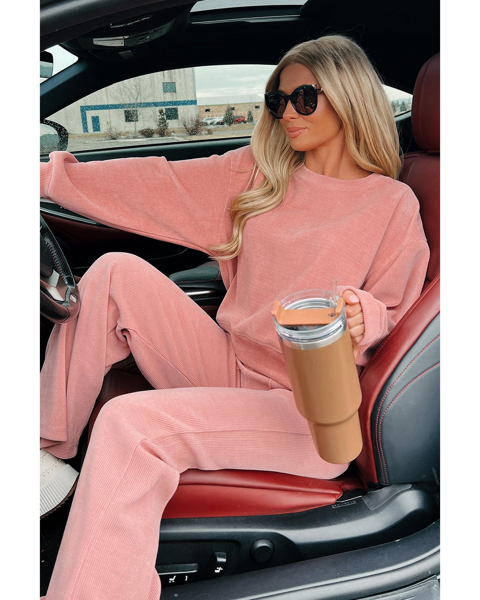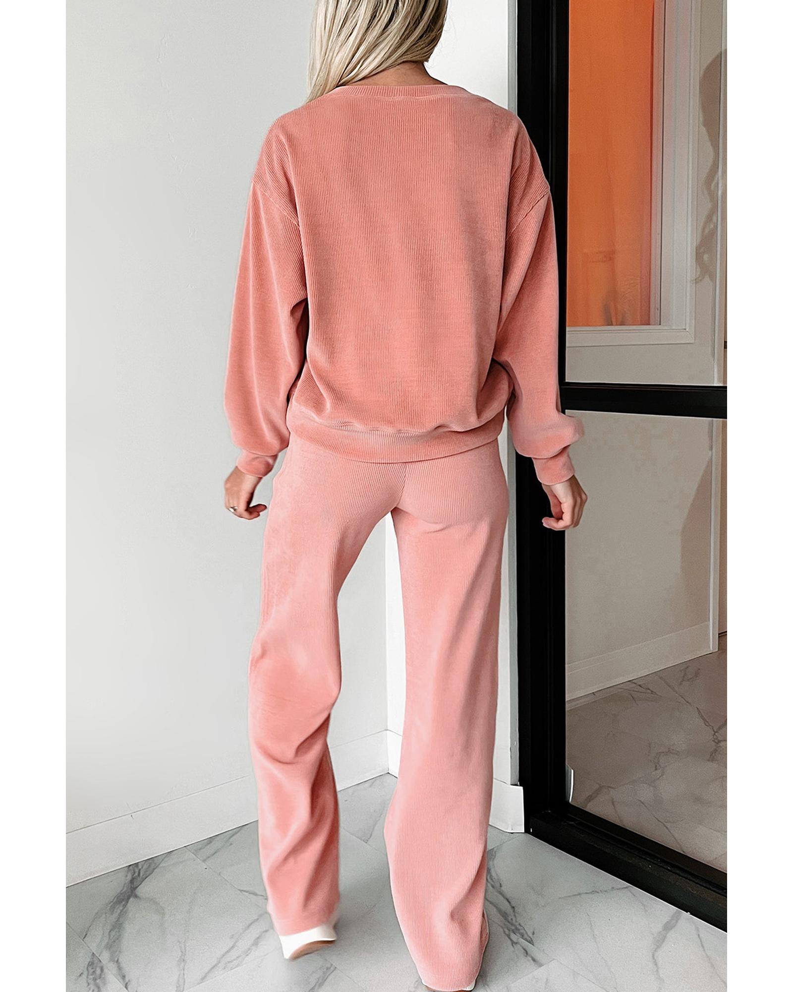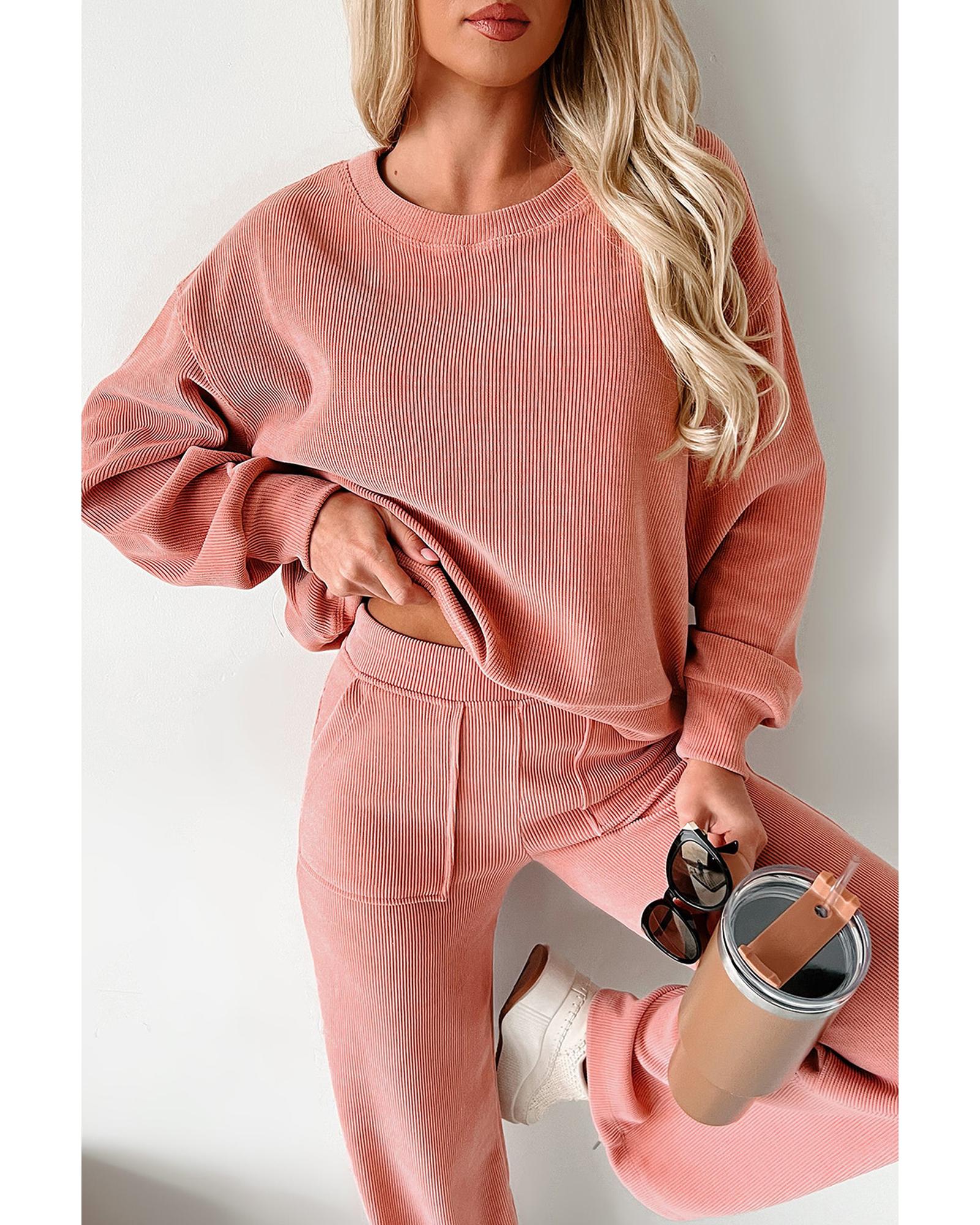 Blossom Ribbed Knit Drop Shoulder Pocketed Two Piece Lounge Set – M