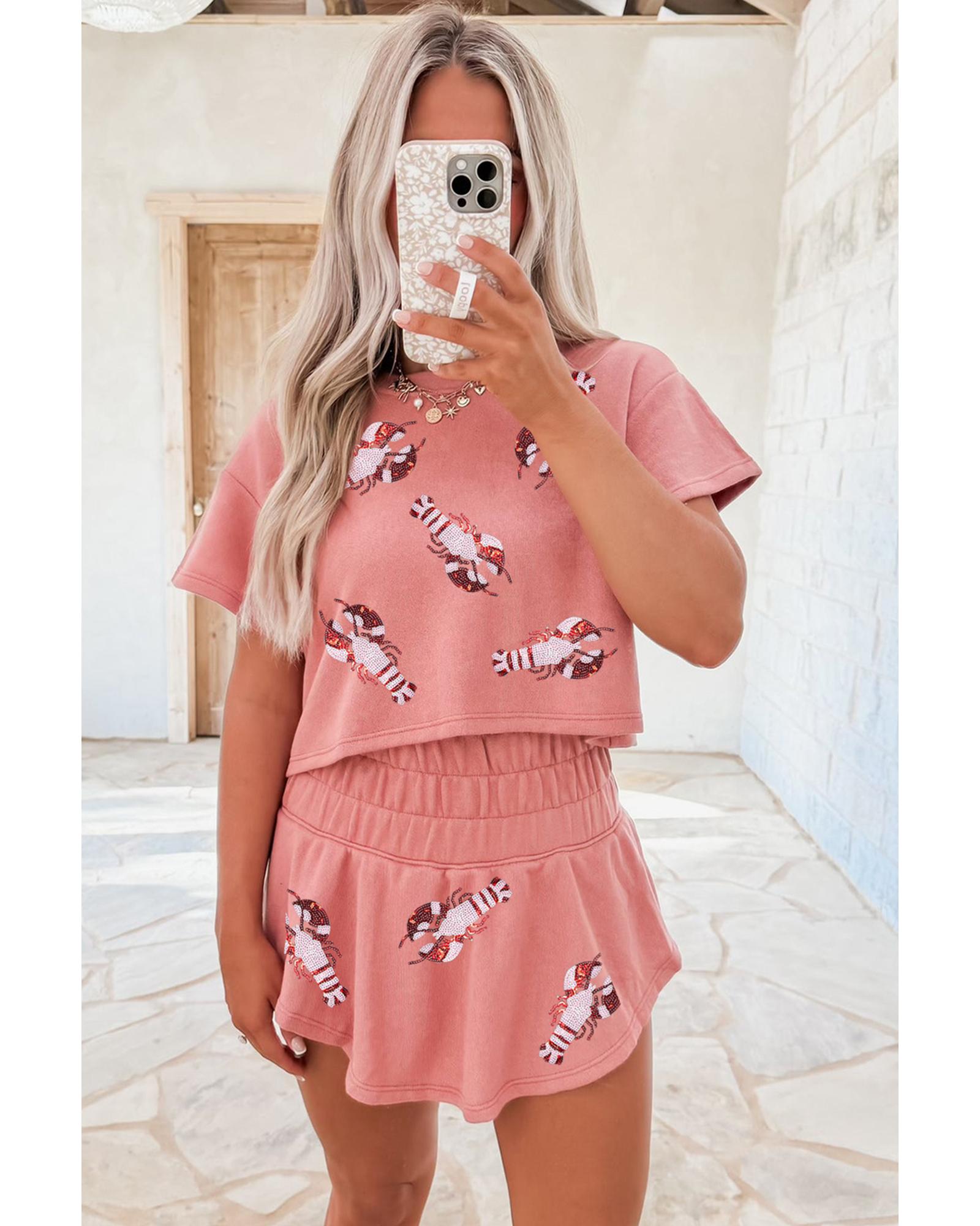 Blossom Sequin Crawfish Graphic Cropped Tee High Waist Skort 2pcs Outfit – M