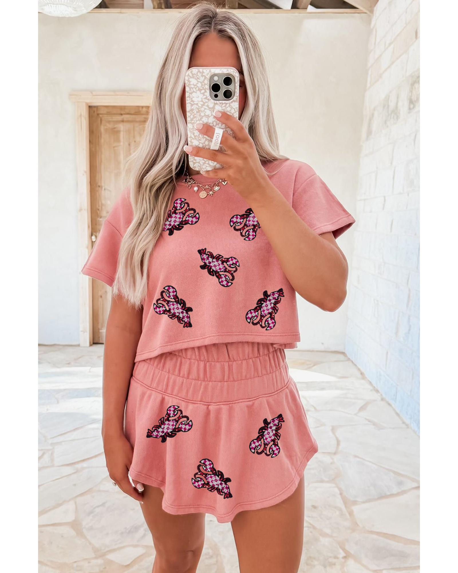 Blossom Sequined Lobster Patched Crop Tee and High Waist Short Set – S