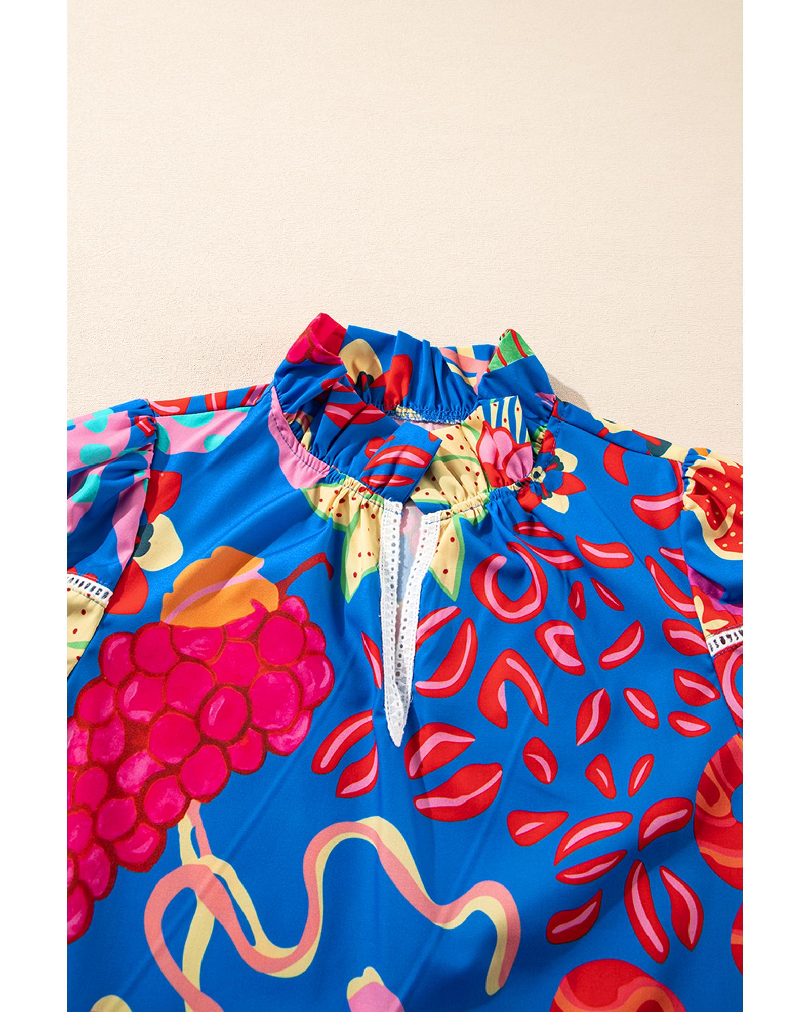 Blue Abstract Print Frilled Collar Ruffled Puff Short Sleeve Top – L