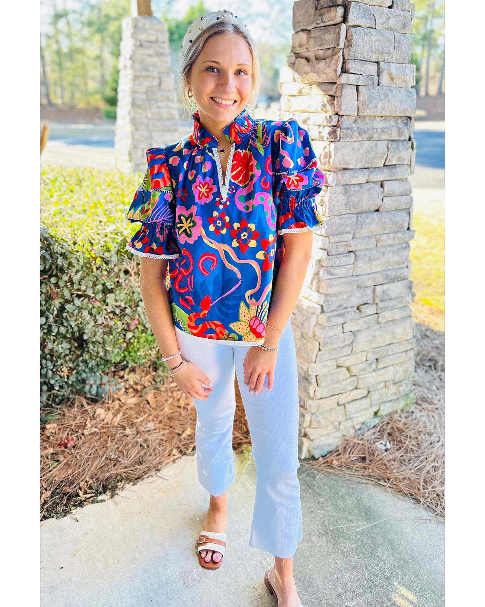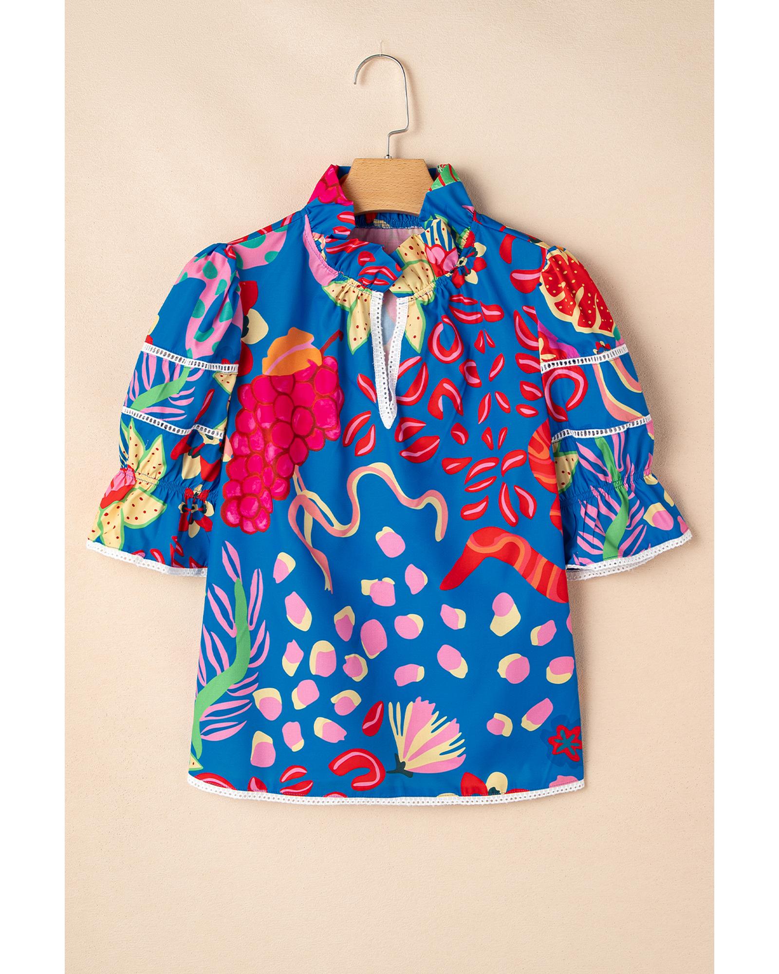 Blue Abstract Print Frilled Collar Ruffled Puff Short Sleeve Top – XL