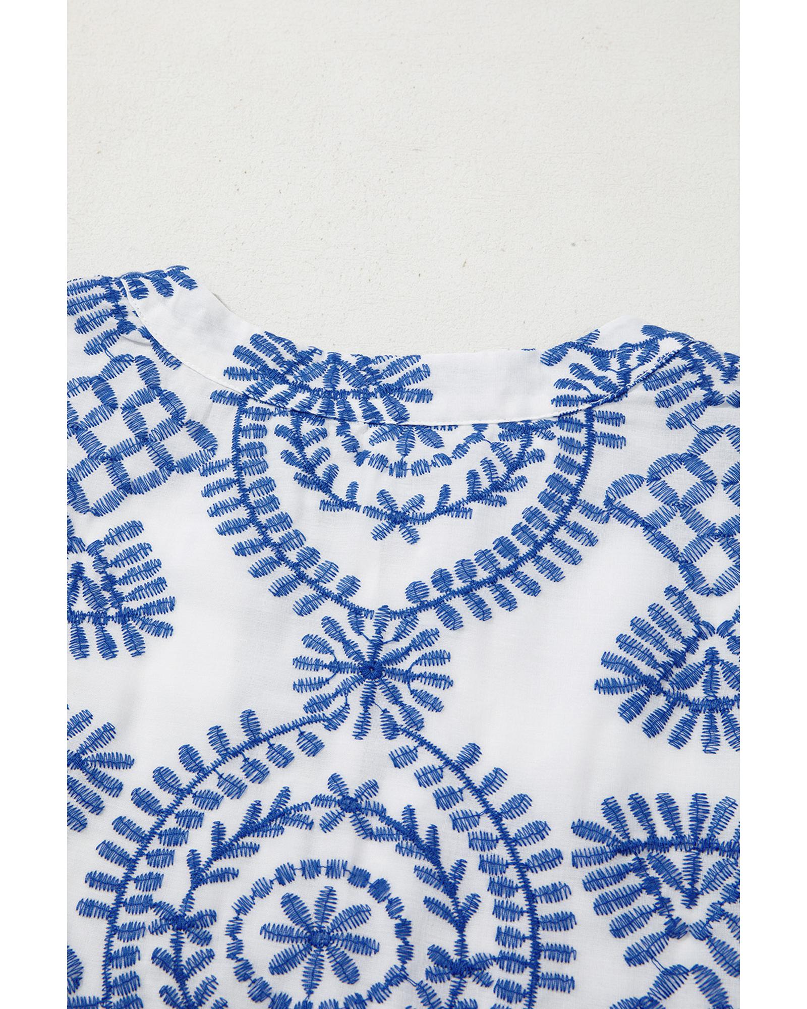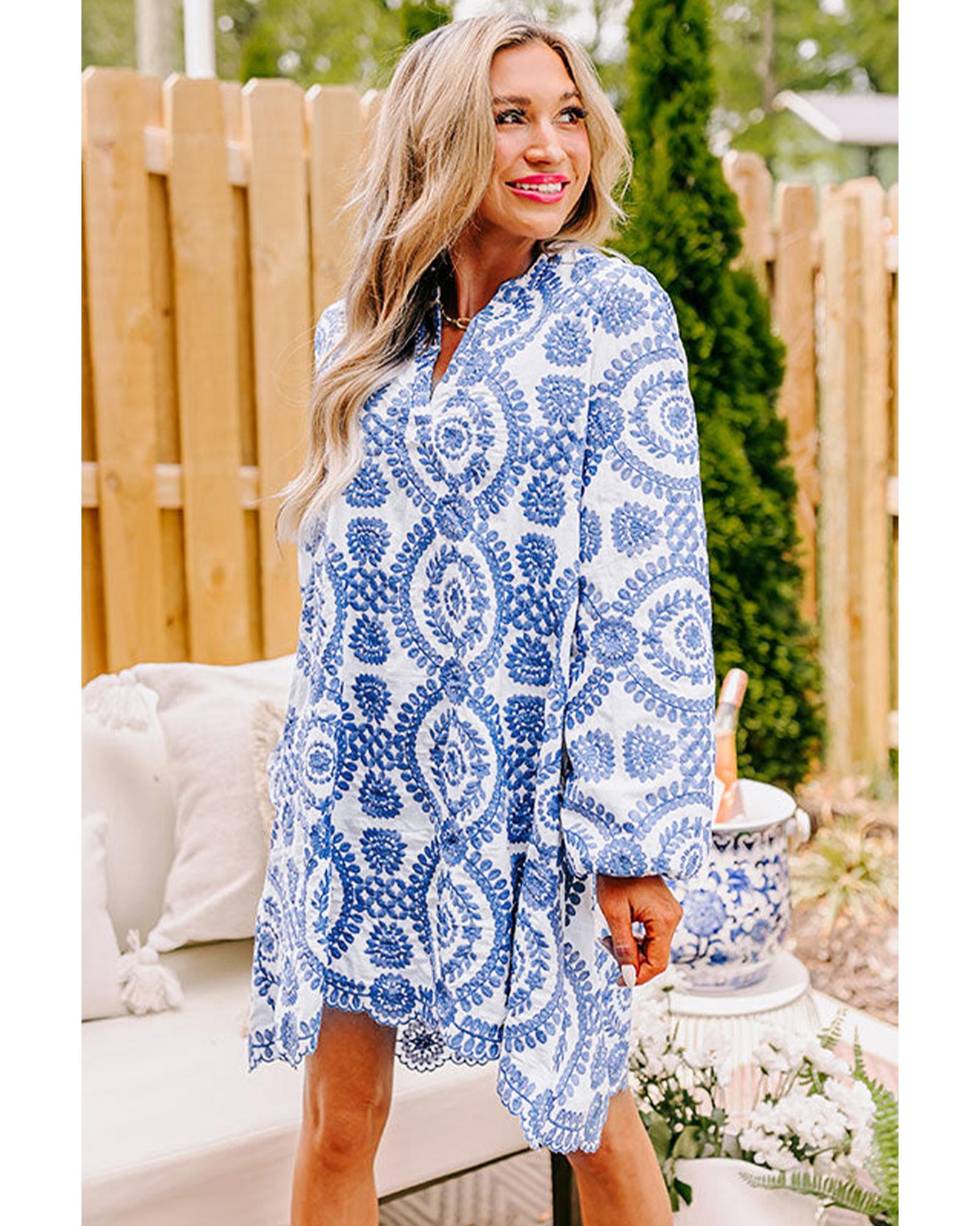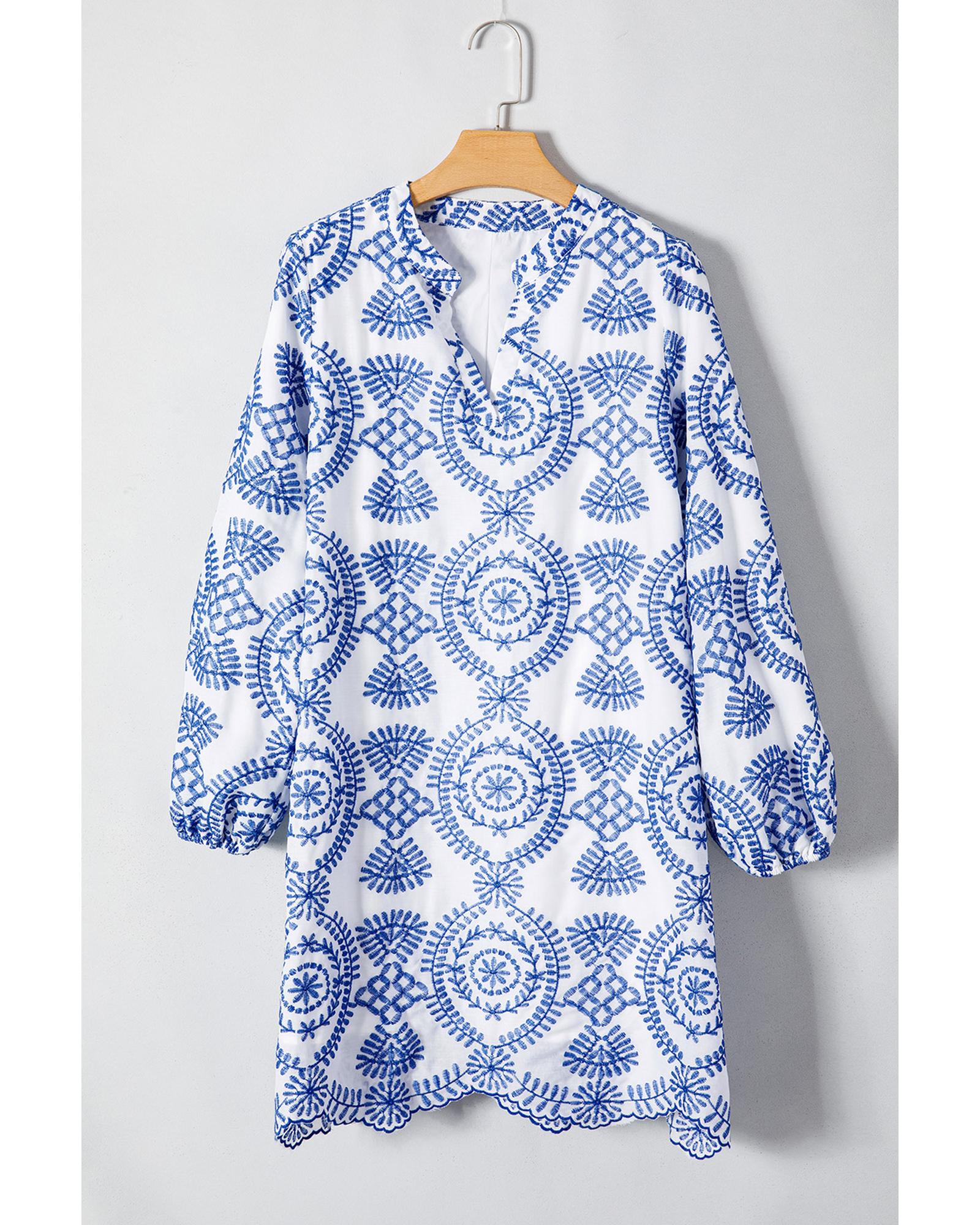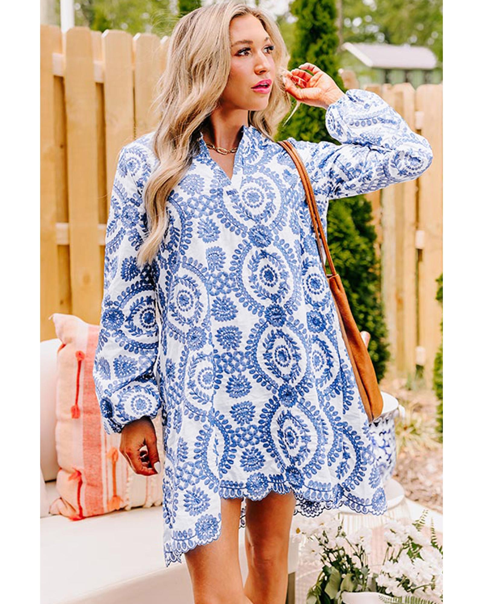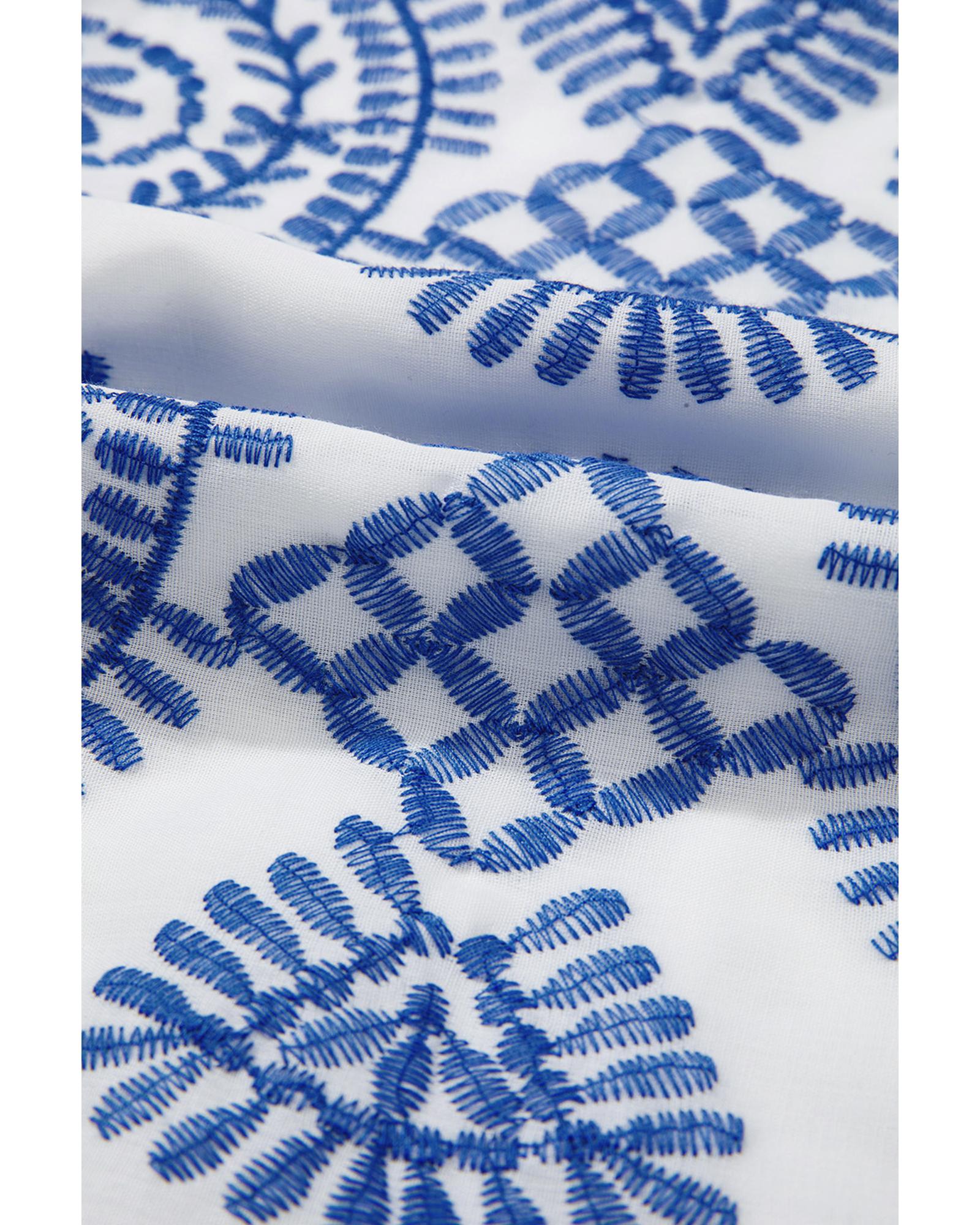 Blue Boho Floral Embroidered Notch V Neck Shift Mini Dress – XL