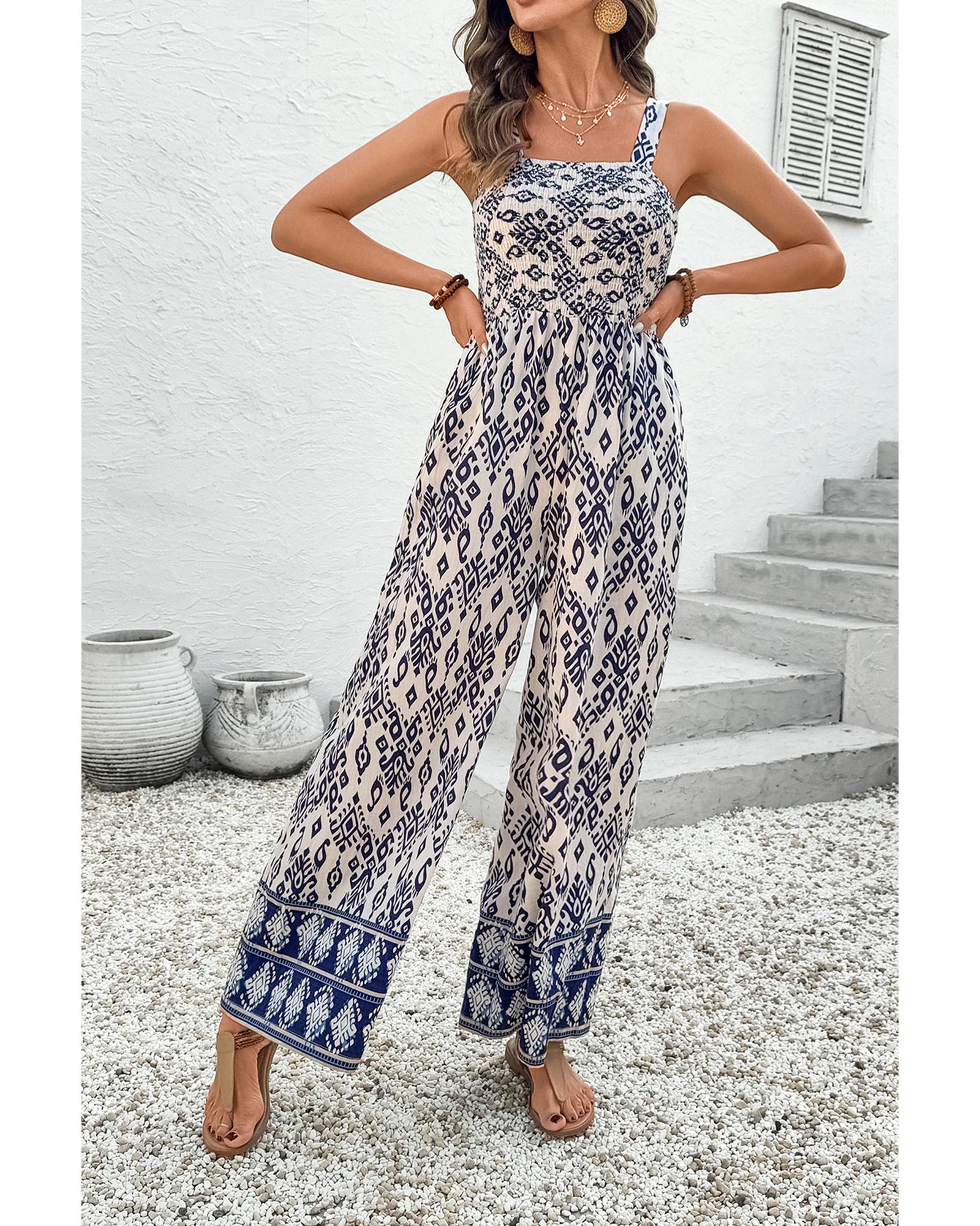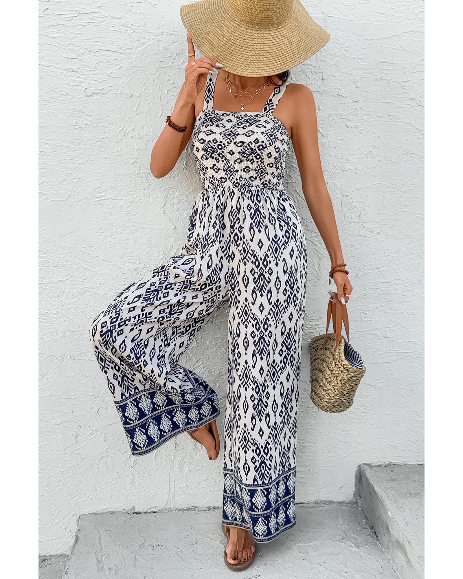 Blue Boho Geometric Print Shirred High Waist Wide Leg Jumpsuit - M