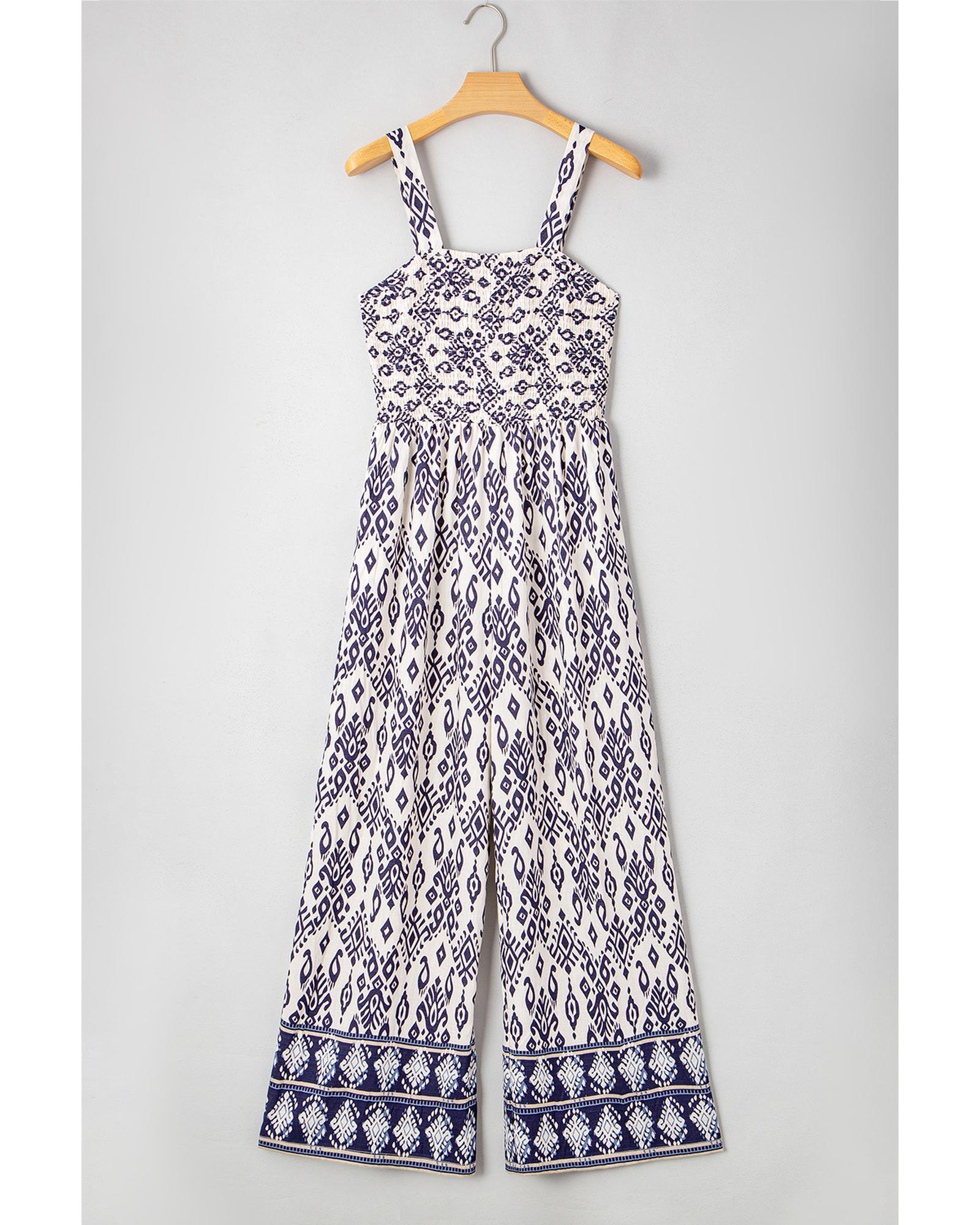 Blue Boho Geometric Print Shirred High Waist Wide Leg Jumpsuit – M