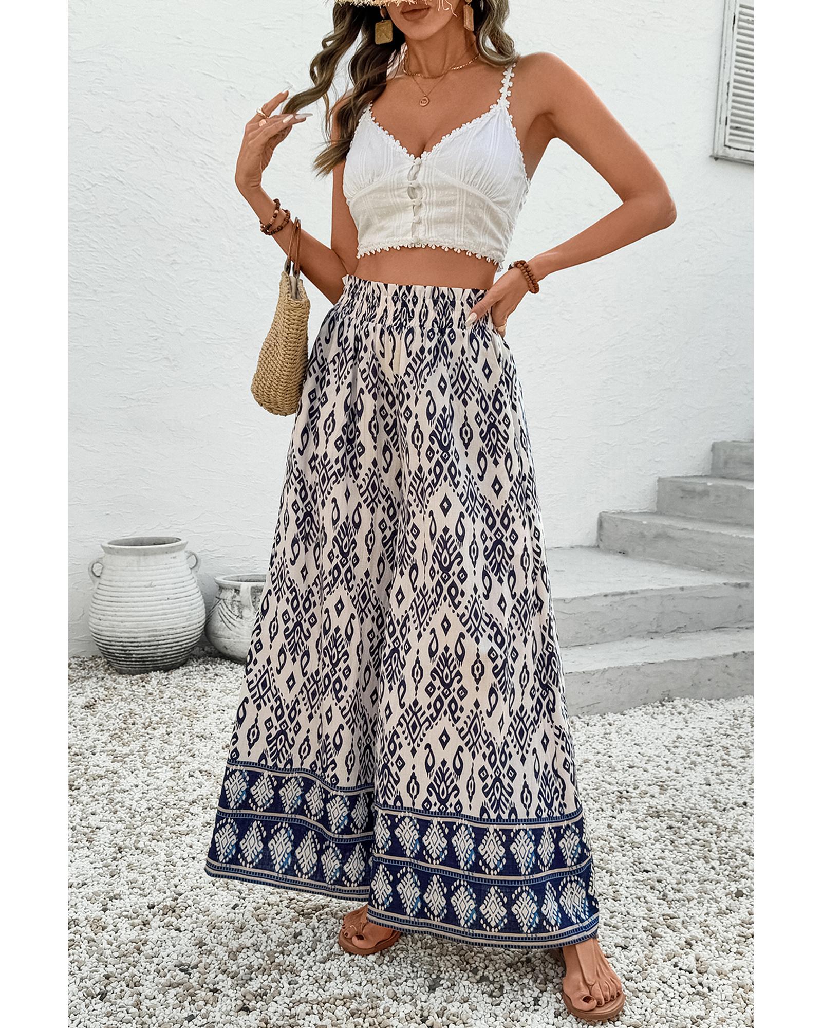 Blue Boho Pattern Print High Waist Wide Leg Loose Pants – XL