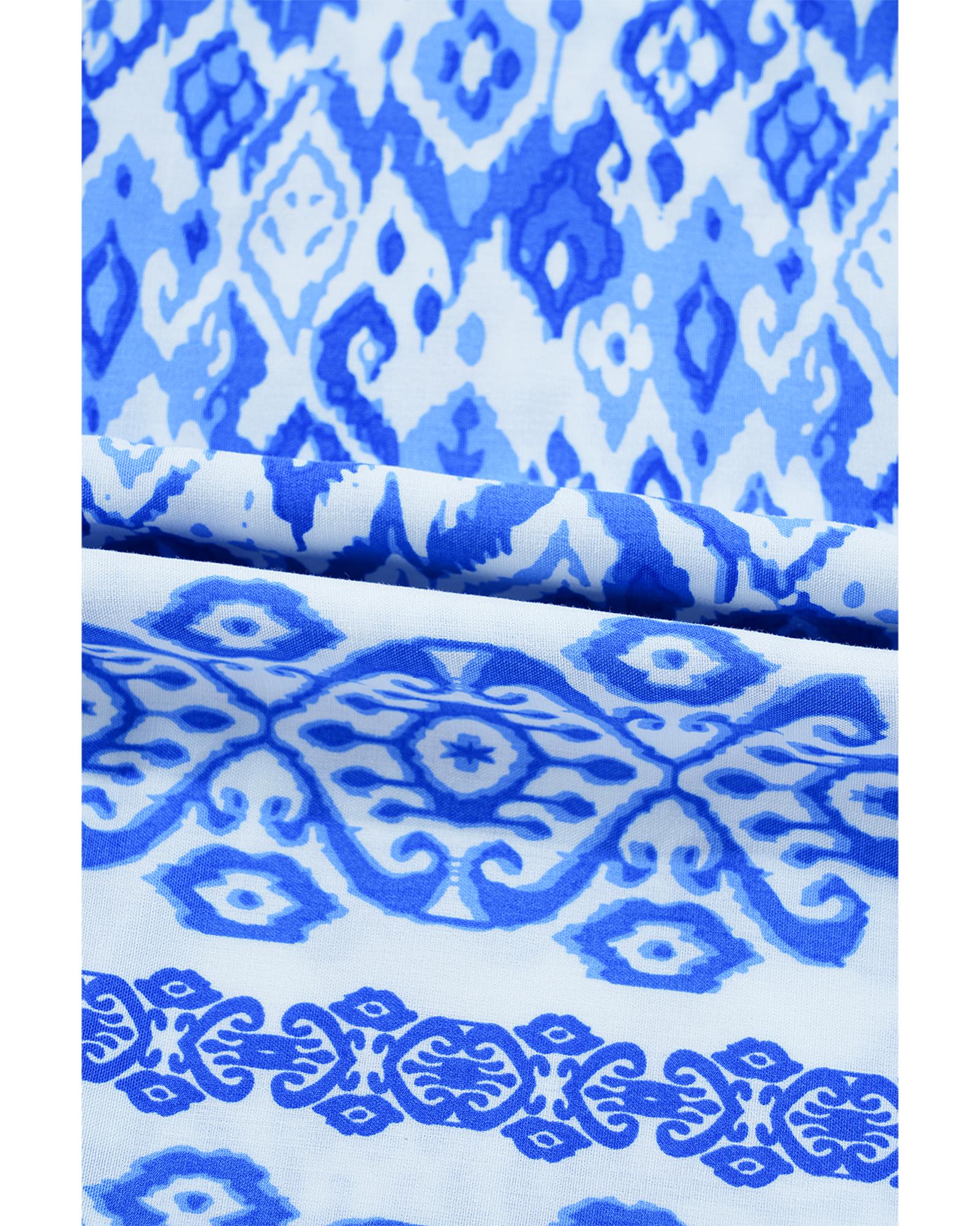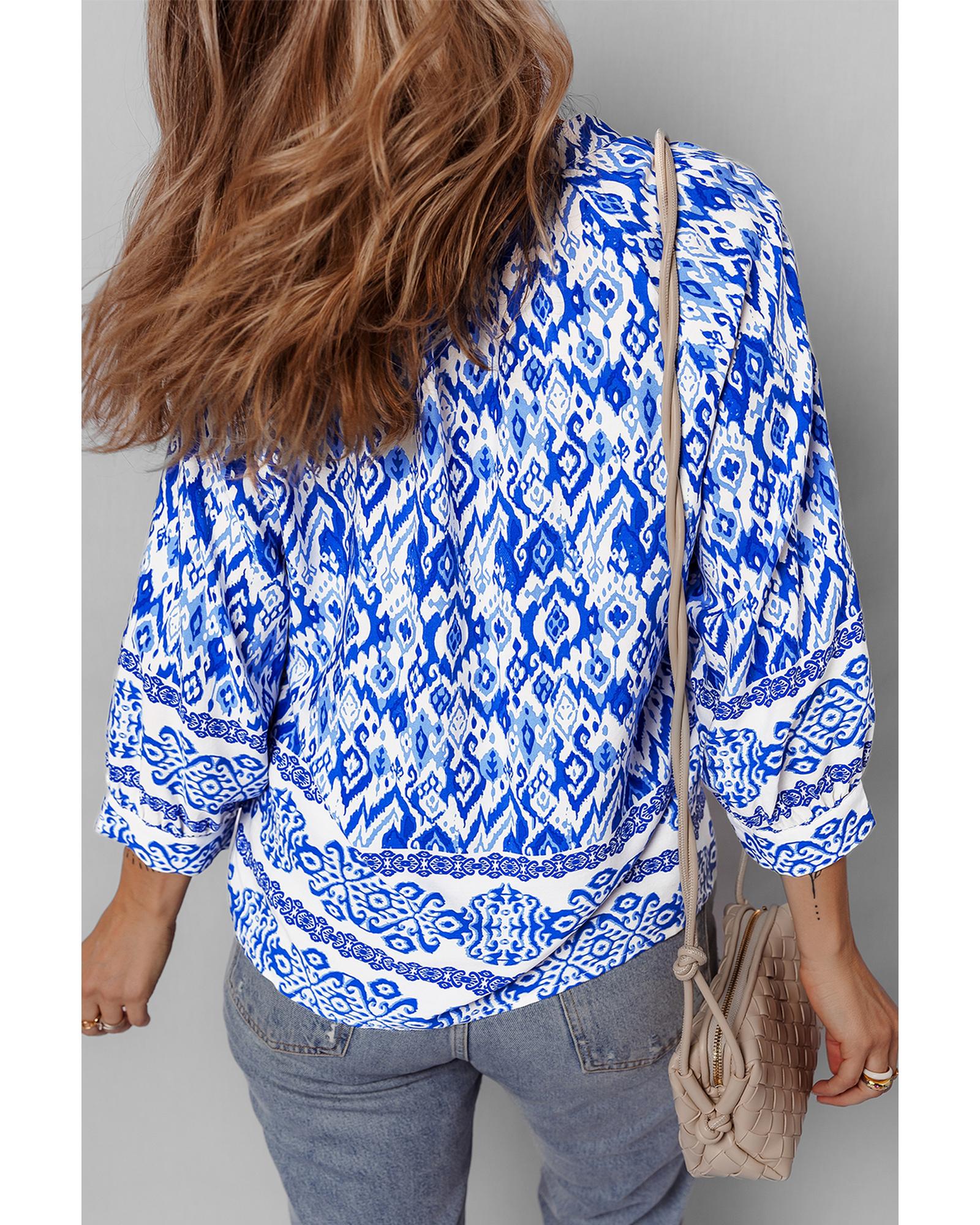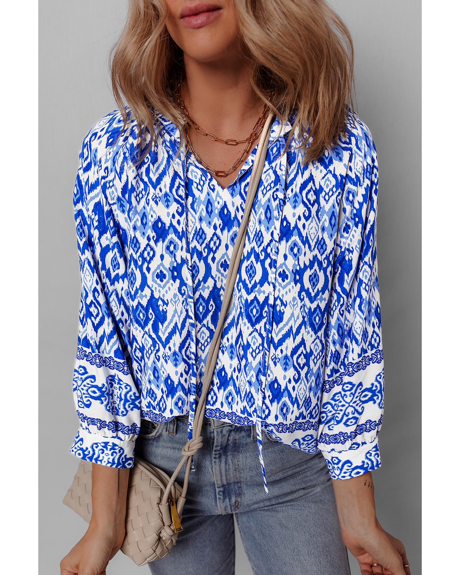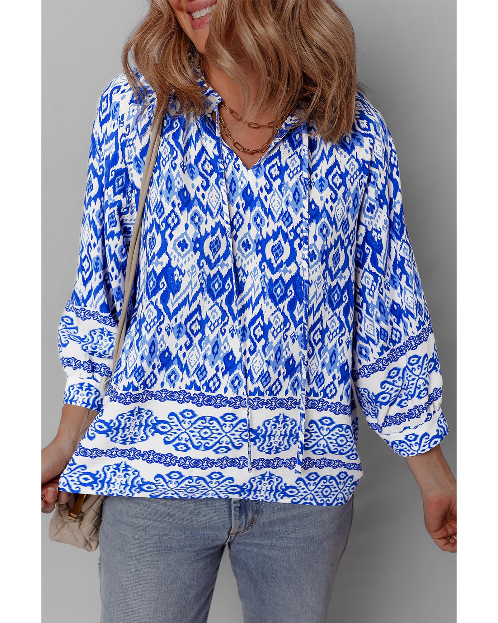 Blue Boho Printed 3/4 Sleeve Tied Neck Blouse – M