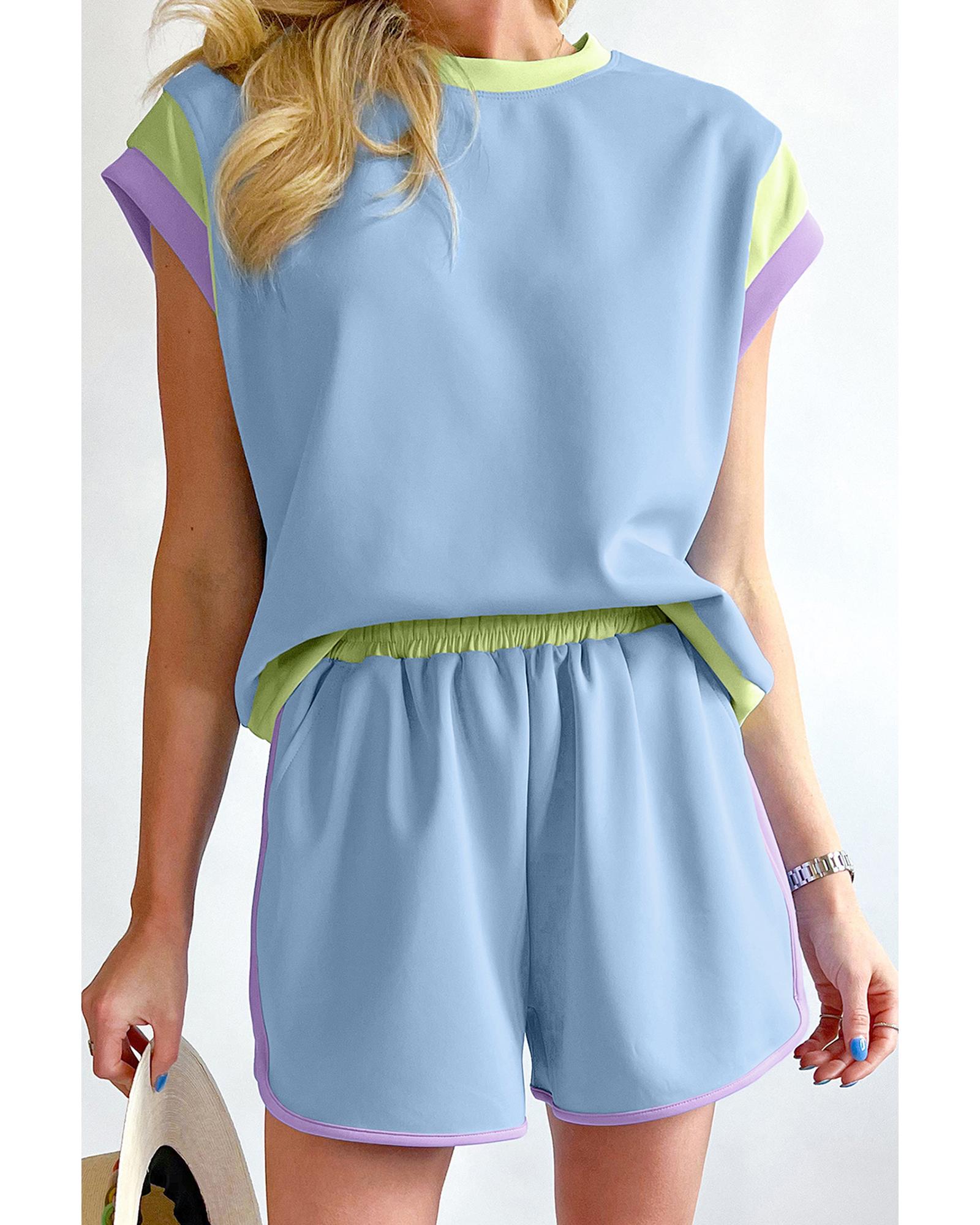 Blue Contrast Trim Cap Sleeve Tee Shorts Set – M