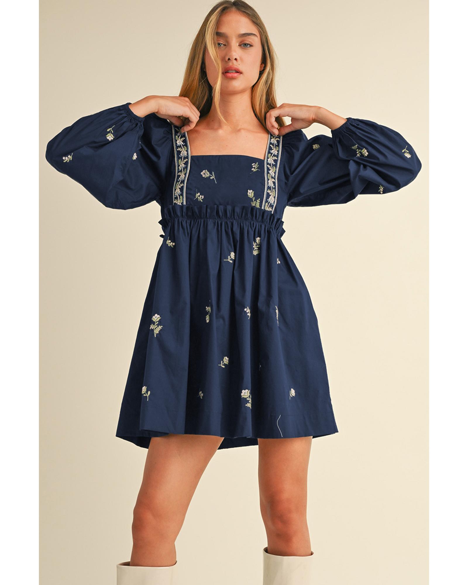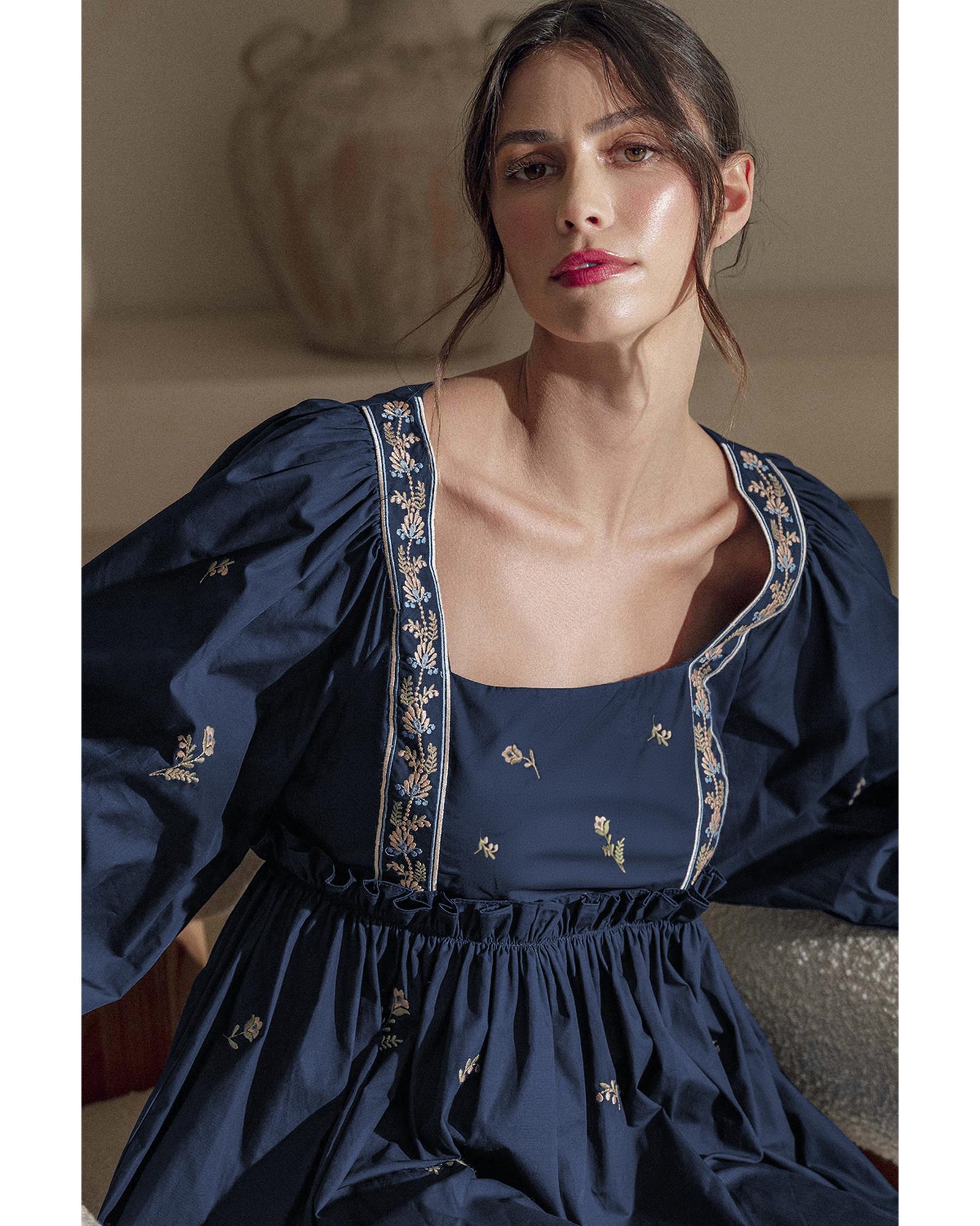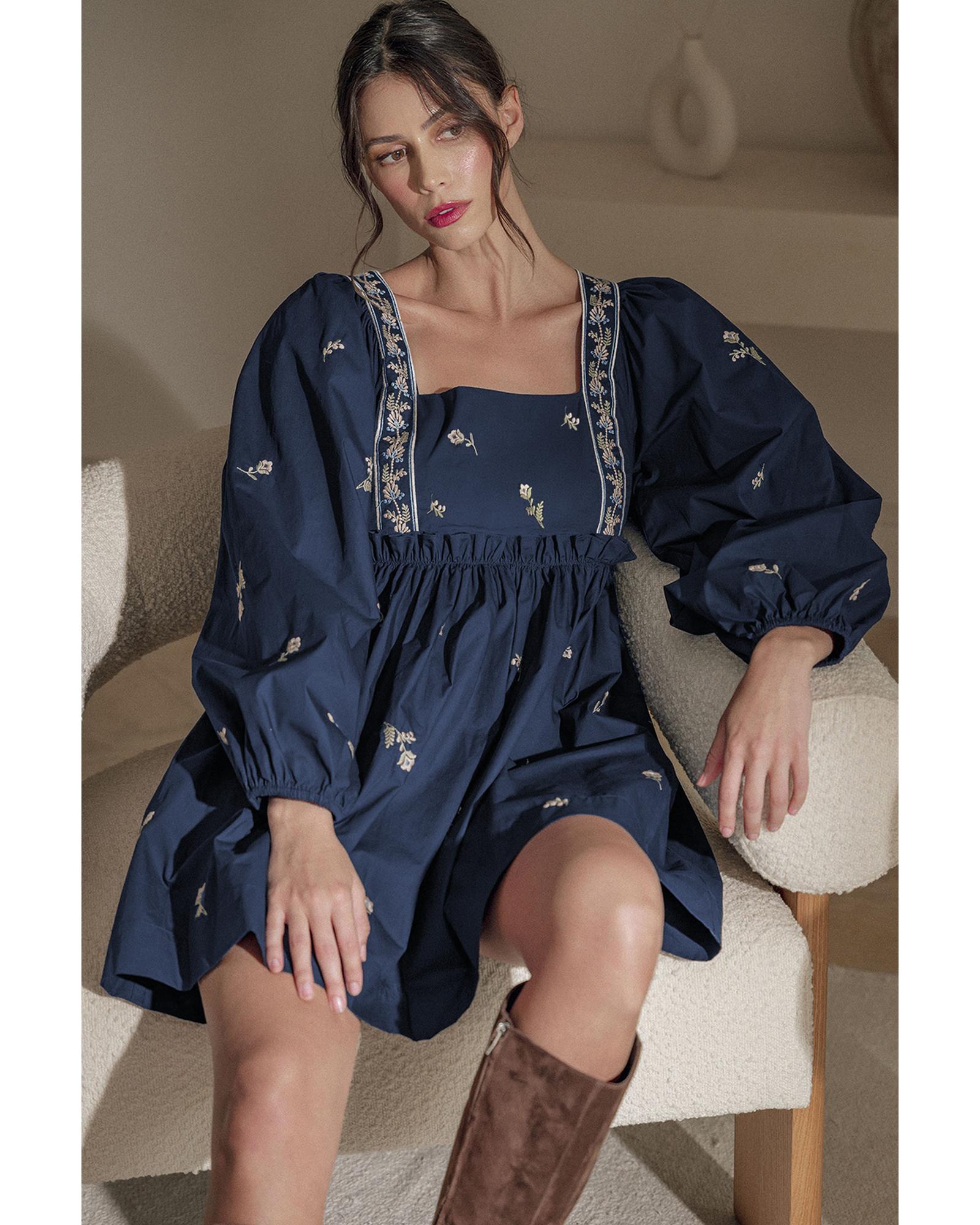 - Blue Floral Embroidered Square Neck Puff Sleeve Ruffled Mini Dress