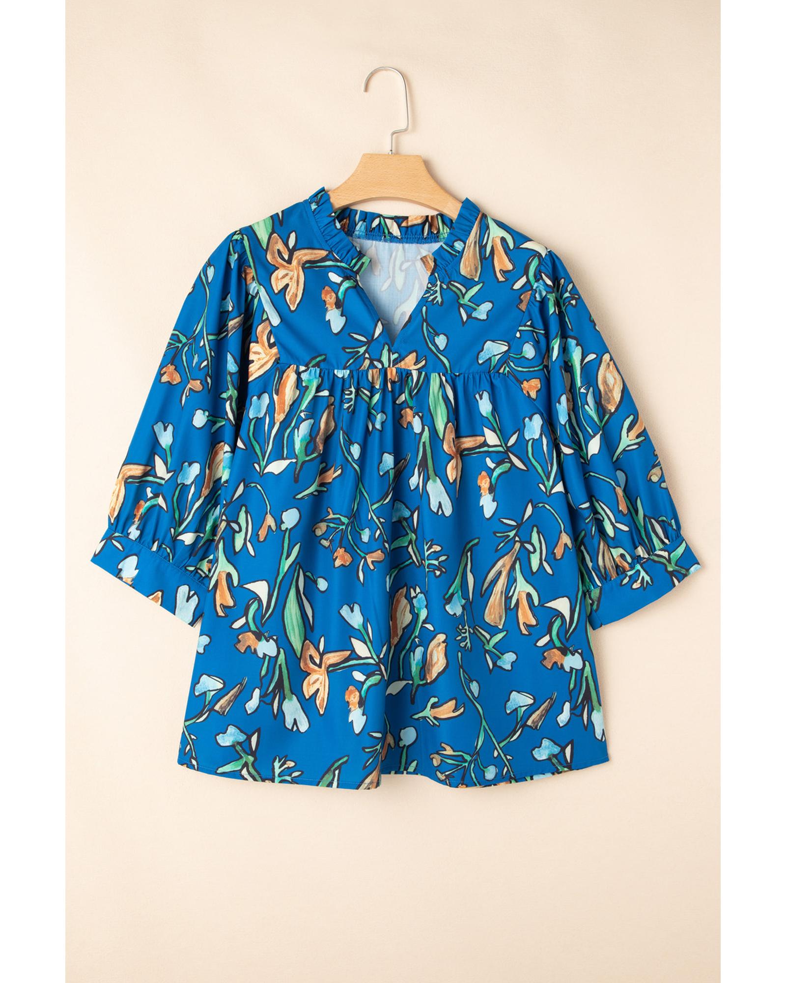 Blue Floral Notched V Neck Half Sleeve Plus Size Blouse – 2X