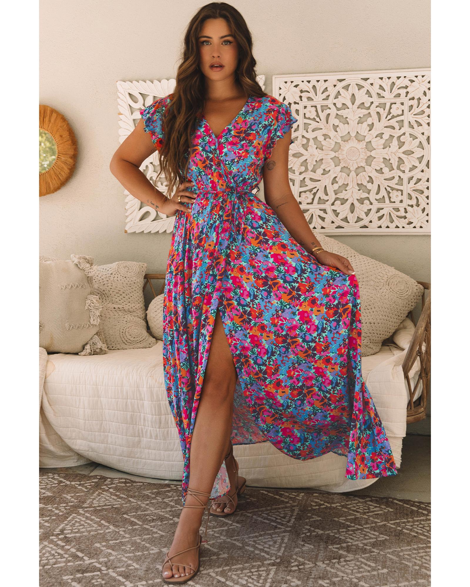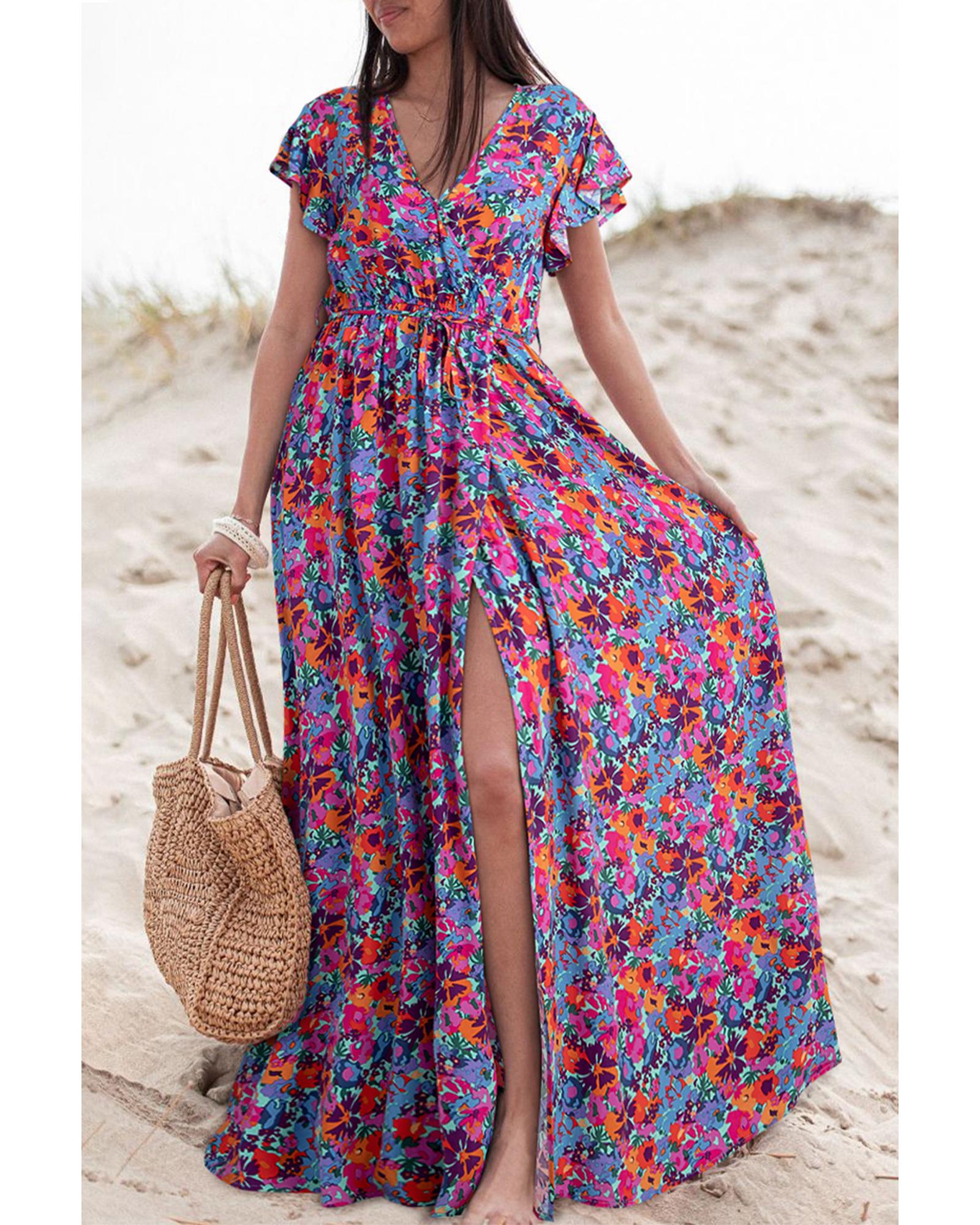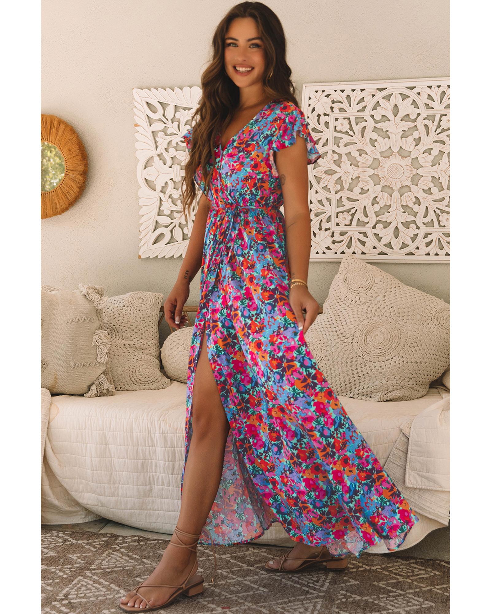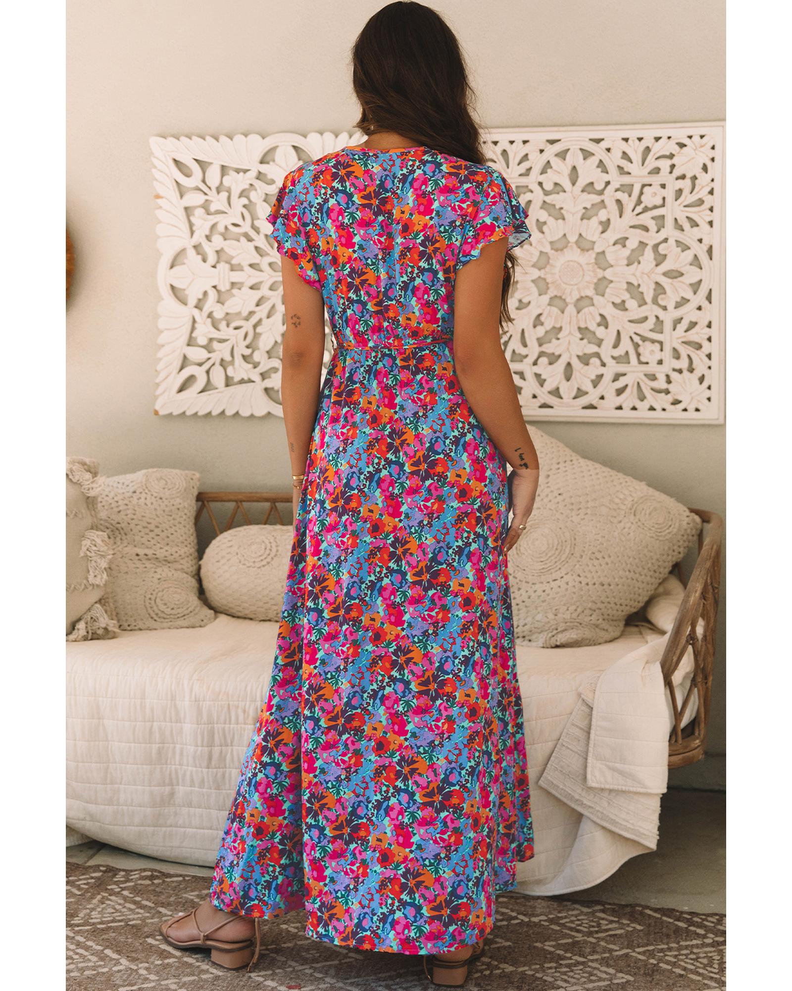Blue Floral Print V Neck Wrap Split Maxi Dress – M