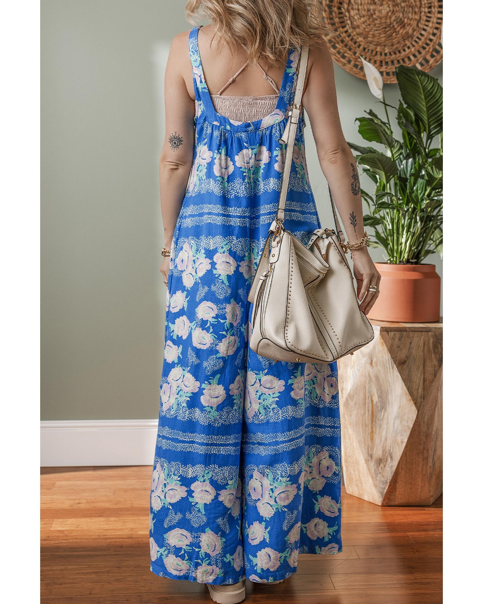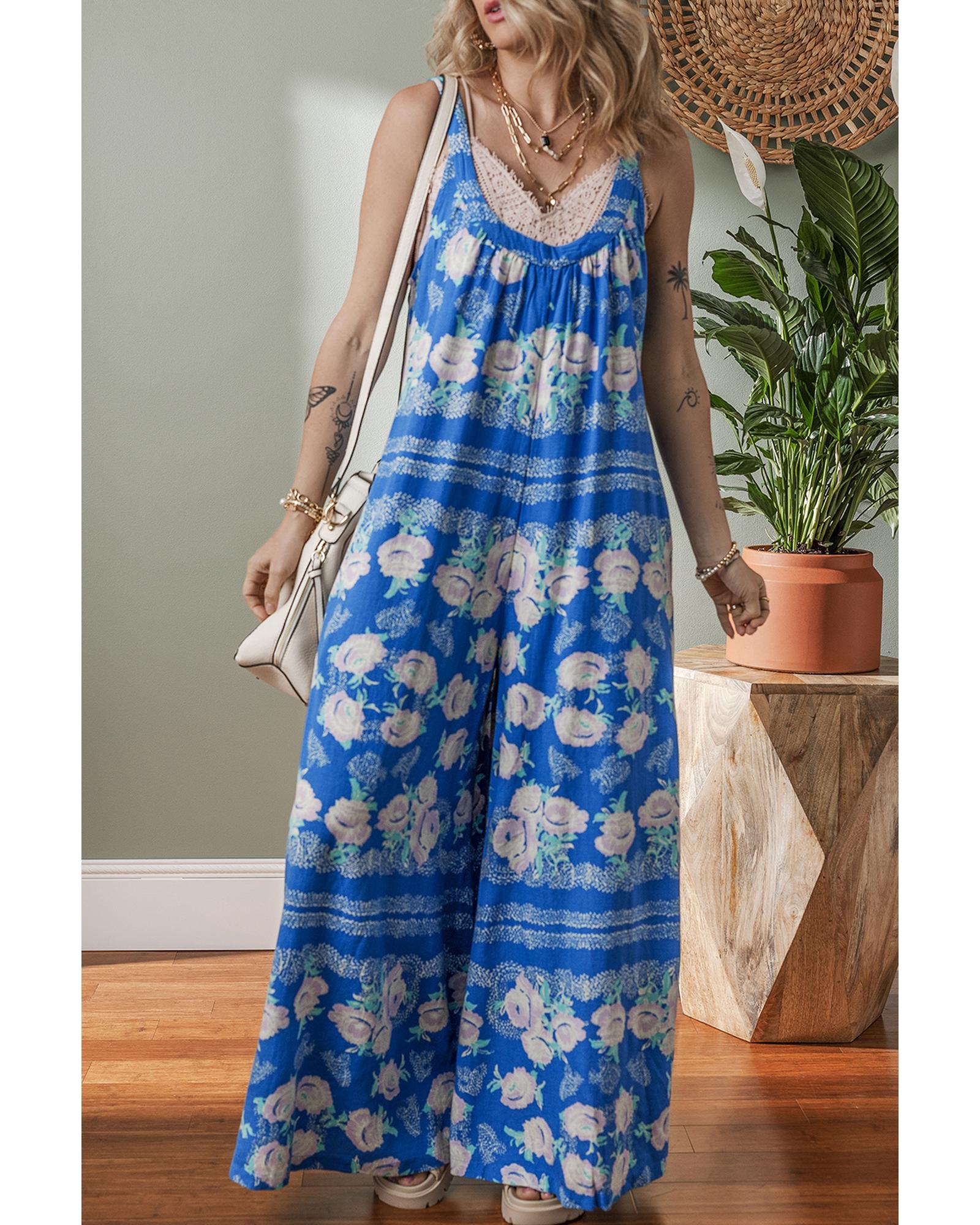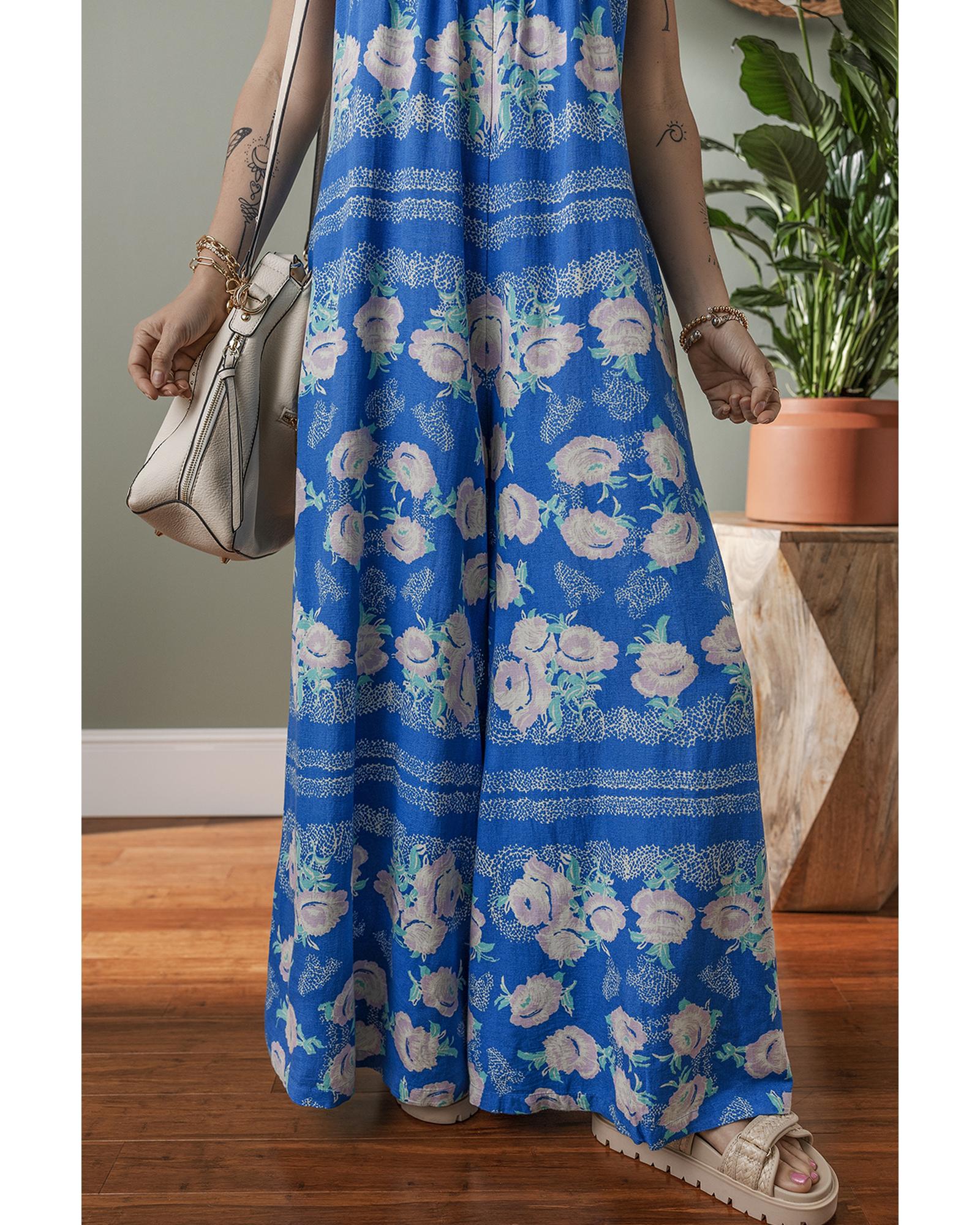- Blue Floral Print Wide Leg Sleeveless Jumpsuit