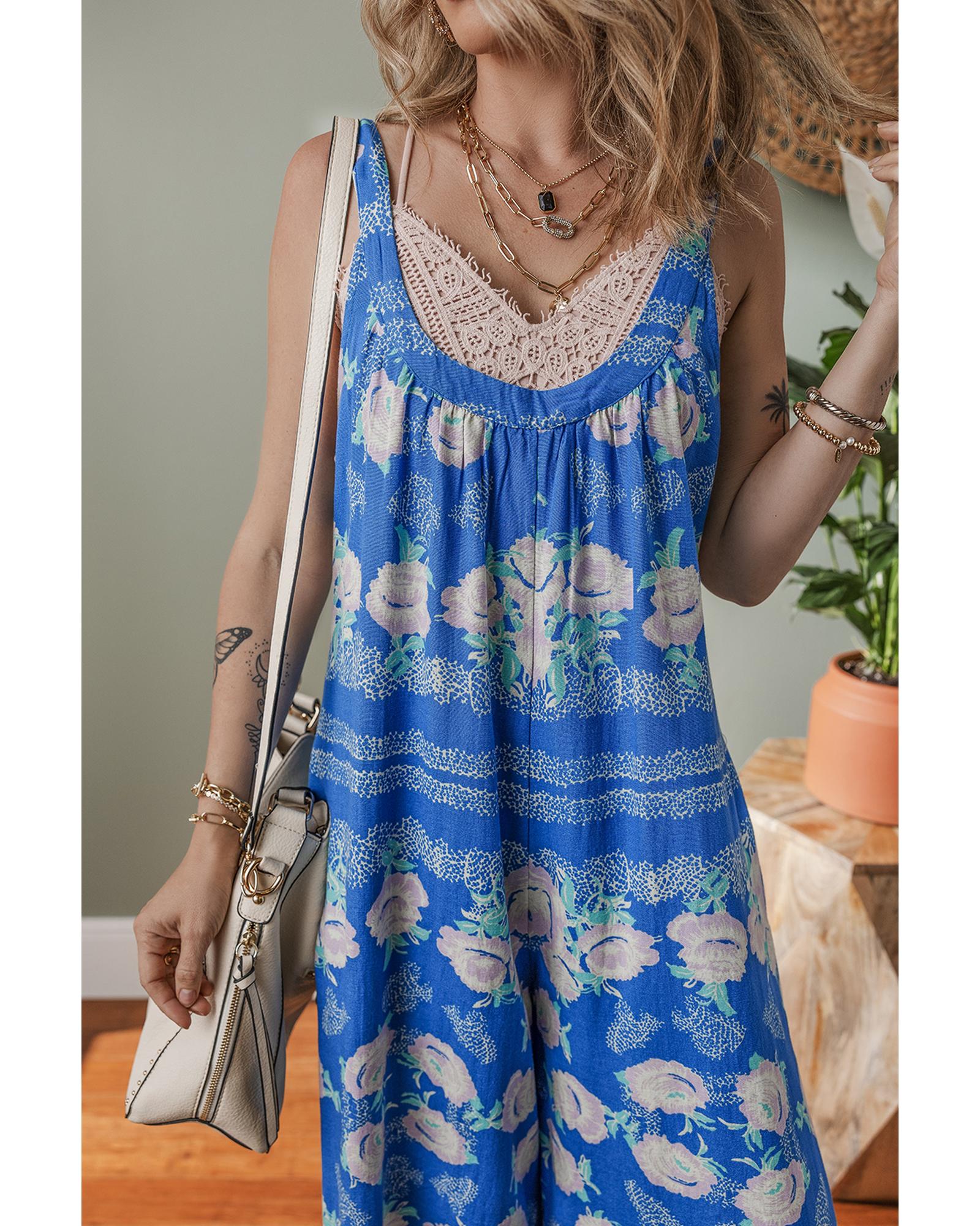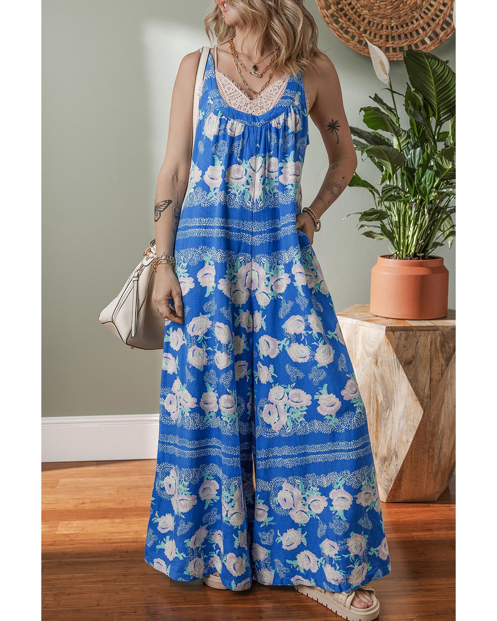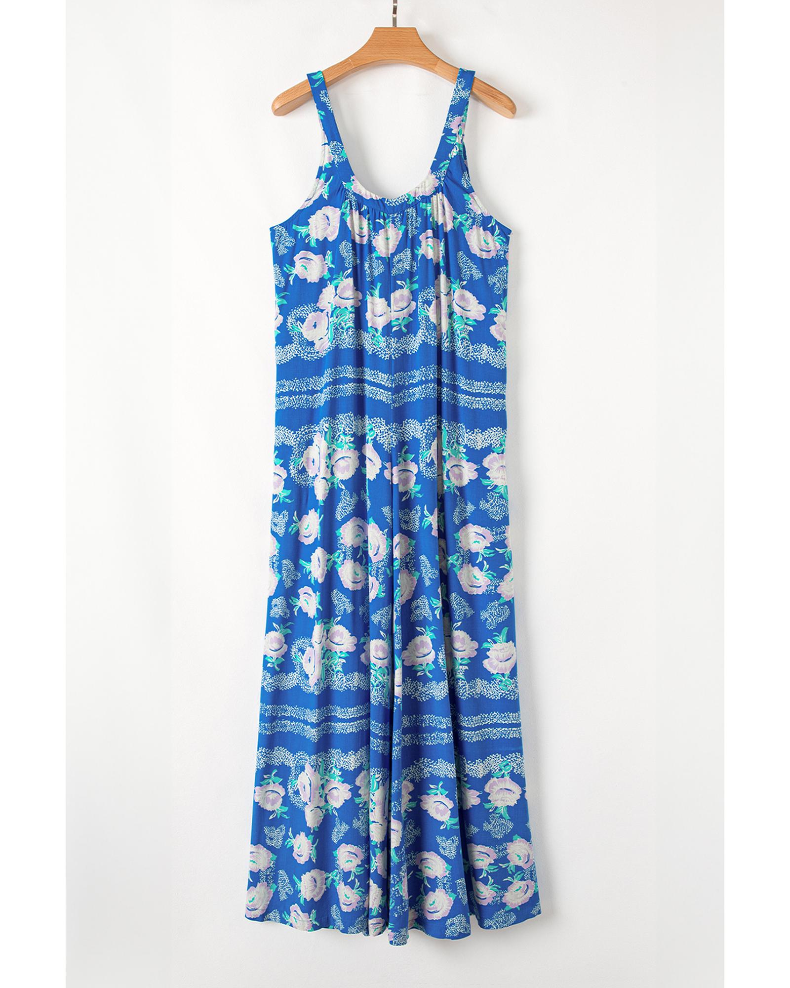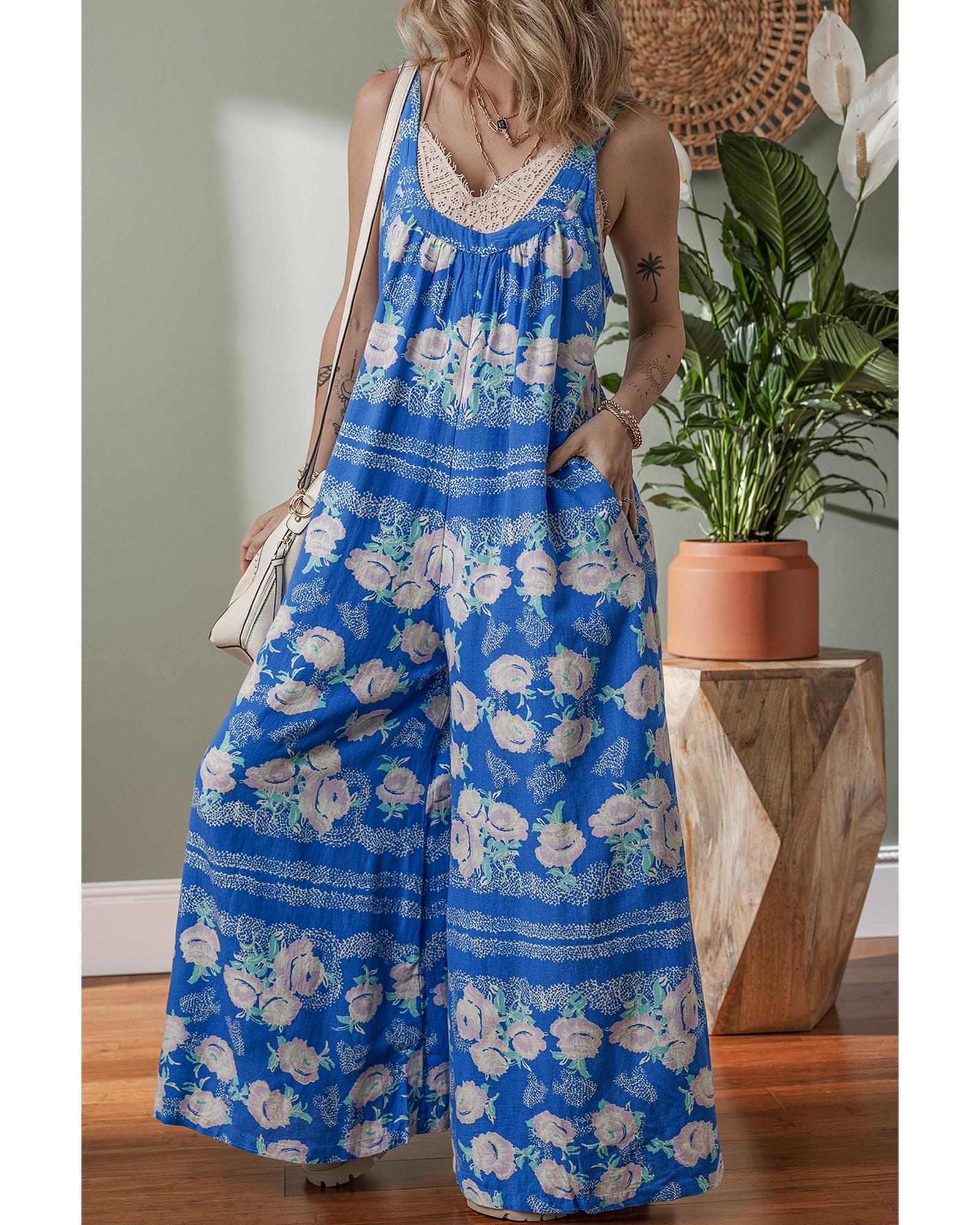 - Blue Floral Print Wide Leg Sleeveless Jumpsuit