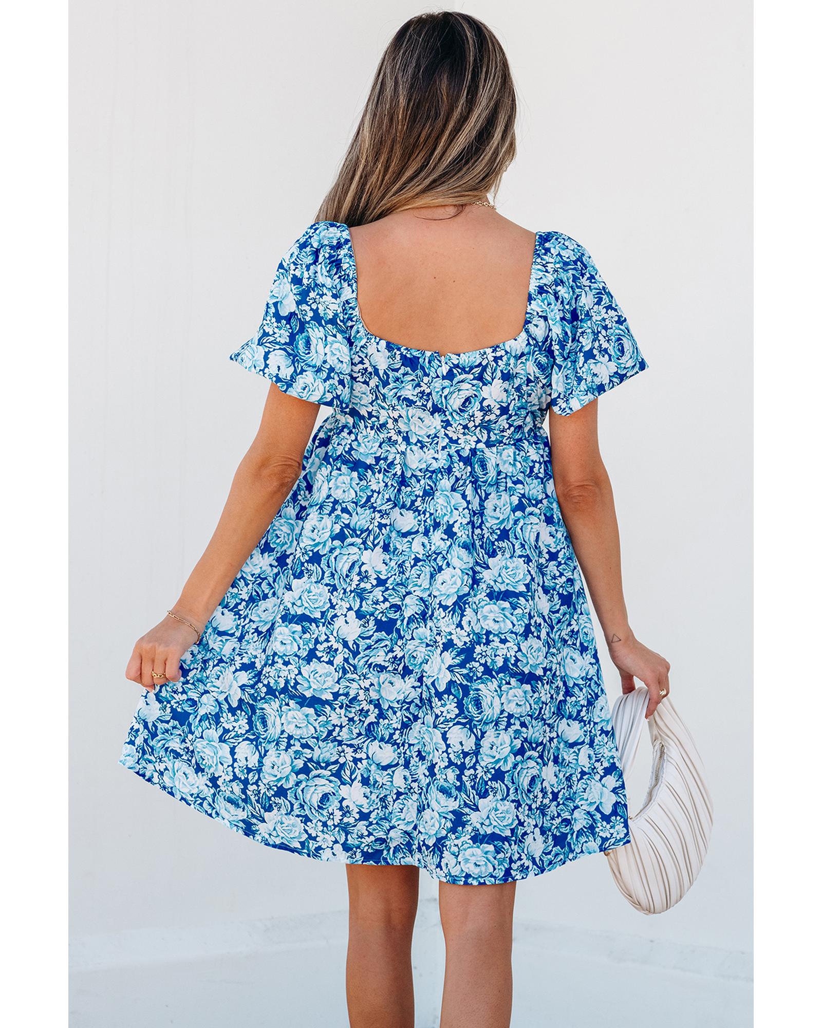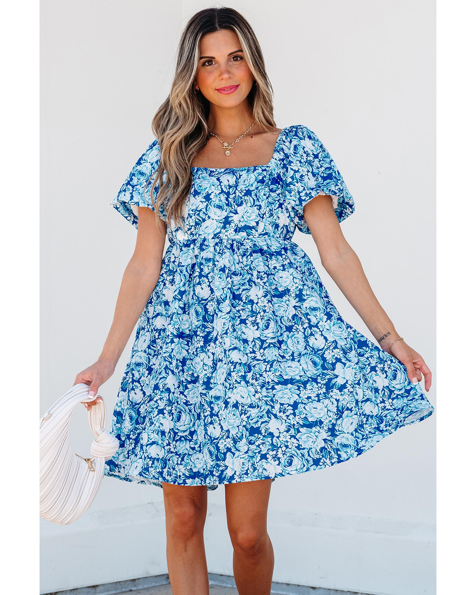 Blue Floral Puff Sleeve Babydoll Mini Dress – S