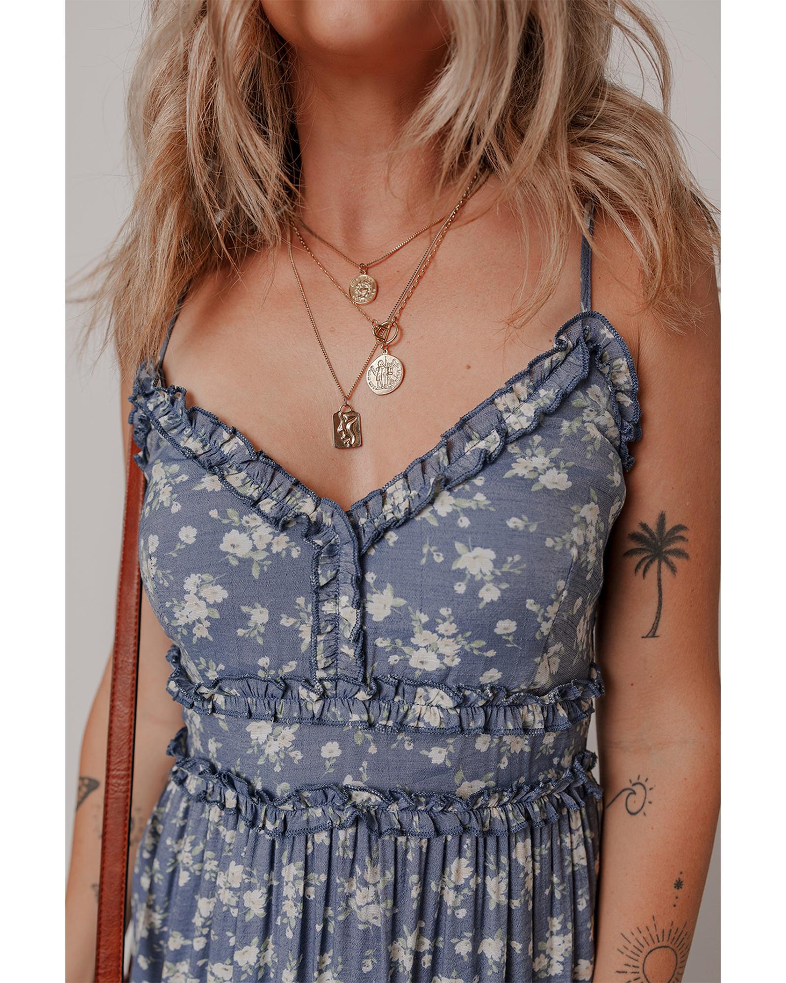 - Blue Floral Spaghetti Strap Frilled V Neck Tiered Midi Dress