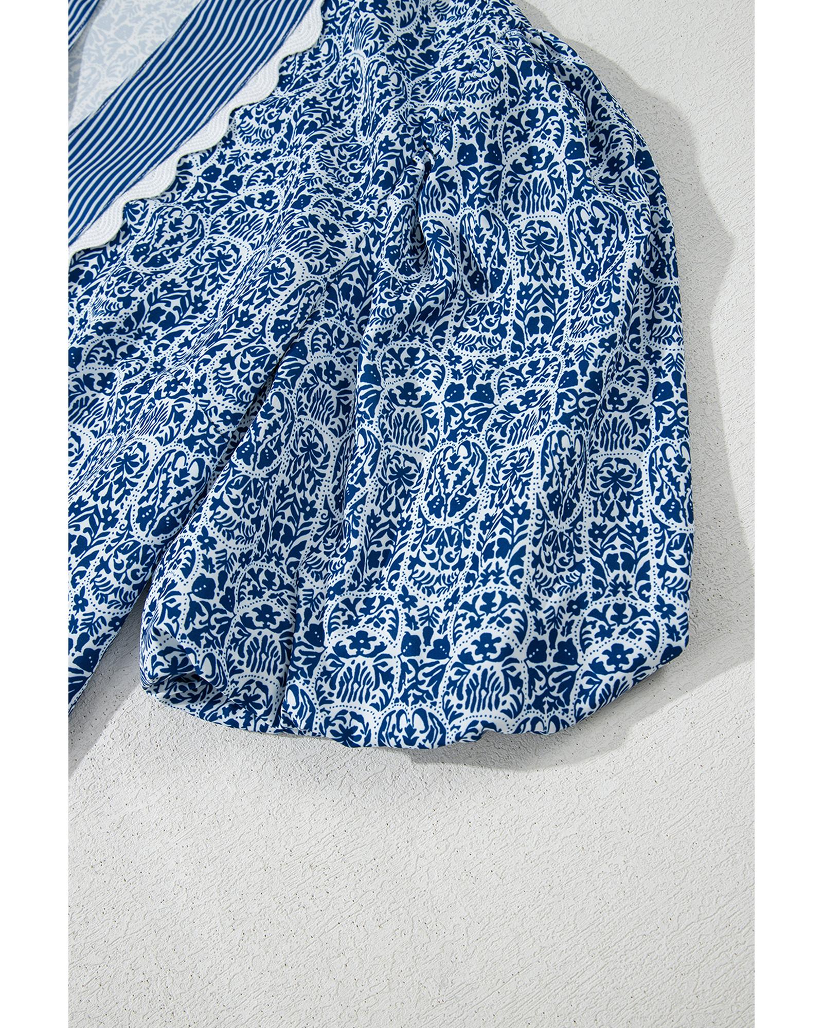 Blue Floral Striped Print Contrast Ric-rac Puff Sleeve Top – S