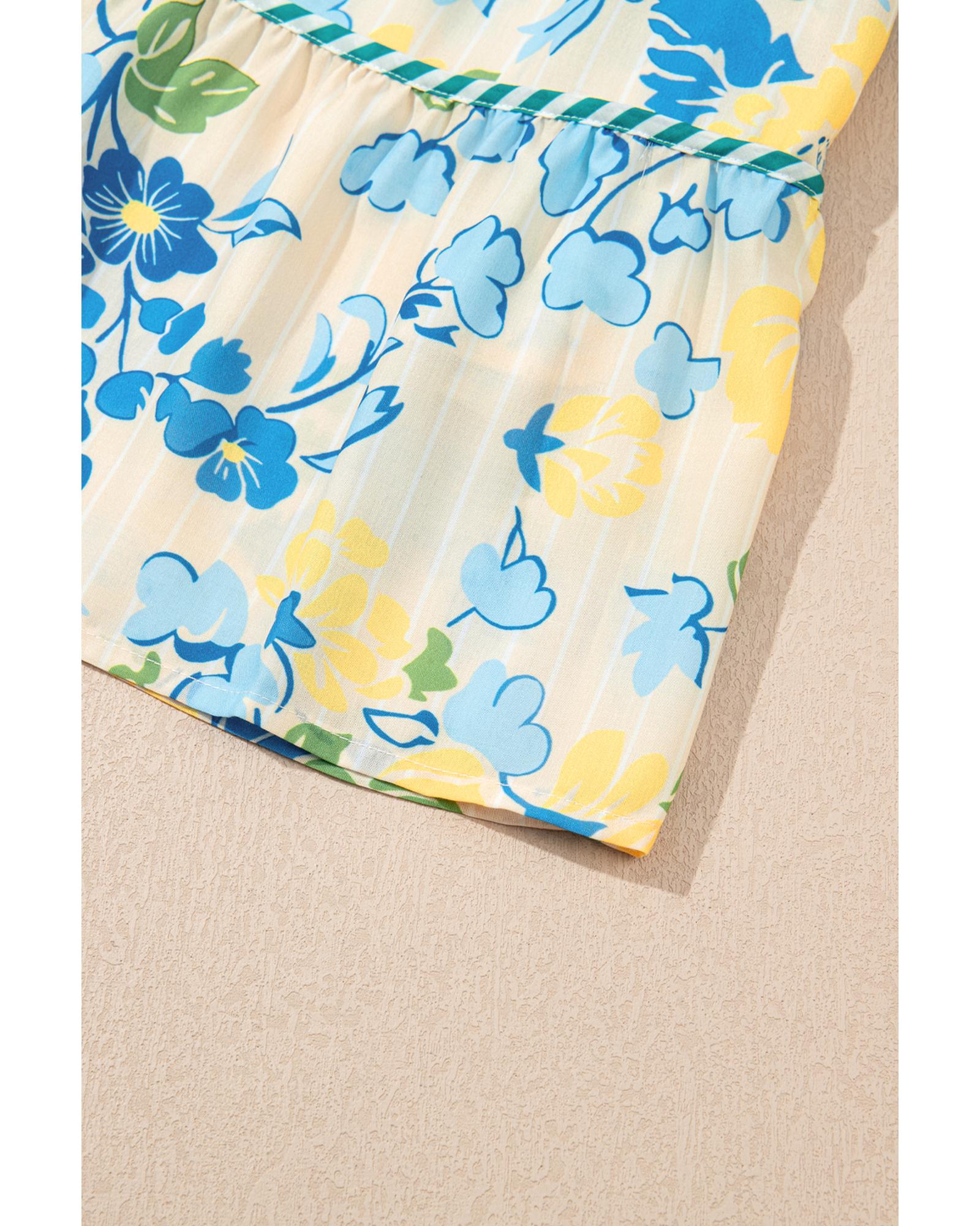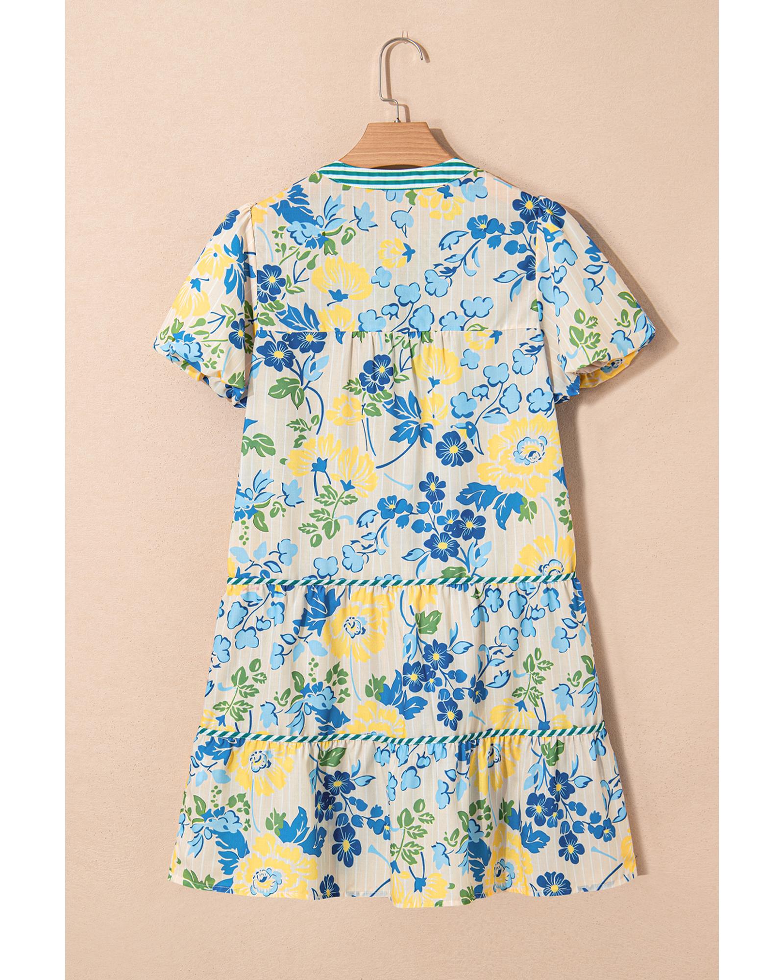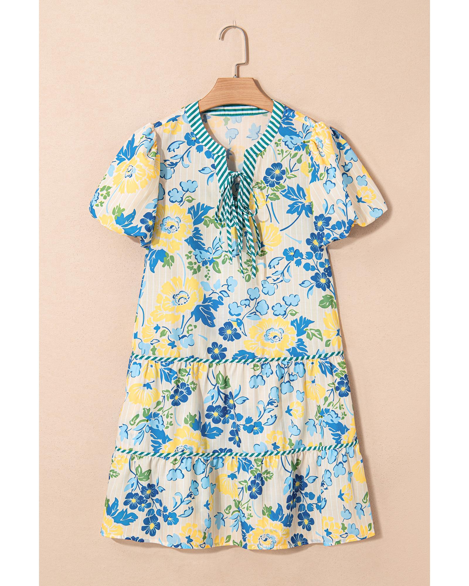 Blue Floral Striped Trim Puff Short Sleeve Dress – XL
