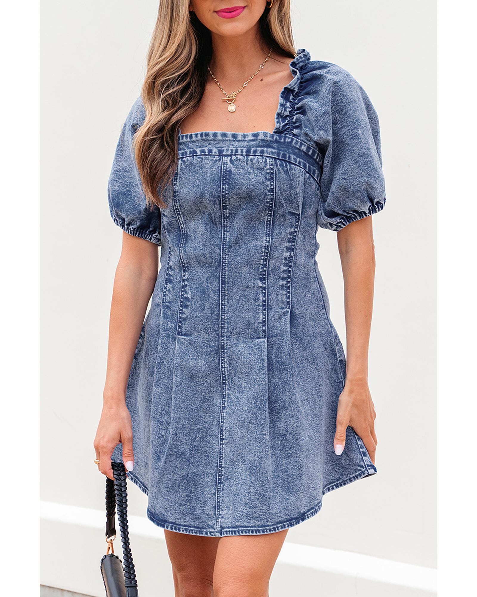 Blue Frilly Square Neck Bustier Puff Sleeve Short Denim Dress – L