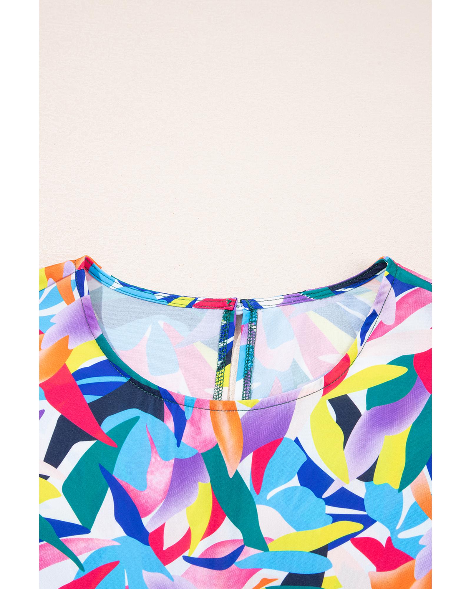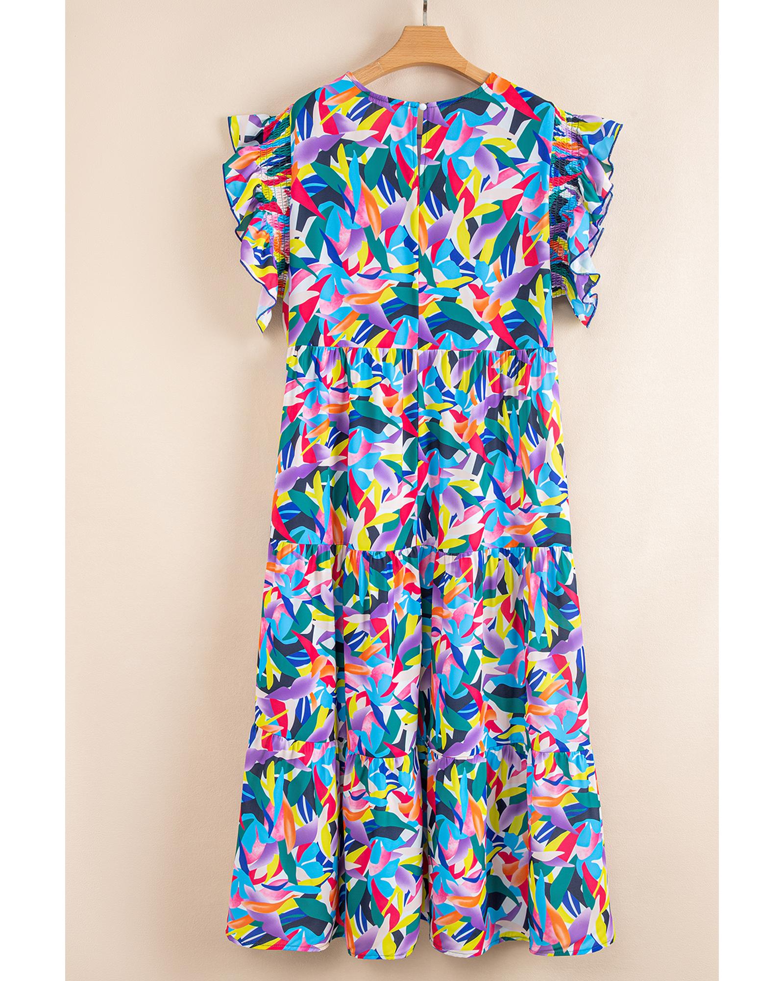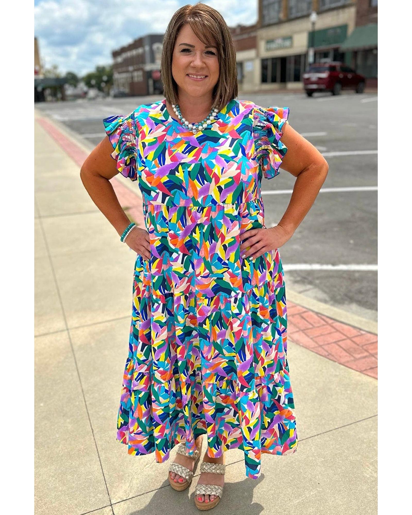 Blue Geometric Print Ruffled Short Sleeve Plus Size Tiered Maxi Dress – 3X