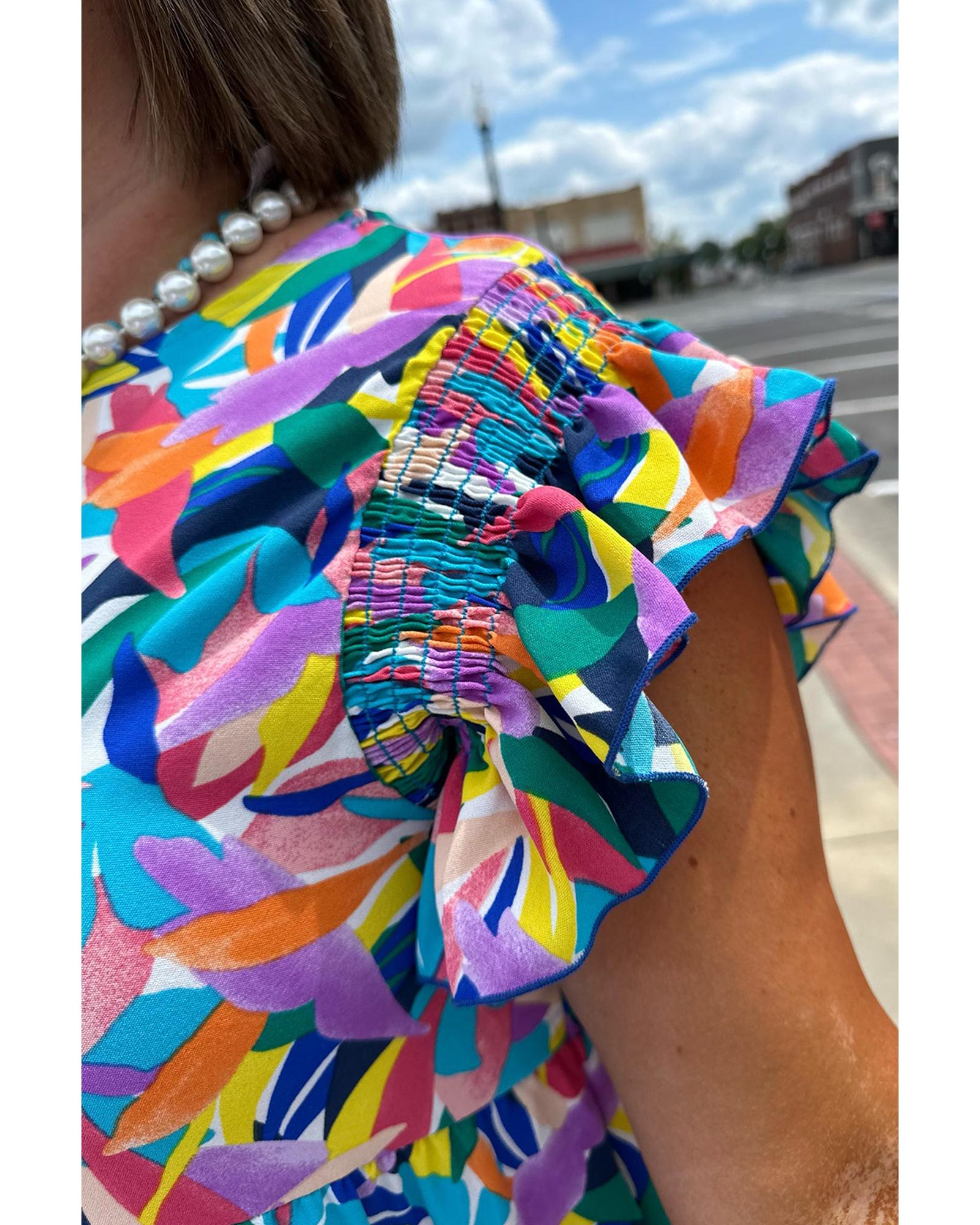 Blue Geometric Print Ruffled Short Sleeve Plus Size Tiered Maxi Dress – 4X