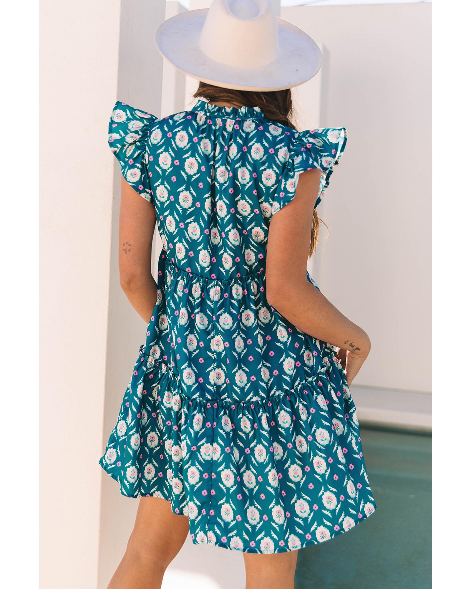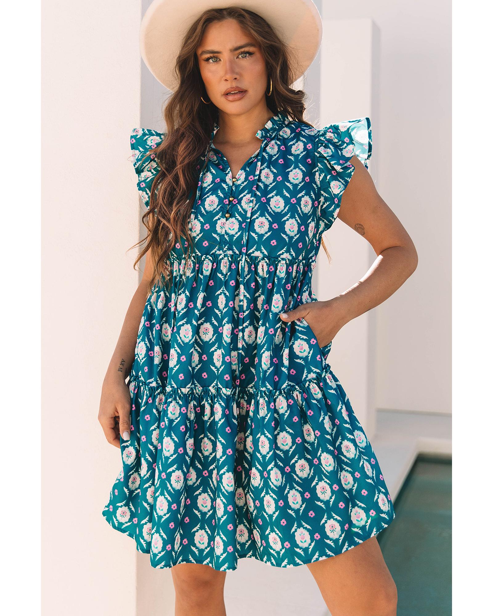 Blue Retro Floral Print Split Neck Ruffle Short Sleeve Dress – S