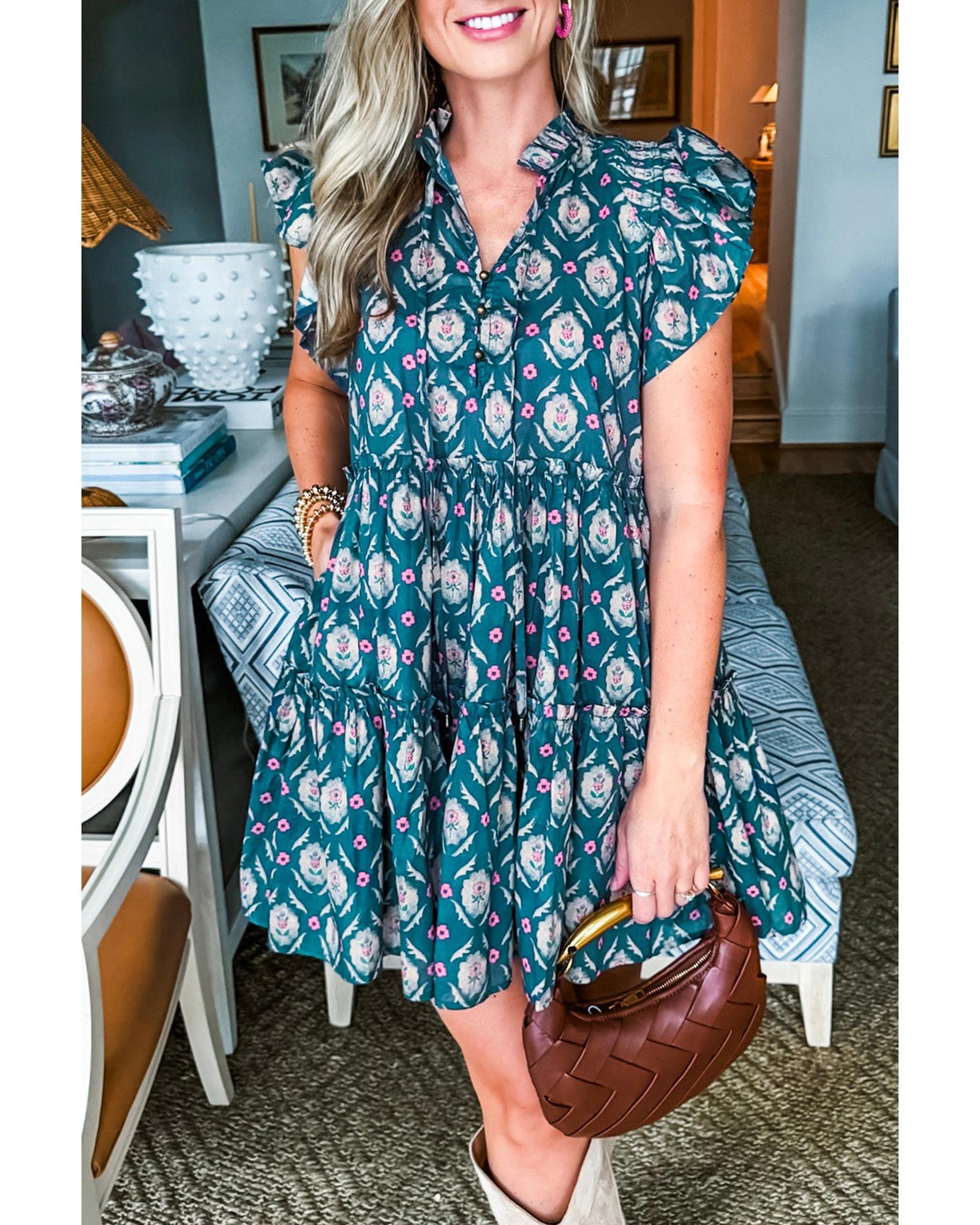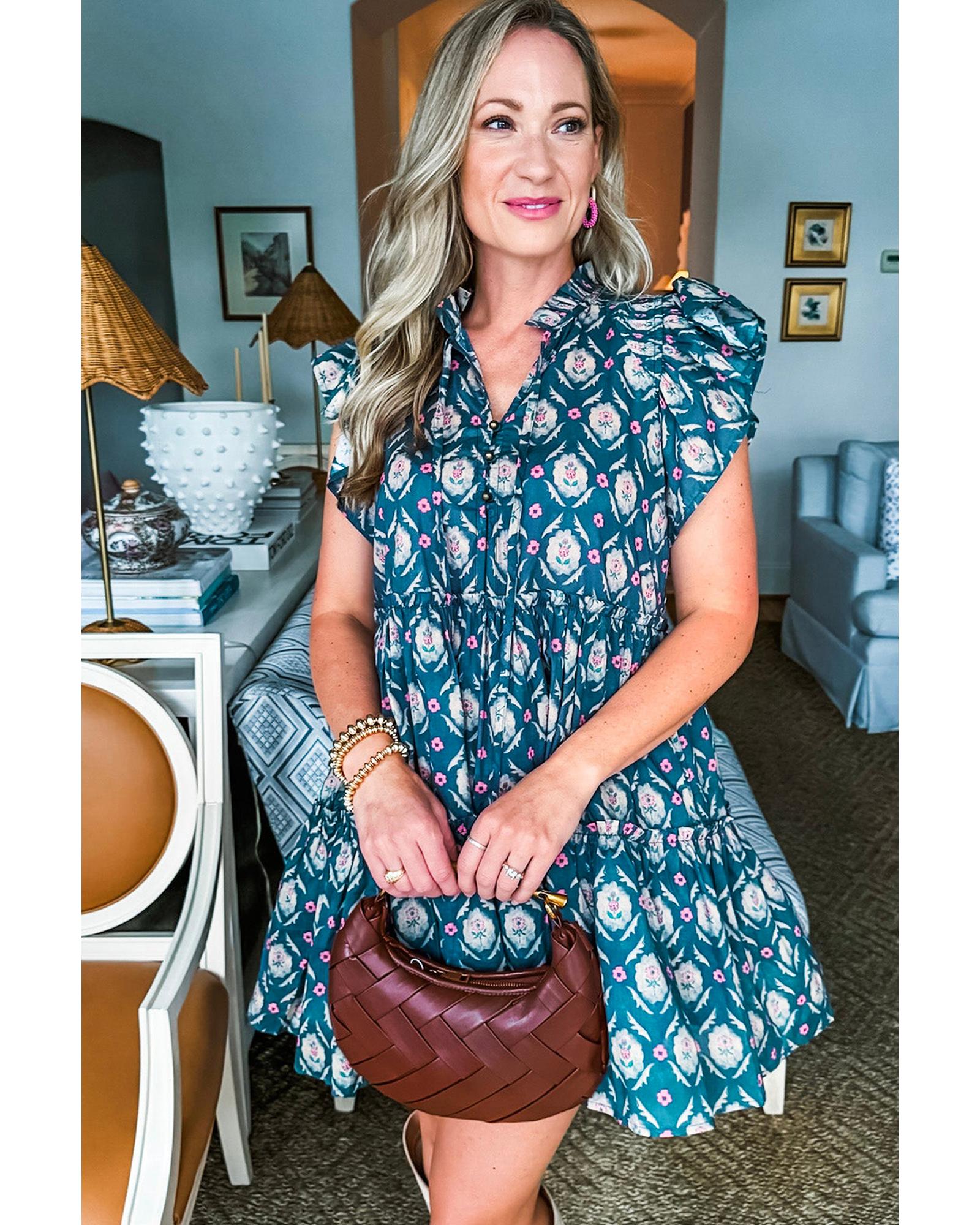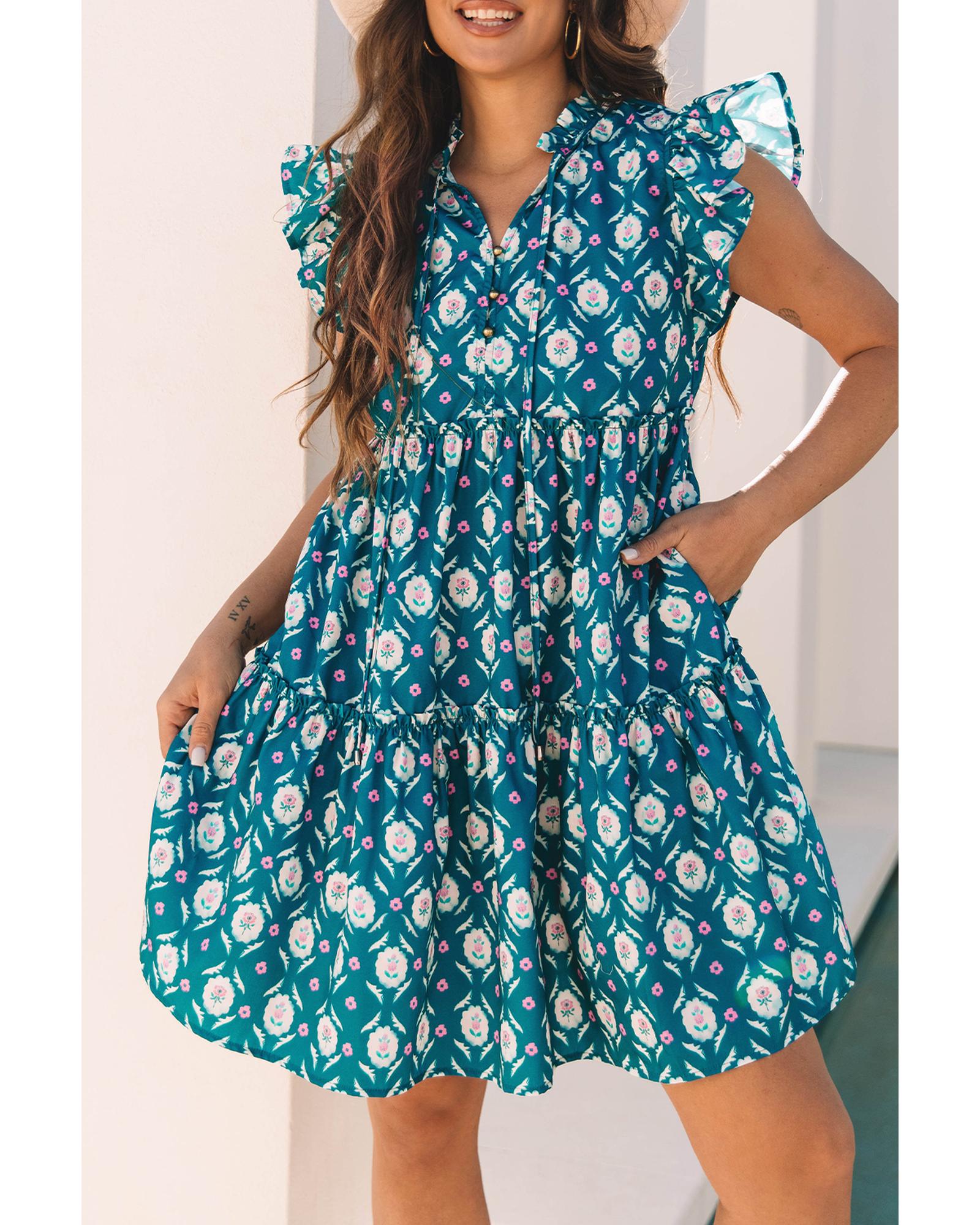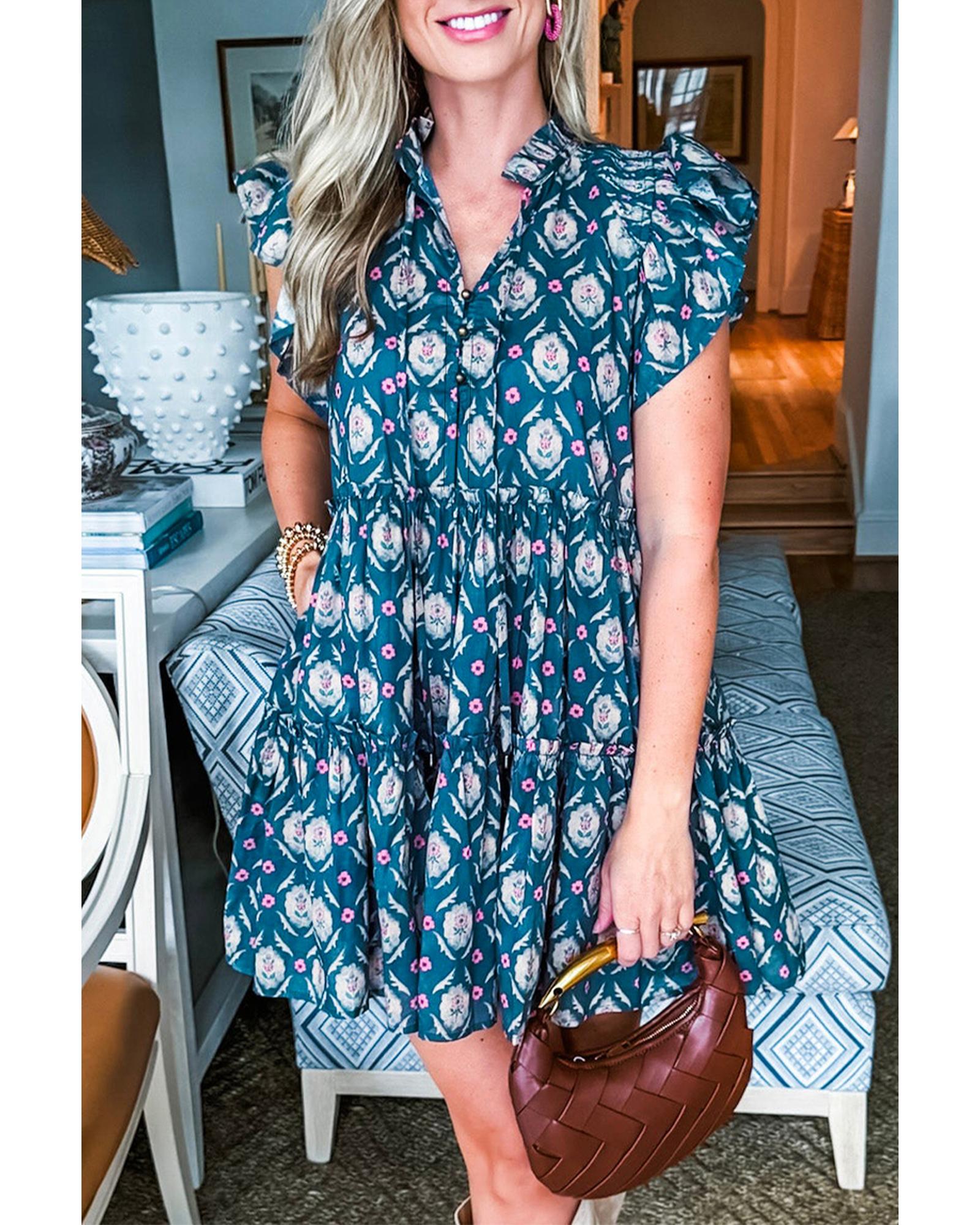 Blue Retro Floral Print Split Neck Ruffle Short Sleeve Dress – XL